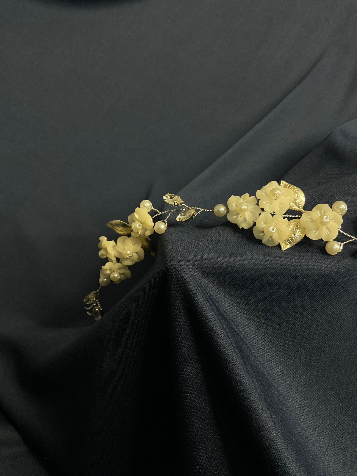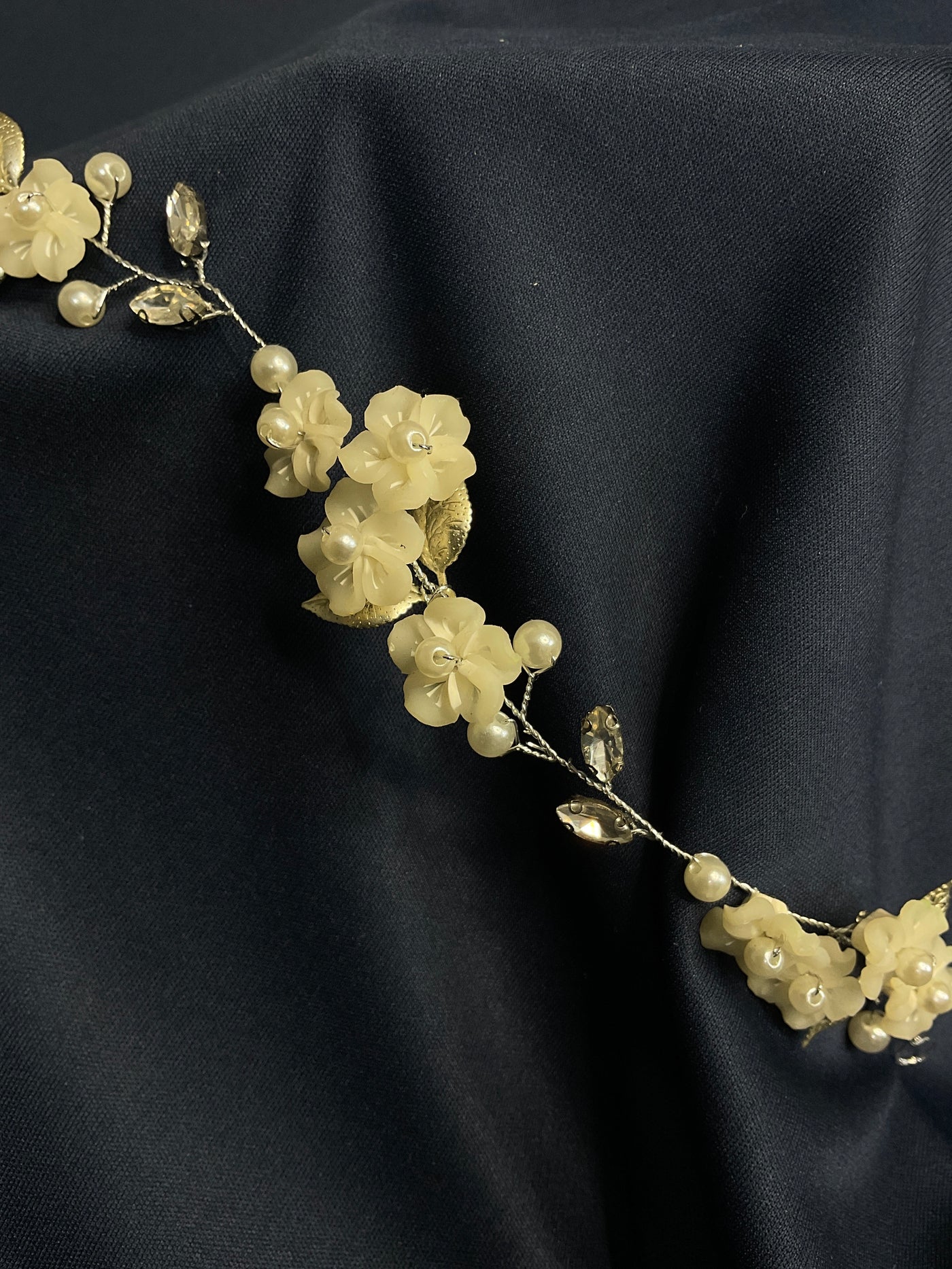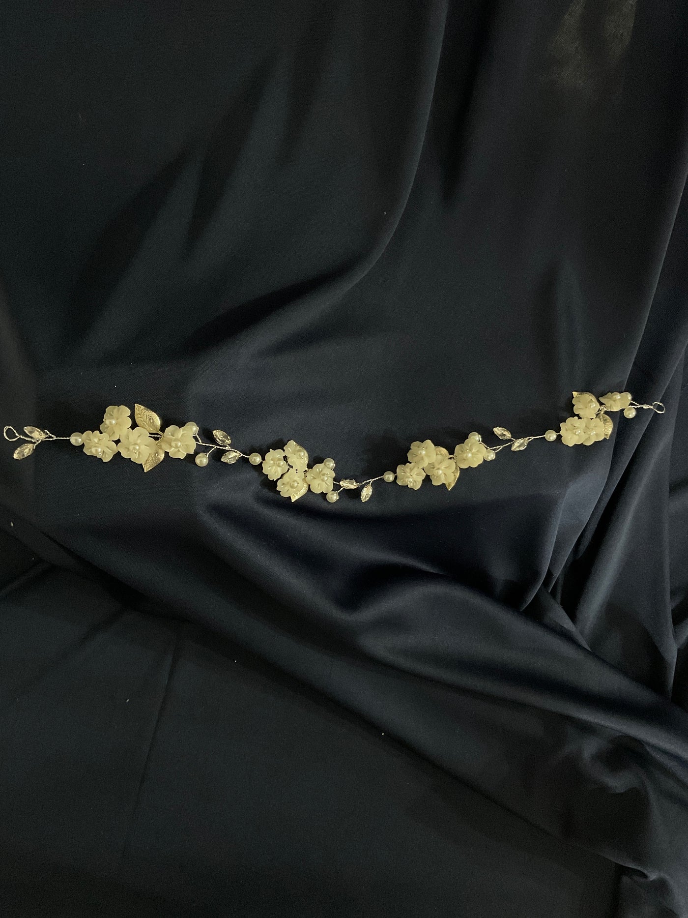 Esta corona flexible de flores blancas, perlas y hojas metalizadas está diseñada para novias que buscan un estilo romántico, ligero y natural. Su estructura delgada y artesanal permite adaptarla con libertad a peinados sueltos, recogidos o semi recogidos, convirtiéndola en el complemento perfecto para bodas civiles, al aire libre o de estilo bohemio. Una pieza etérea y versátil de Daniela Ferrari Brides.💫