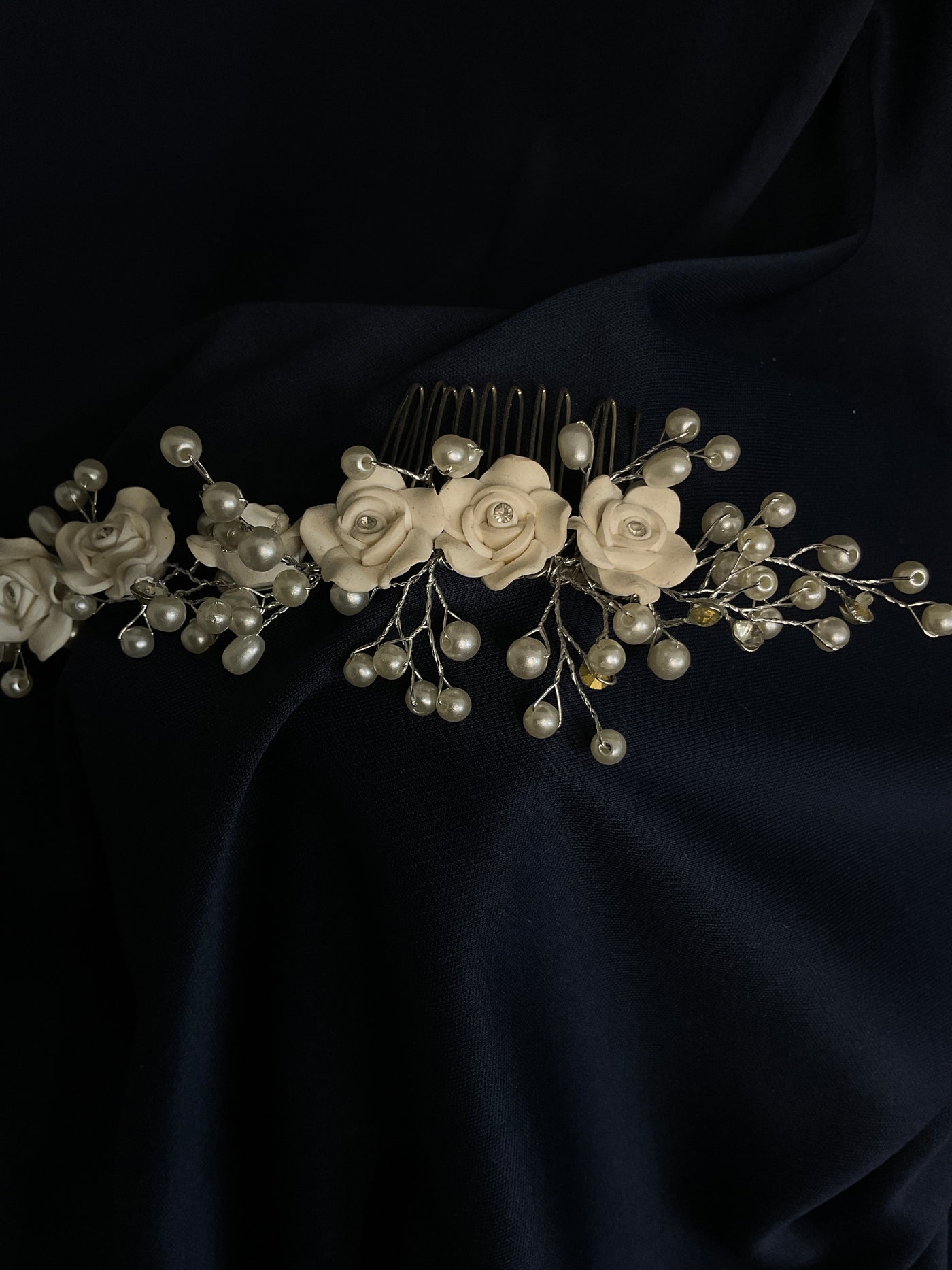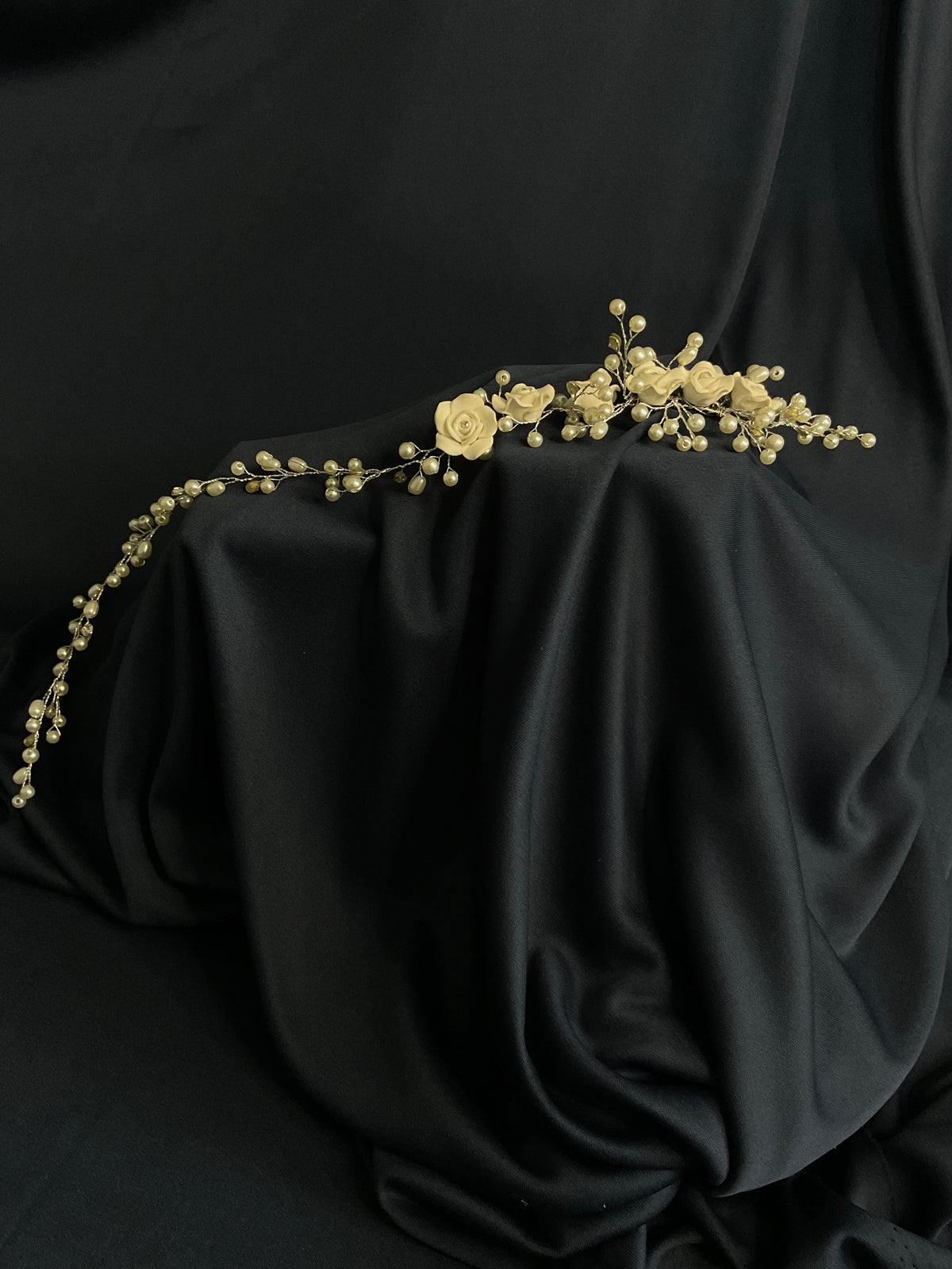 Un tocado floral para novia alambreado con flores de color marfil y delicadas ramas de perlas. Este tocado hecho a mano para boda es perfecto para la novia que busca un look delicado y etéreo en su gran día. Su elaboración artesanal garantiza un acabado único y, gracias a su diseño flexible en alambre, el tocado ofrece gran versatilidad para distintos peinados – desde recogidos clásicos hasta trenzas bohemias o el pelo suelto sin perder su estética romántica. Tocado Gardenia destaca entre los accesorios románticos para peinado de novia por su elegancia atemporal y detalles perlados. Es un imprescindible entre los accesorios de boda con perlas.