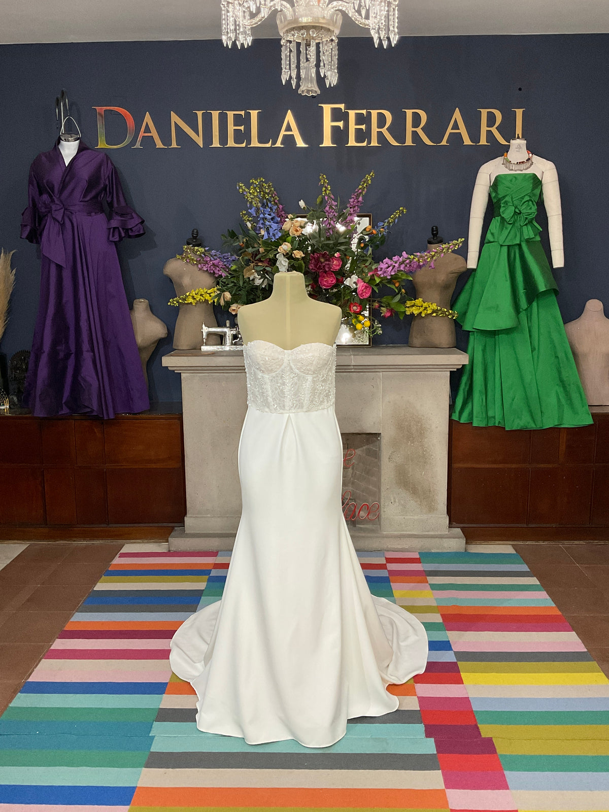 Un vestido etéreo que evoca la delicadeza de la naturaleza. Este diseño presenta un escote corazón pronunciado con estructura interna, ideal para novias modernas que desean un toque sensual con sofisticación. El tul bordado con motivos florales en caída vertical estiliza la figura y crea un efecto visual de ensueño.