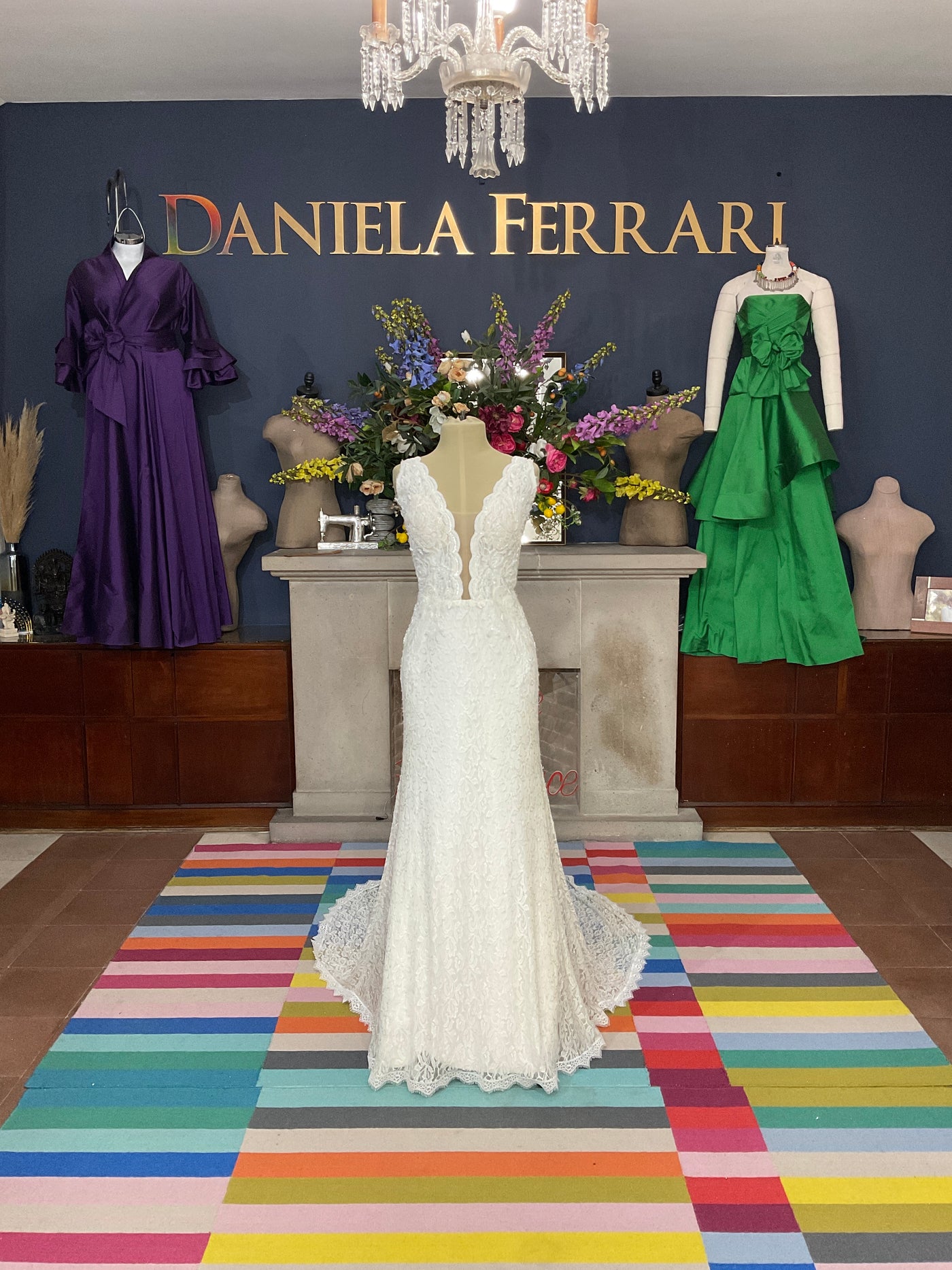 El diseño sin mangas y la caída fluida lo convierten en una opción perfecta para bodas en jardín, playa o ceremonia íntima, sin sacrificar el impacto visual. Cada detalle del encaje ha sido bordado cuidadosamente en nuestro atelier, ofreciendo una pieza atemporal con alma artesanal.✨