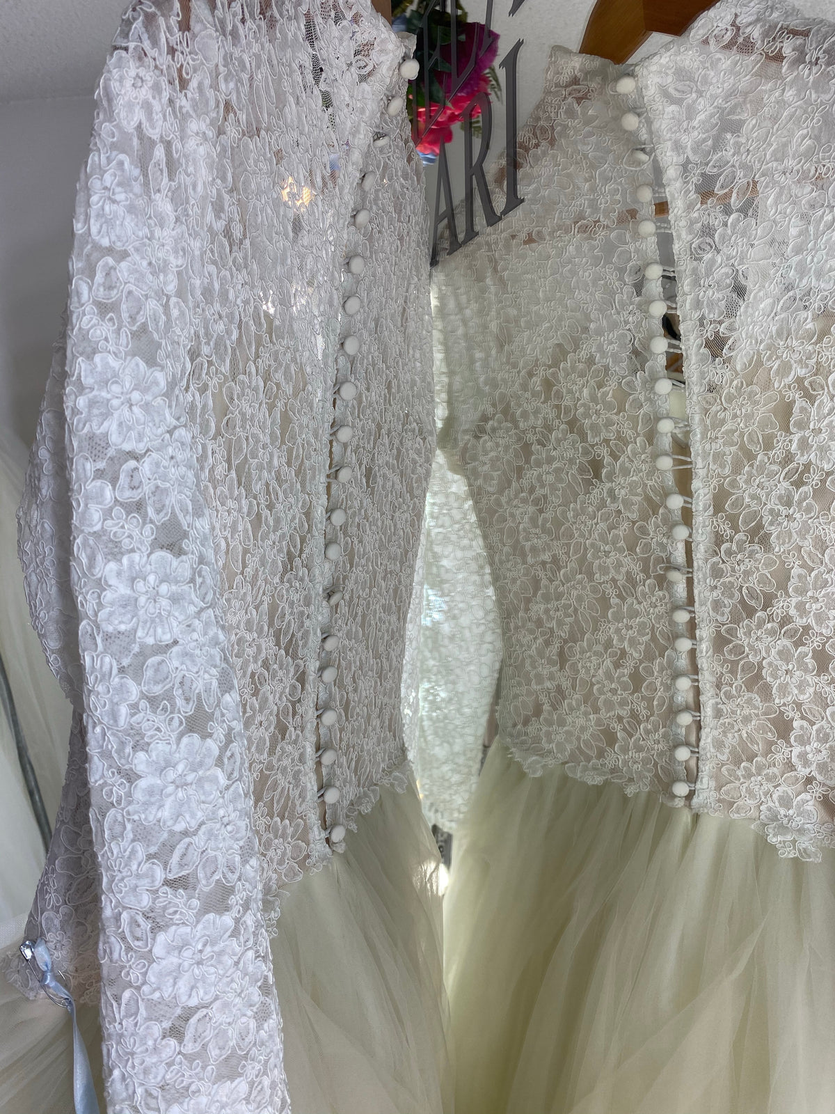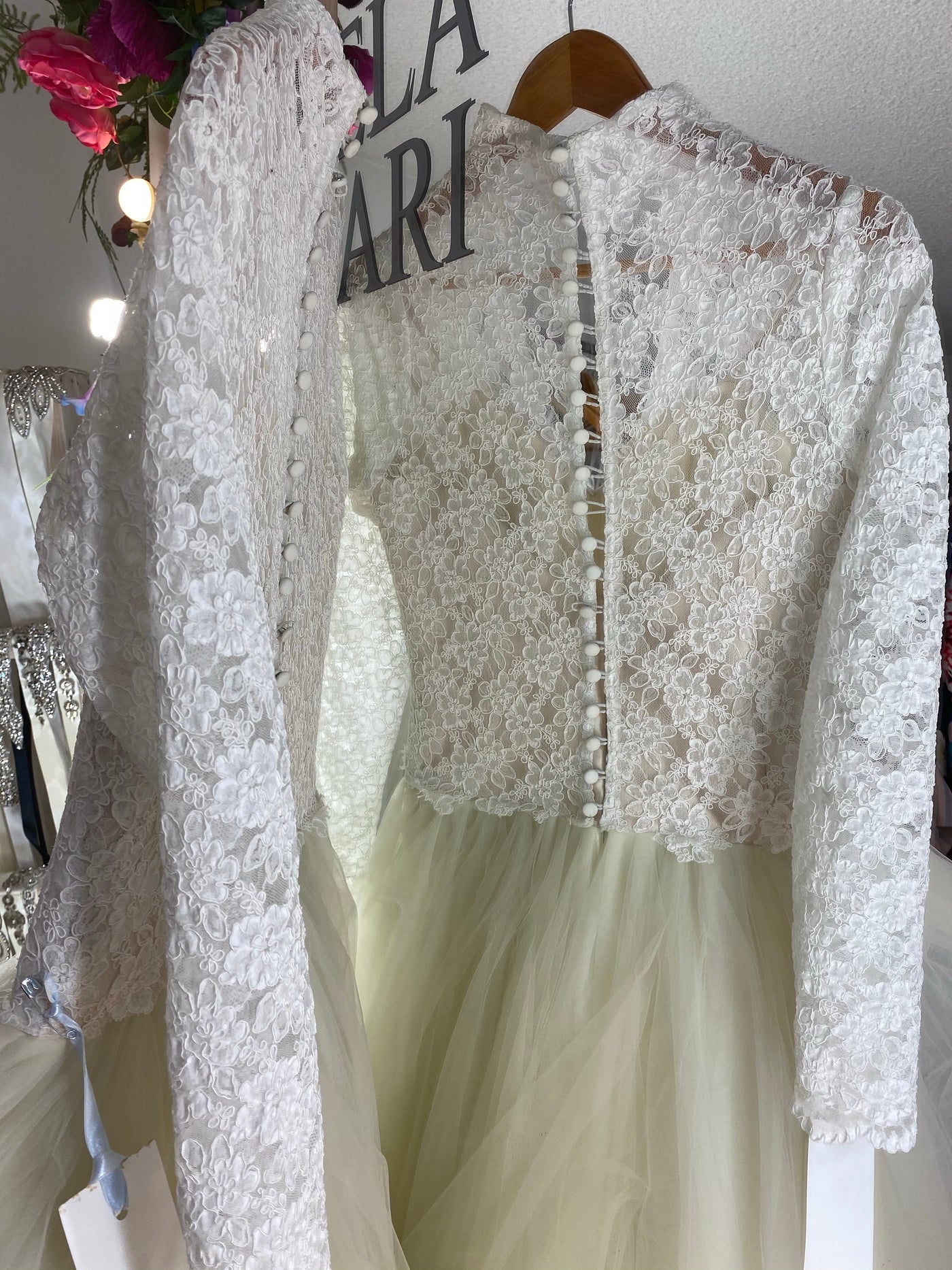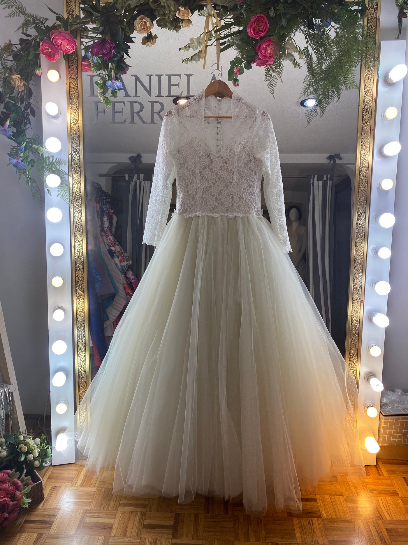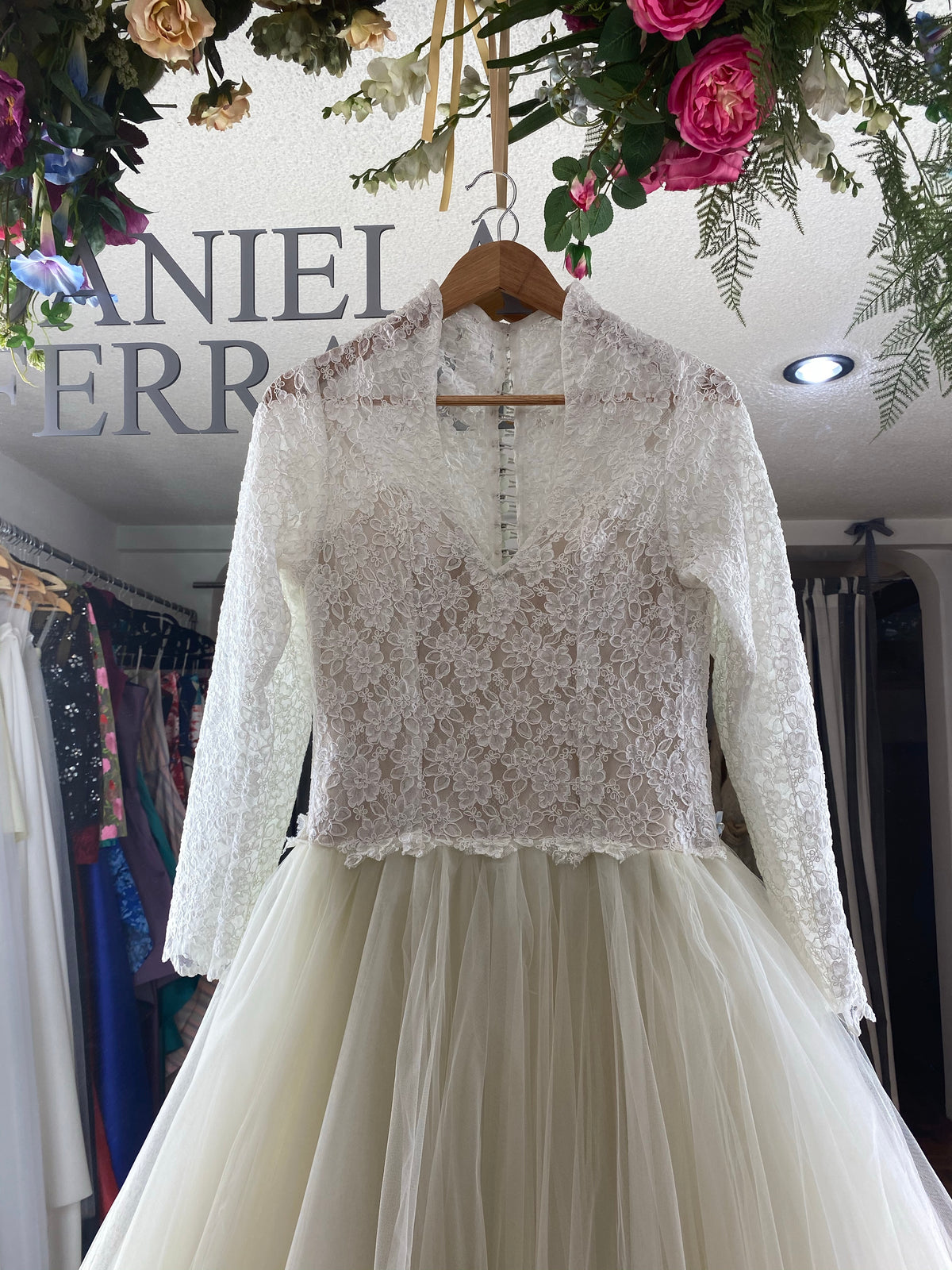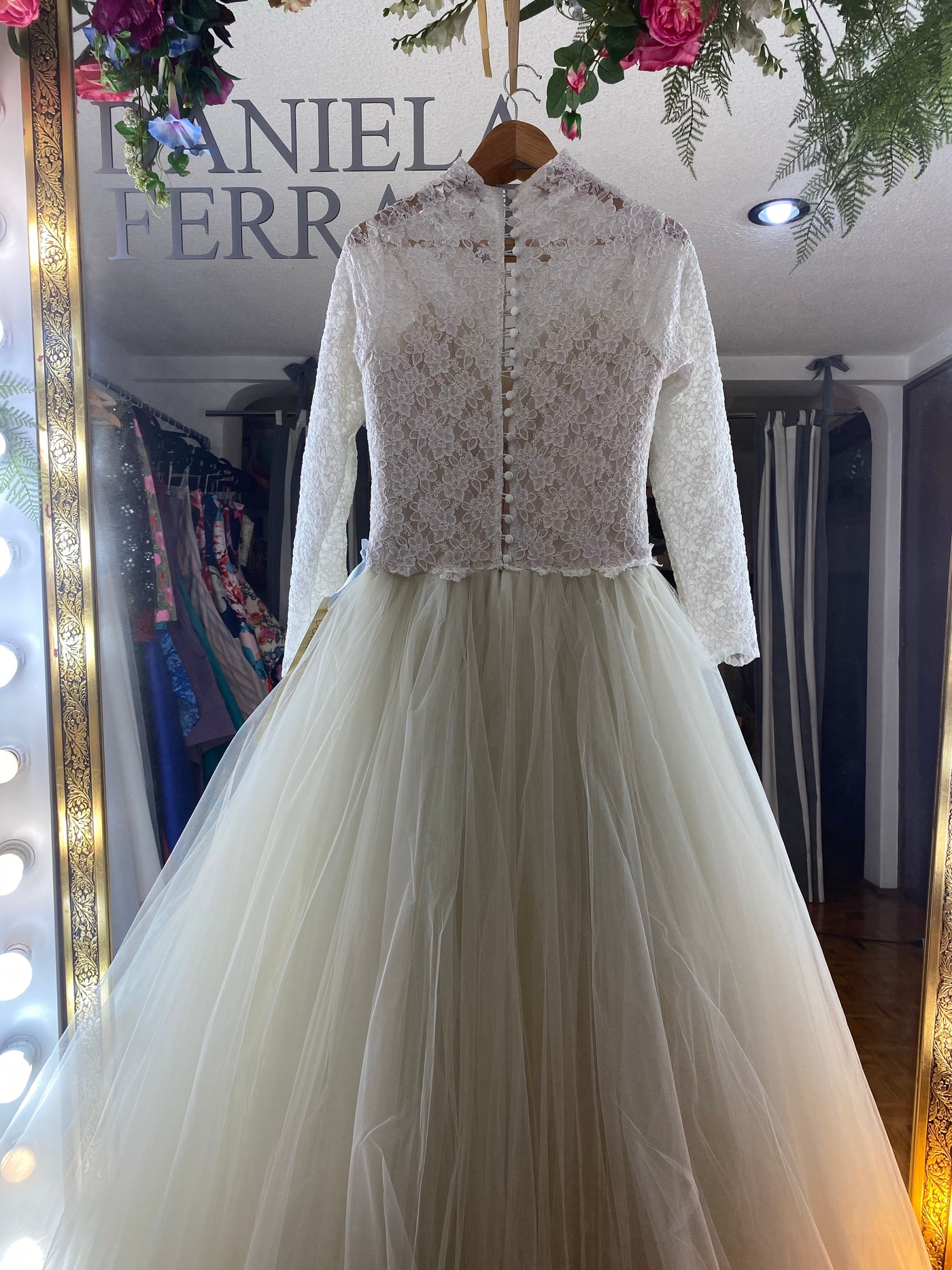 Este vestido inspirado en el vestido de mi abuela y algunas lo verán como referencia del cuello de Grace Kelly o Kate Middleton 😜 para vestirte de reina! Falda de tulle con el talle con el cuello y escote en encaje chantilly de soutage. Este encaje es un encaje rígido para que el cuello horme perfecto. El cinturón y un Velazco de tulle de seda con tu ramo de Lilly of The Valley 👸🏻 .