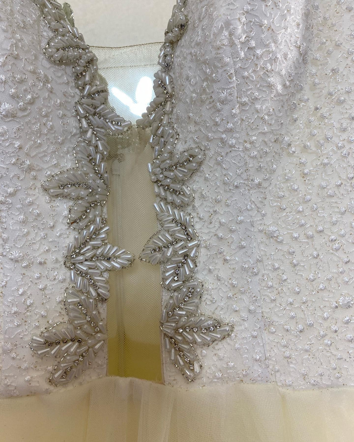 el bordado esta puesto a mano, con terminado de botones en la espalda una vez que tenga tu medida exacta