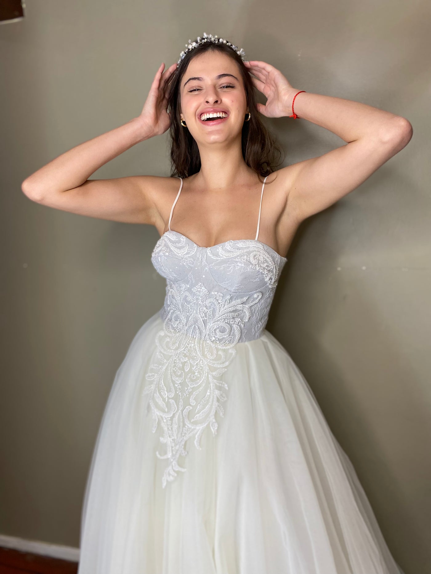 El tacto seda de la falda de tulle italiano y las aplicaciones con Chaquira Suiza lo hacen un vestido elegantísimo, ligero y con cauda larga para darle ese toque especial pero muy etéreo