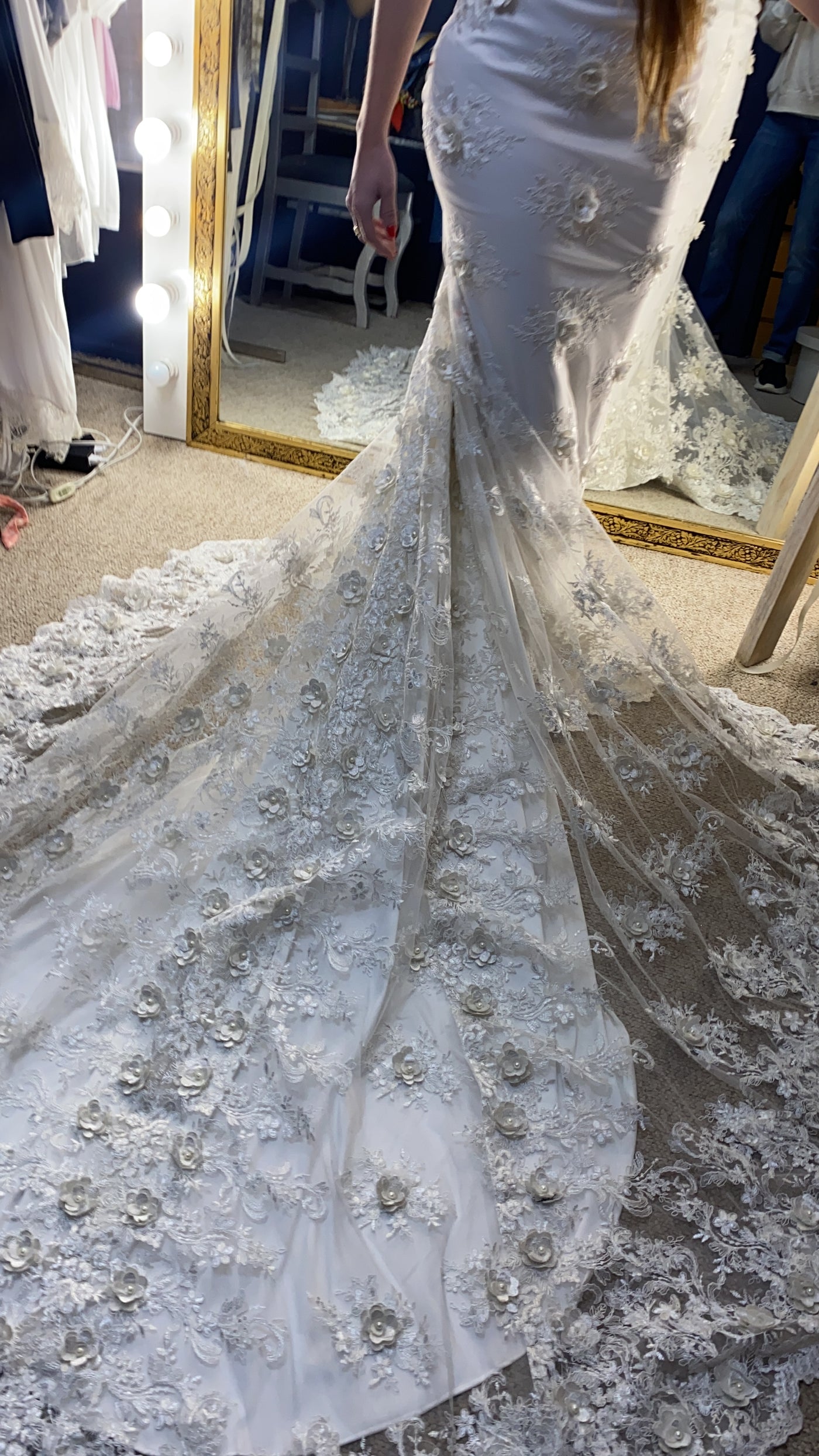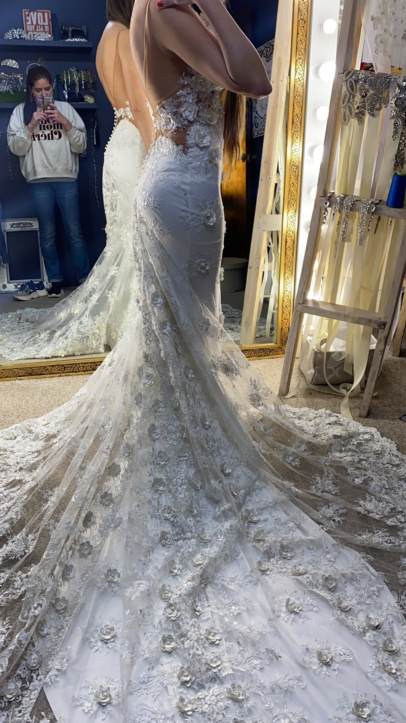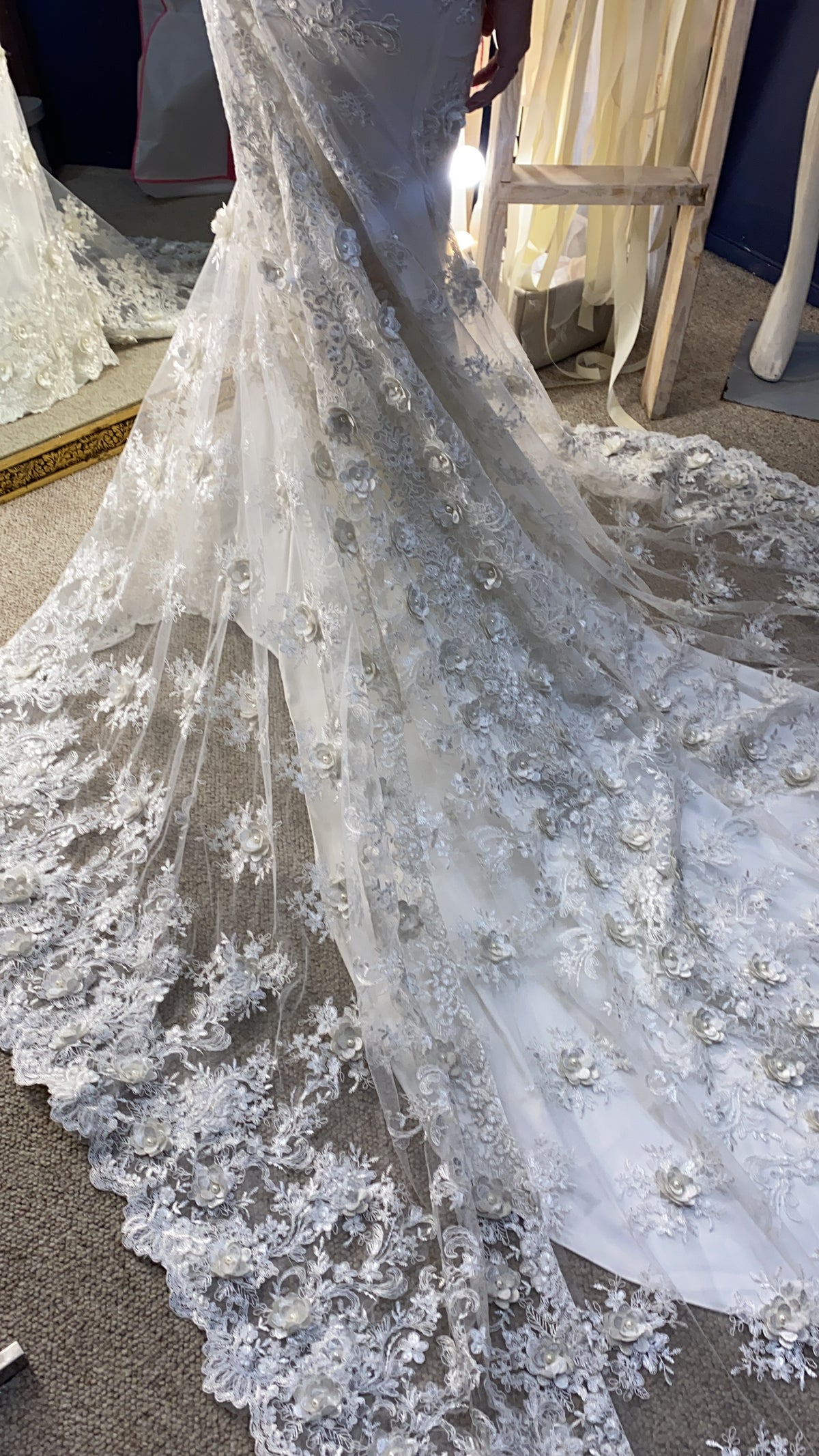 lleva forro de crepe de seda para el fin de curvear pompa y dar bolsa, con el encaje suelto en la causa para darle esa forma tan especial.
