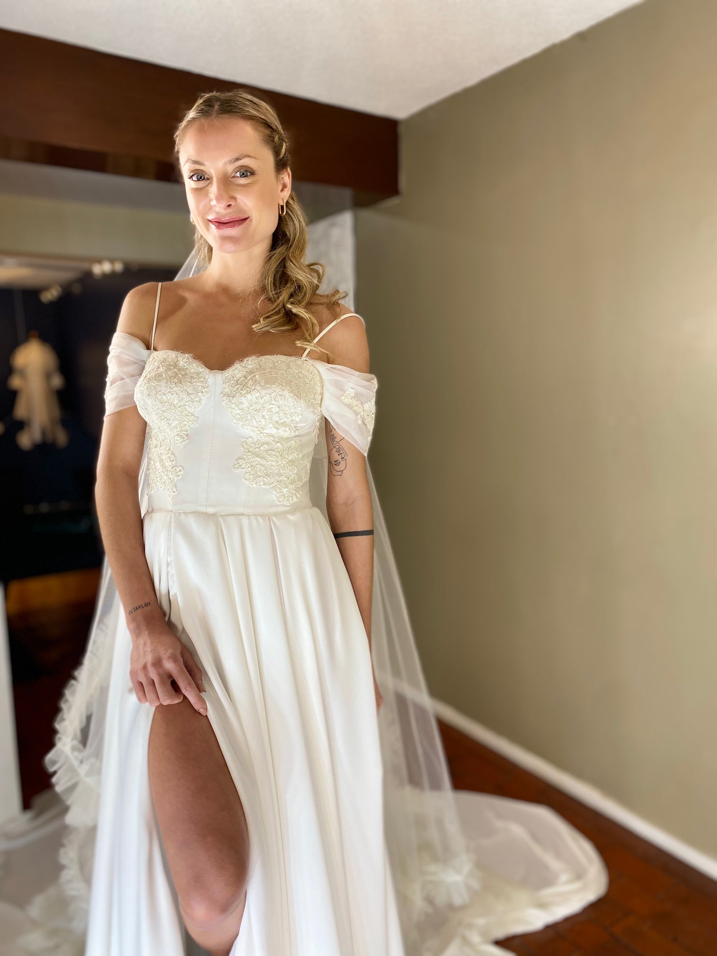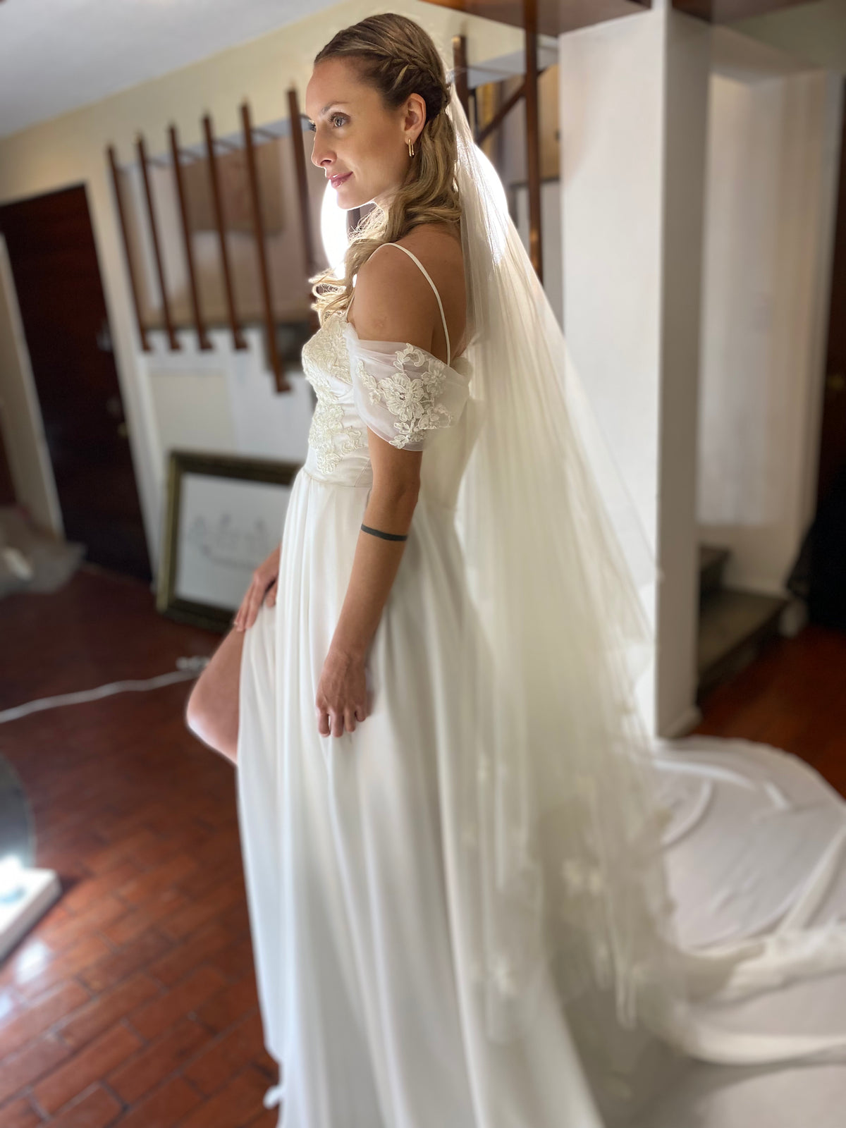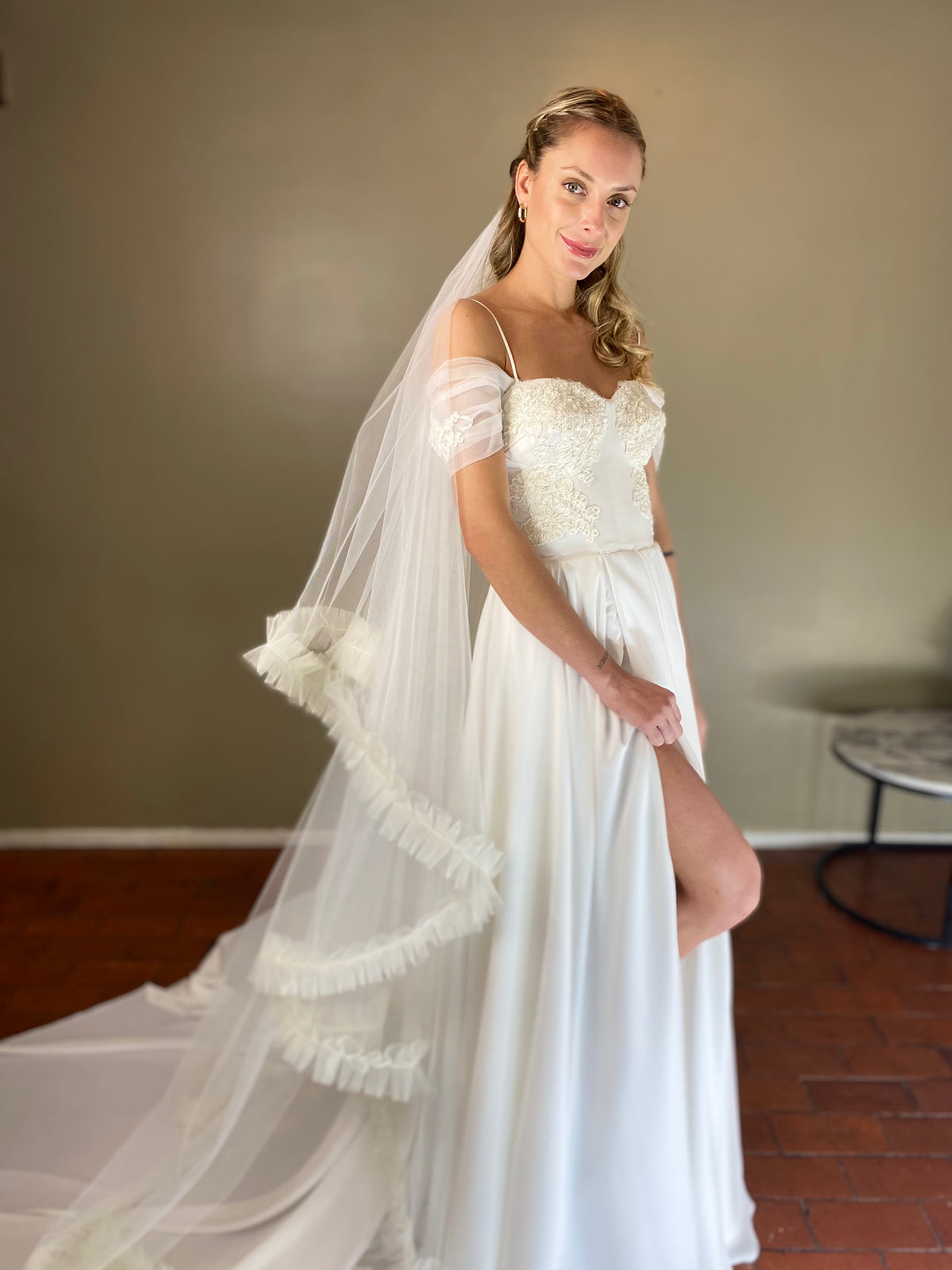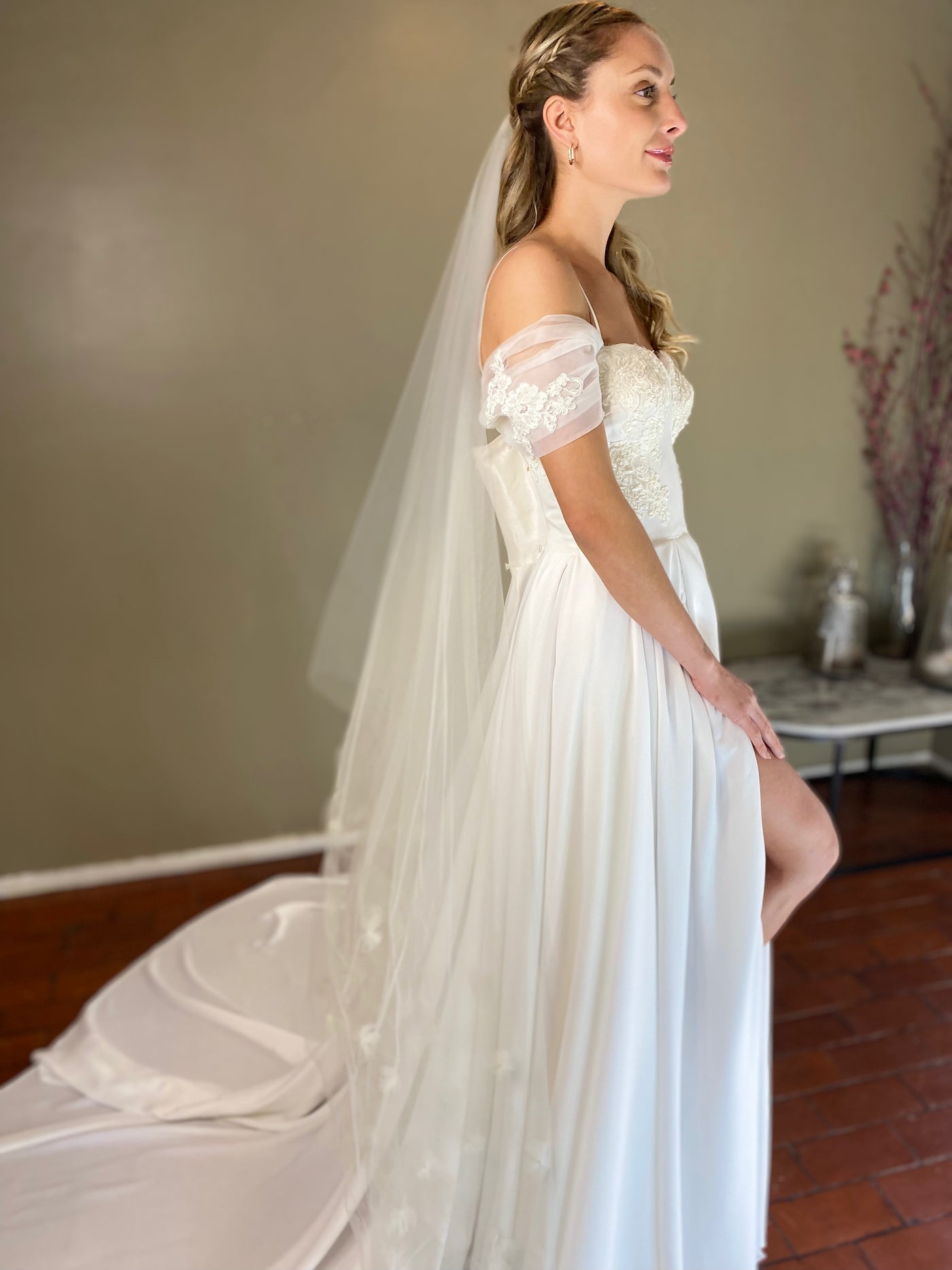 Talle de corset lencería en tafeta stretch con bordado de encaje chantilly y mangas de tulle italiano con bordados de encaje chantilly la falda es espectacular con cauda extra larga y abertura de pierna en crepé de seda