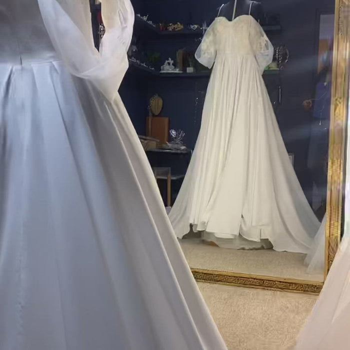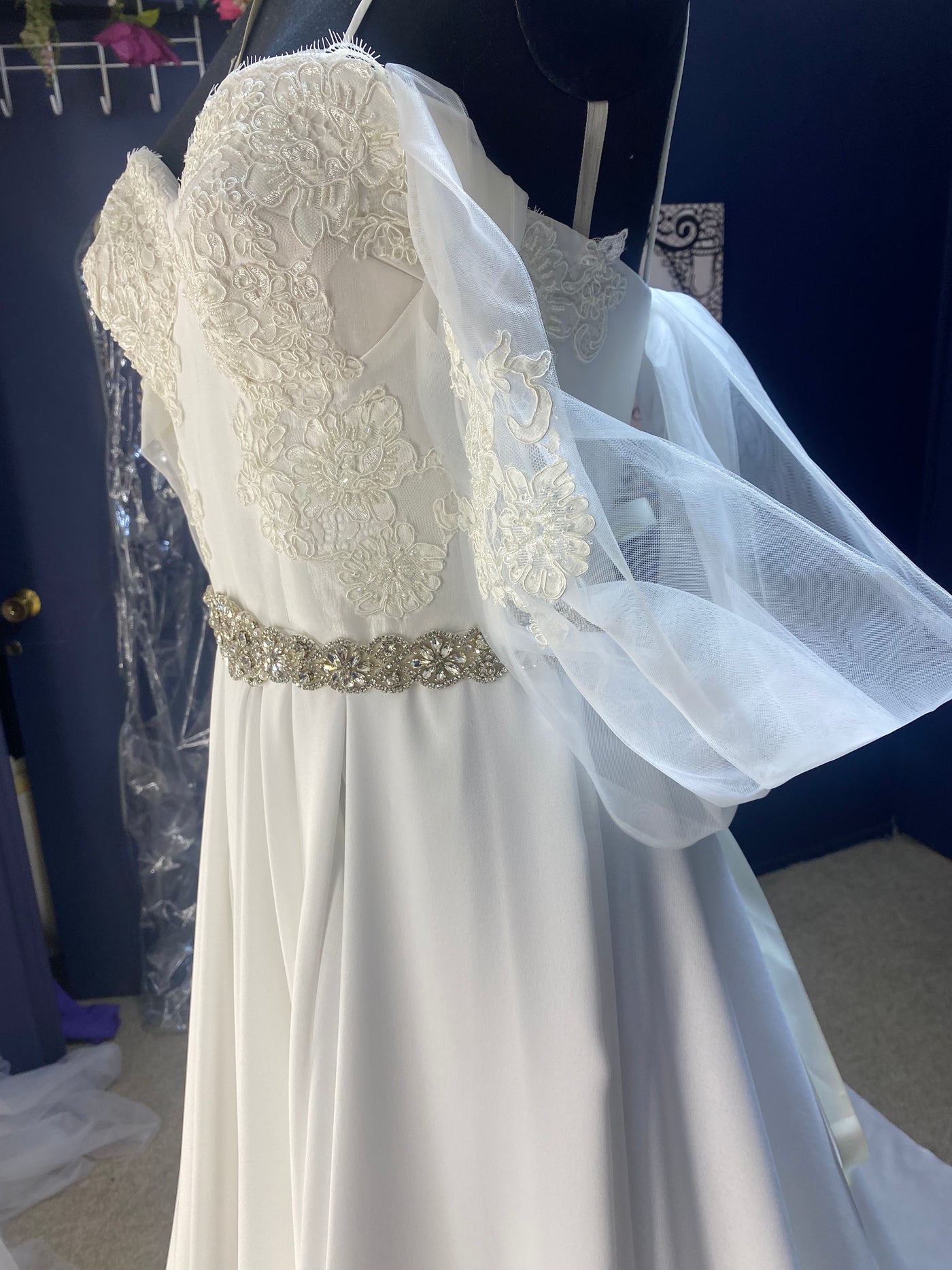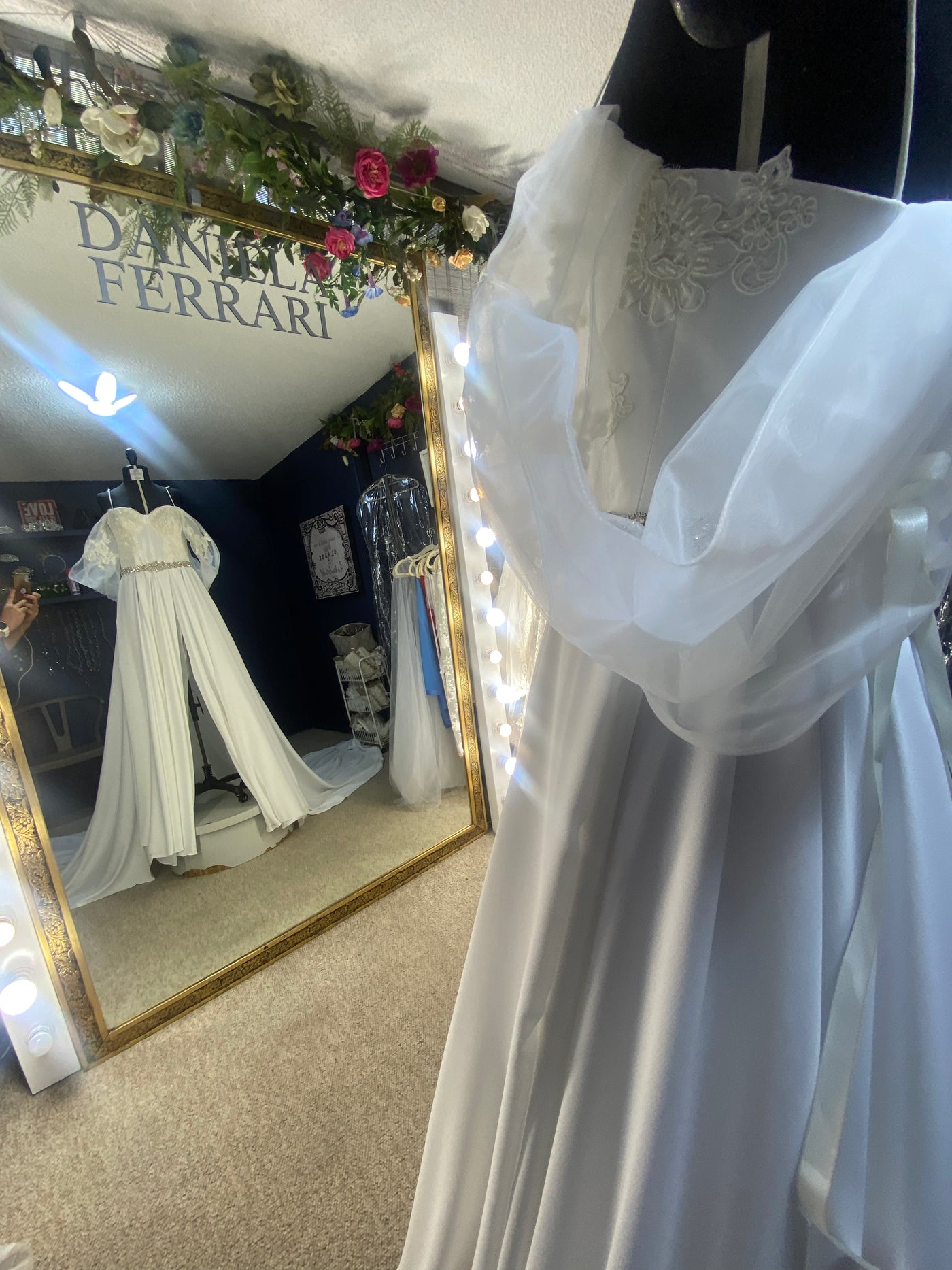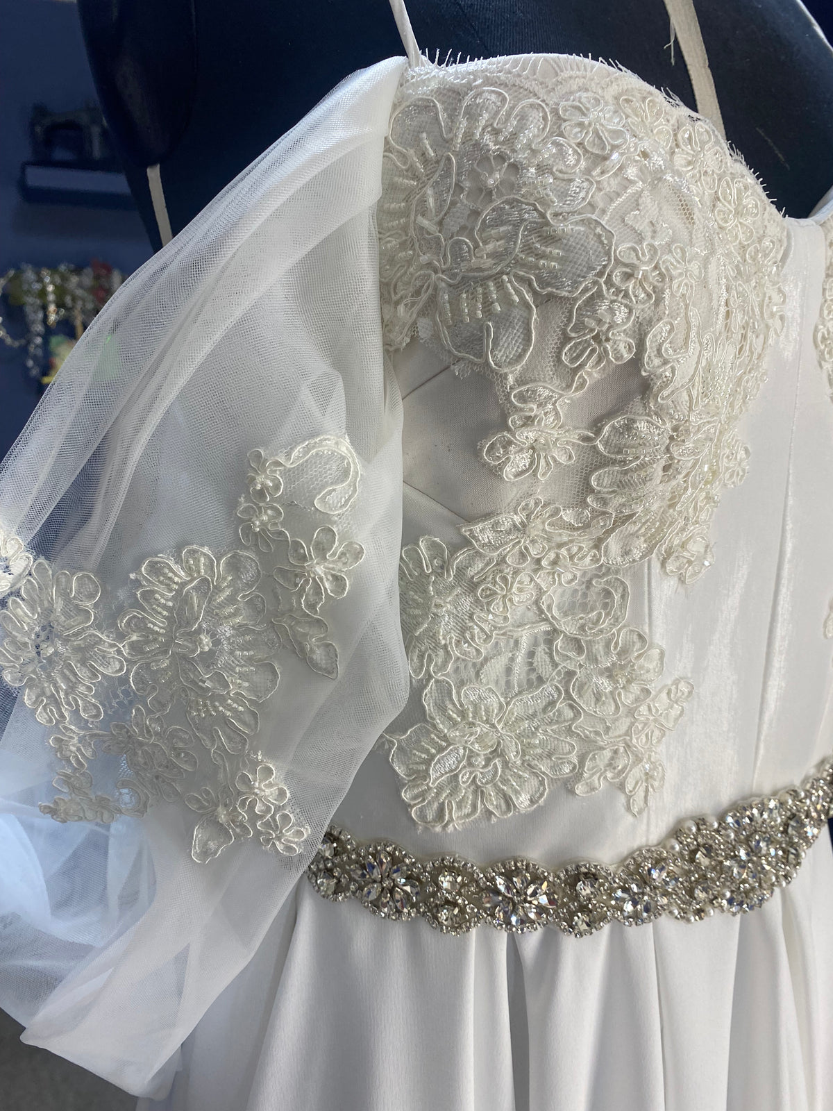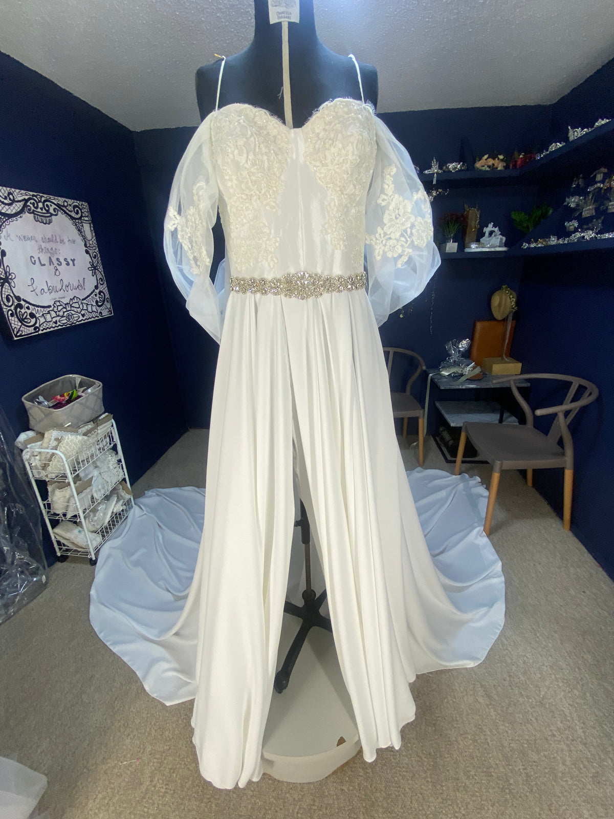 Talle de corset lencería en tafeta stretch con bordado de encaje chantilly y mangas de tulle italiano con bordados de encaje chantilly la falda es espectacular con cauda extra larga y abertura de pierna en crepé de seda
