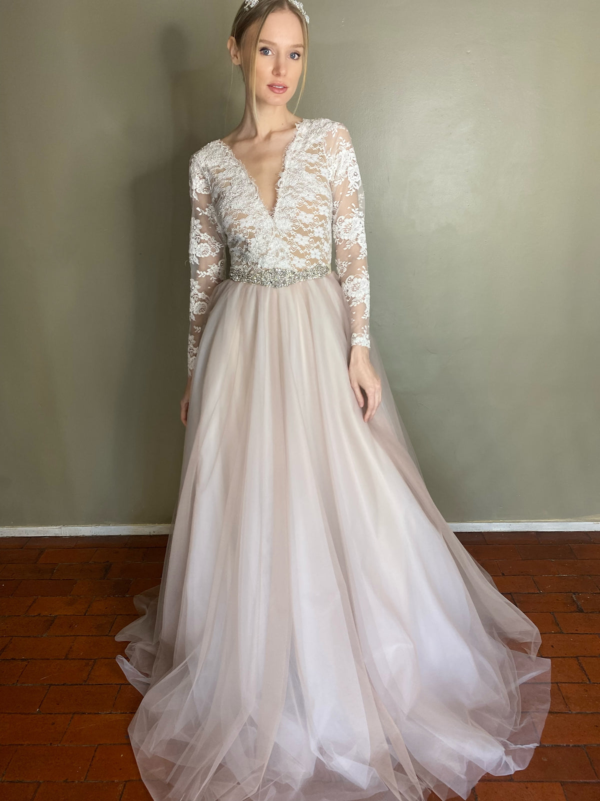 El vestido de novia LALITHA lleva talle de encaje chantilly francés con terminado central de bordados de blonda con lentejuela.