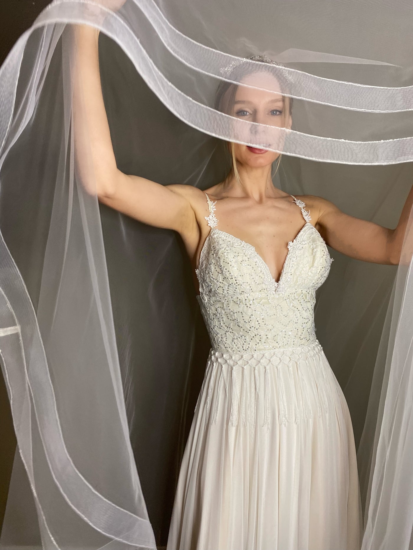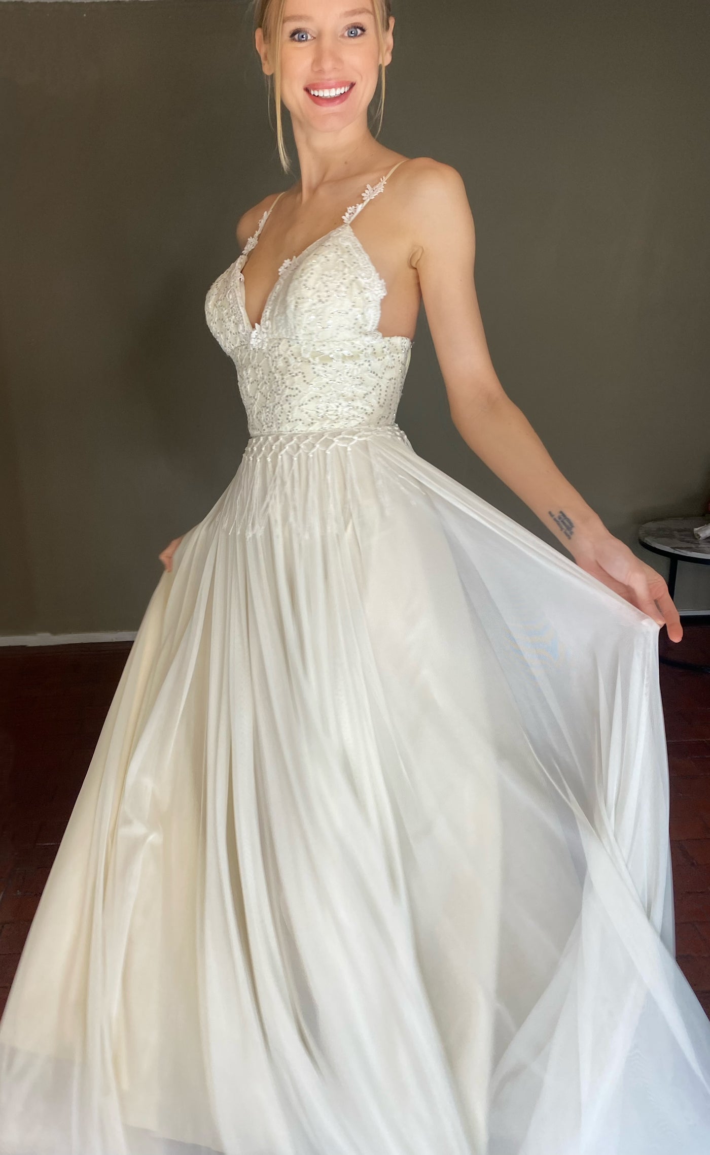 Nuestro vestido hippie de la colección, este vestido lo diseñé pensando en las mujeres libres y hippies de los 60s que usaban este tipo de corte para woodstock con chales de flecos, por eso el fleco en la cintura con bordados de guipures que enmarcan el escote tipo bikini. Super sexy y favorecedor por el fajín que lleva que agarra la cintura para que te veas afinada.