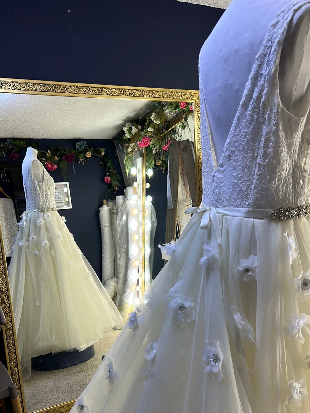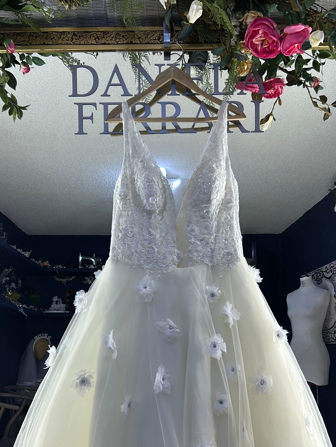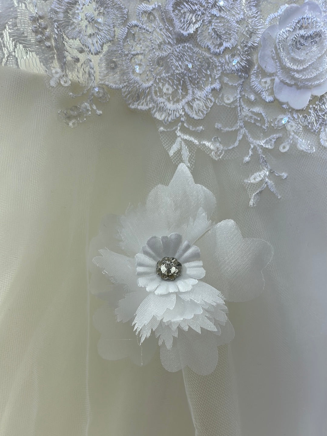 Este vestido espectacular lleva un talle de encaje Chantilly forrado con plumetti de seda para que tenga tacto hipoalergénico falda de tul con flores 3D, bordadas, y en el talle, lleva el bordado con flores 3D de encaje, rebordado con lentejuela mini translúcida, cauda larga con una lluvia de florecitas bordadas
