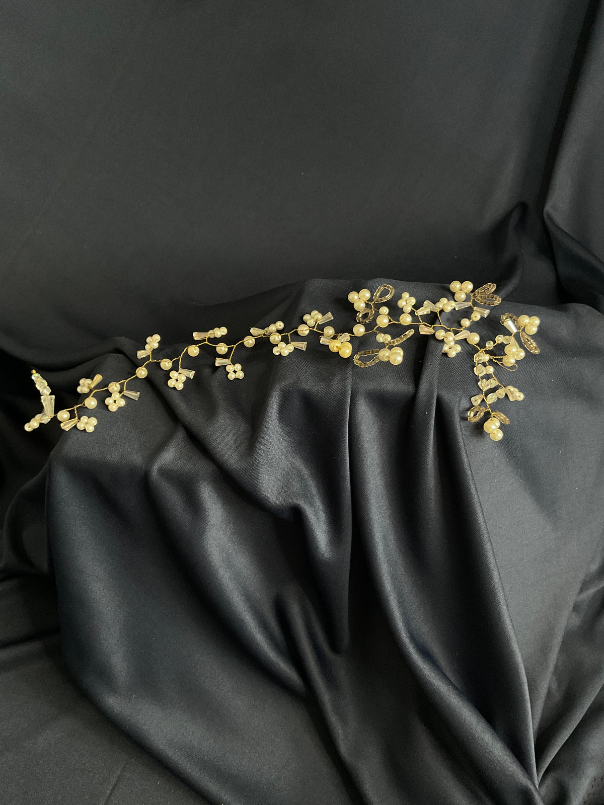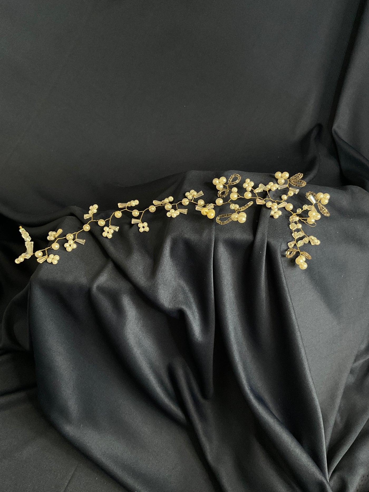 Este tocado representa una guirnalda flexible de estilo floral ,con doma de rama ligera y alargada .Se compone de pequeñas flores hojas y perlas en un diseño muy delicado y entero .Tiene una estructura totalmente moldeable que permite adaptarlo o diferentes peinados .