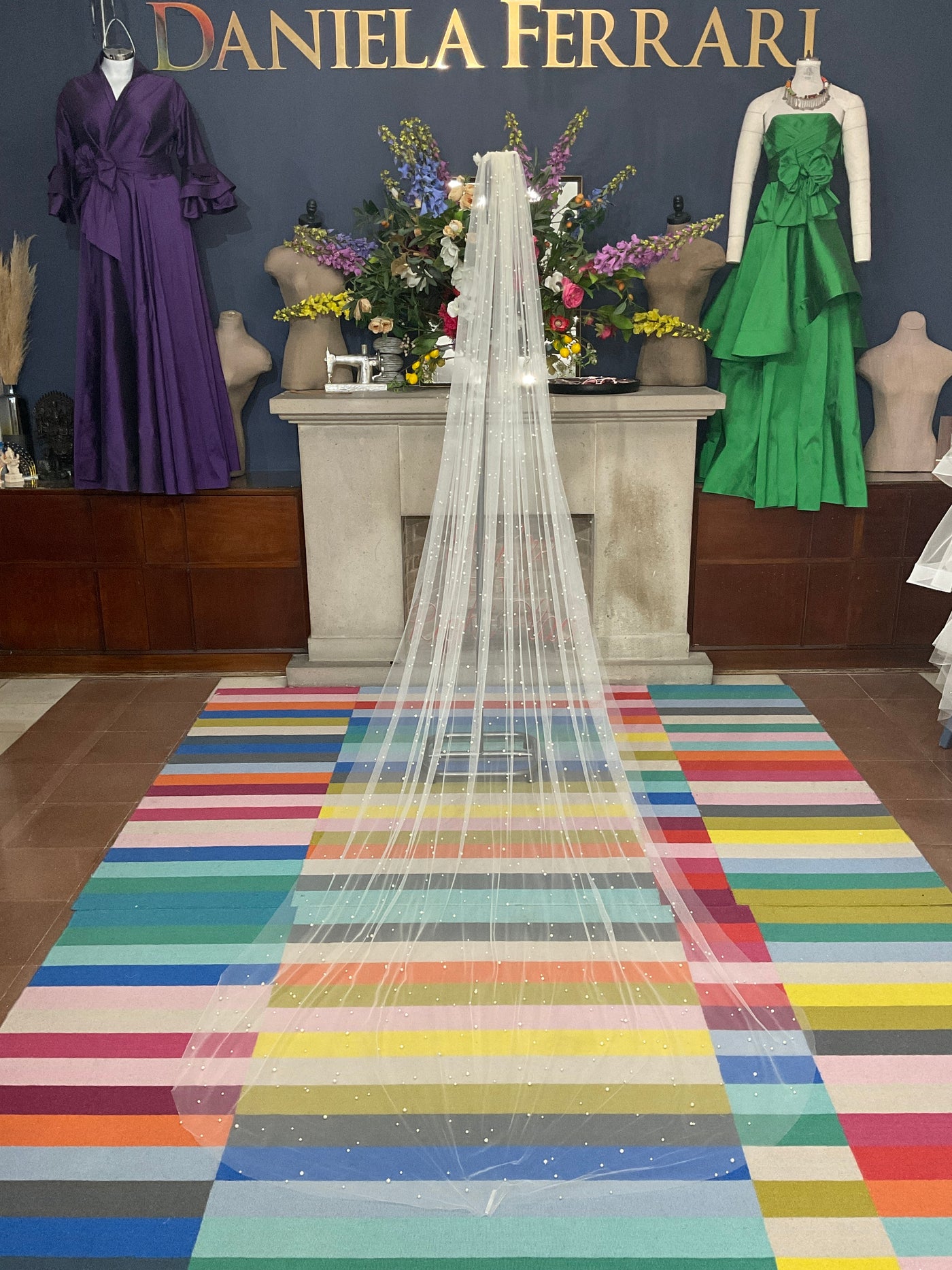 Un velo que captura la luz con cada paso. Este modelo tipo cathedral está confeccionado en tul ultraligero, delicadamente salpicado con bolitas de tipo perla con terminados finos aplicadas a mano que brillan de forma sutil y encantadora. Su diseño sin bordes marcados permite que las perlas sean las verdaderas protagonistas, aportando elegancia moderna y un toque de magia etérea al look nupcial.