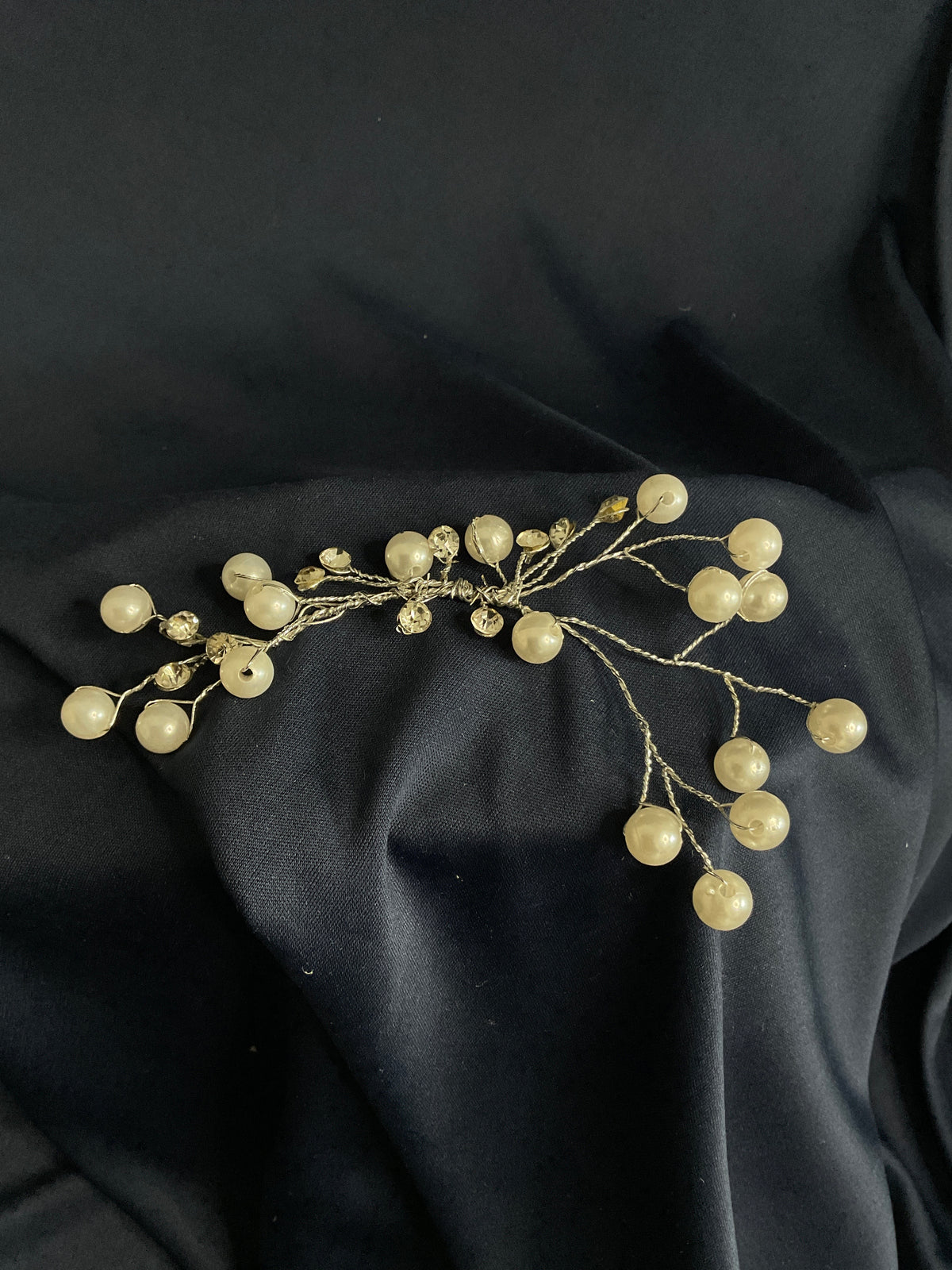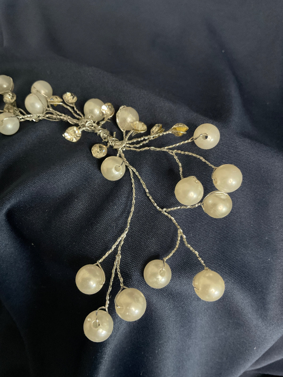 Este tocado con forma guirnalda flexible de estilo floral ,con forma de rama ligera y alargada.Se compone de pequeñas flores,hojas y perlas en un diseño muy delicado y entero. Tiene una estructura totalmente moldeable que permite adaptarlo a diferentes peinados .Compuesta por pequeñas flores formadas por bolitas tipo perlas redondas .