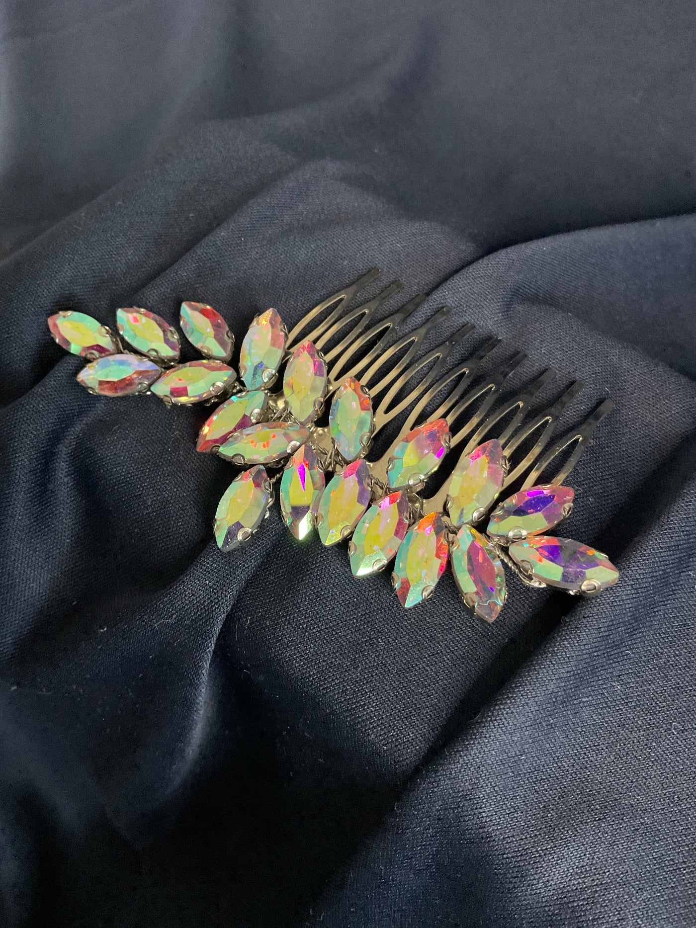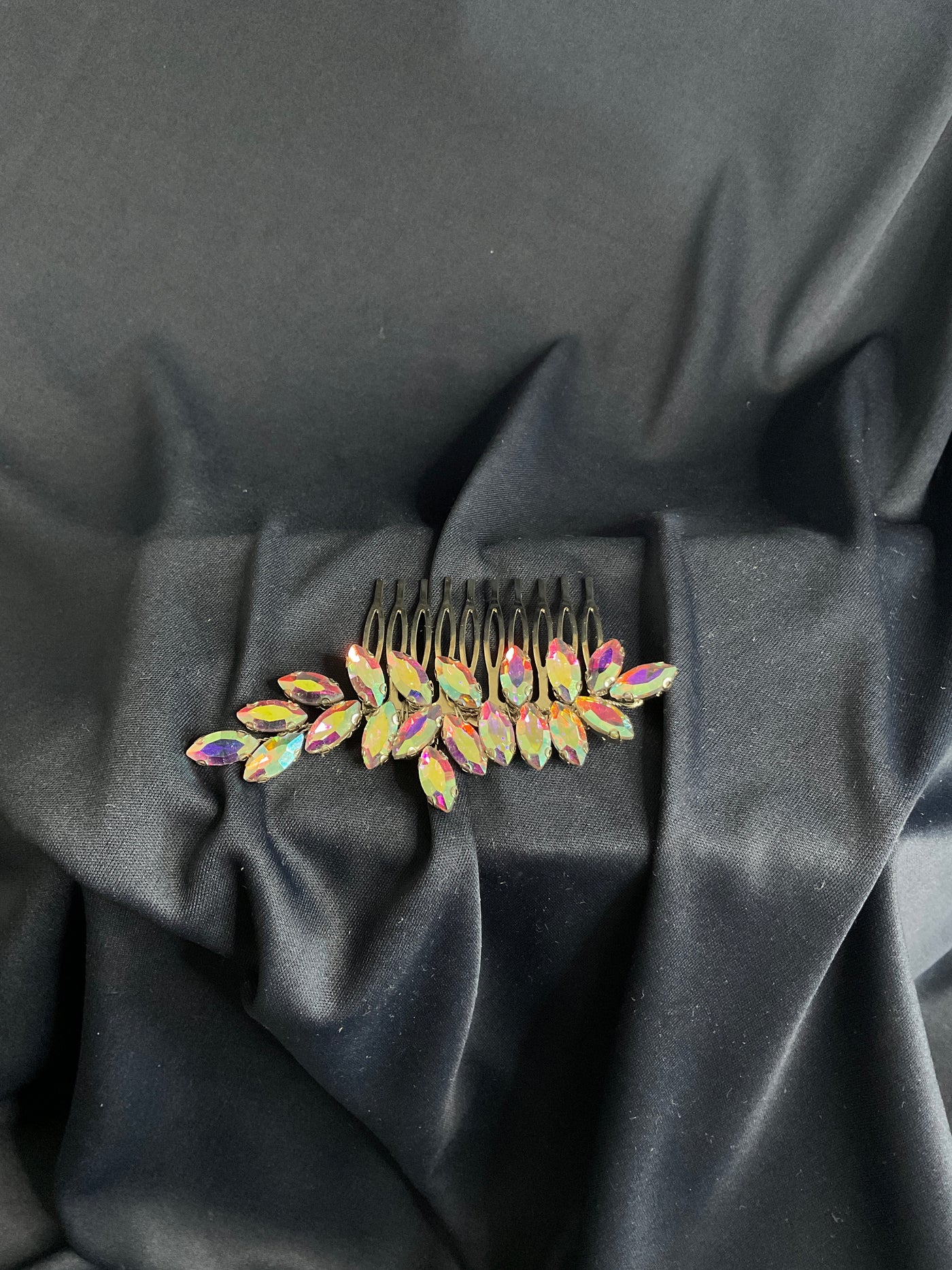 Tocado de cristales multicolor efecto aurora boreal ,diseñado para quienes quieren aman brillar con un estilo moderno ,atrevido y totalmente fuera de lo común. Con cristales de corte almendrado que reflejan tonos vibrantes de rosa ,dorado ,verde y violeta según la luz .