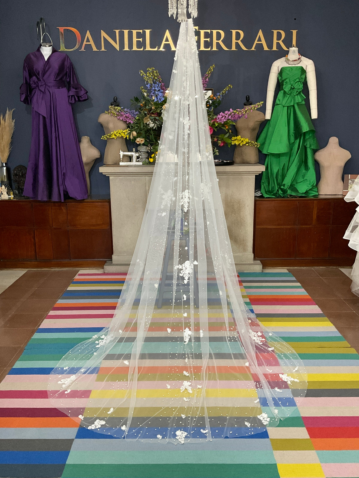 Este velo de novia tipo cathedral combina la sutileza de las perlas con la belleza tridimensional de flores aplicadas a mano, creando un efecto etéreo y encantador. Las aplicaciones se distribuyen de manera vertical desde la parte superior hasta la cauda, aportando textura, brillo y movimiento con cada paso. El tul suave y translúcido permite que las flores parezcan flotar, convirtiendo este accesorio en una obra de arte viva.