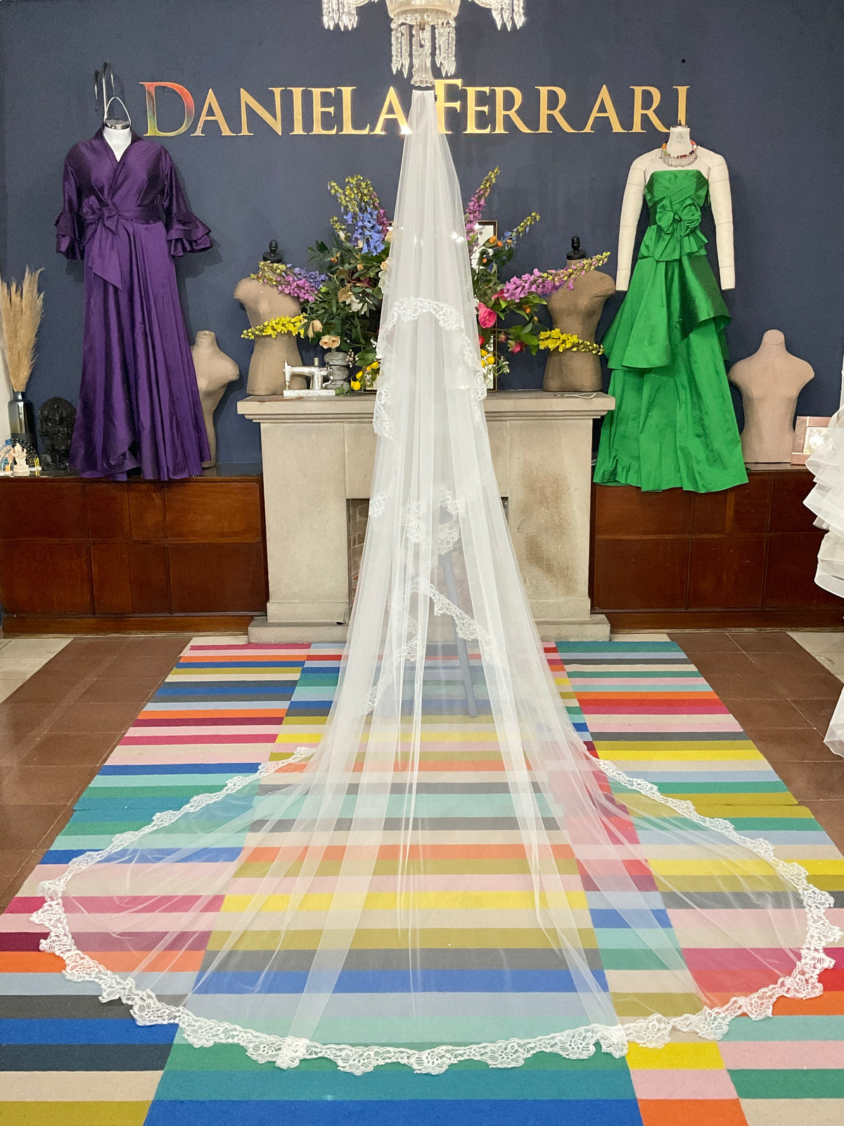 Un velo que enmarca la belleza de cada paso. Este diseño estilo catedral está confeccionado en tul suave y rematado con delicado encaje francés en todo el contorno, creando un efecto envolvente, romántico y atemporal.