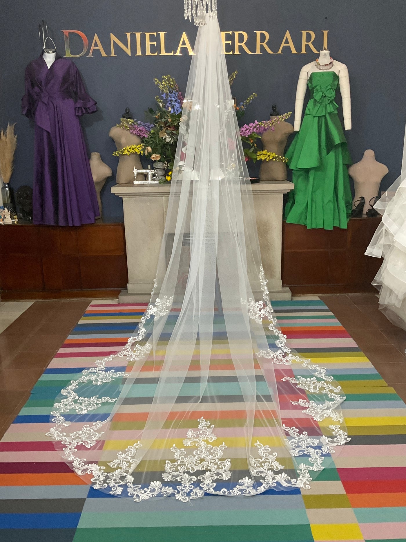Este velo de novia tipo cathedral es una joya atemporal diseñada para novias que sueñan con un look romántico y majestuoso. Confeccionado en tul de alta calidad, su caída etérea se extiende con elegancia a lo largo del pasillo, creando una silueta inolvidable al caminar hacia el altar. El contorno está delicadamente bordado con motivos florales que evocan el arte del encaje francés, añadiendo un toque de sofisticación y feminidad al look nupcial.