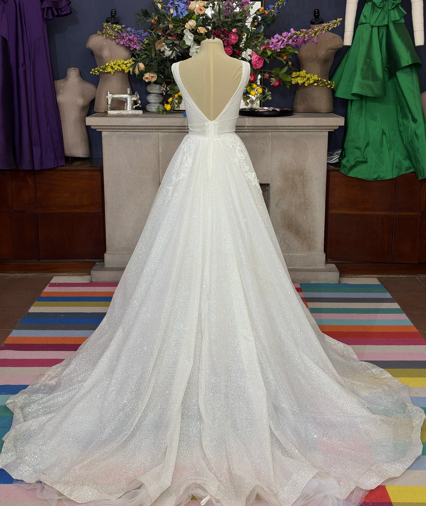 Para novias que sueñan con brillar desde el primer paso hasta el último baile. Este vestido de novia presenta un escote profundo en “V” con transparencia, acompañado de un delicado bordado floral sobre una base de tul con glitter que destella suavemente en cada movimiento. La falda amplia con cauda fluida aporta un aire de grandeza, mientras que la espalda escotada en pico enmarca con elegancia la silueta.✨