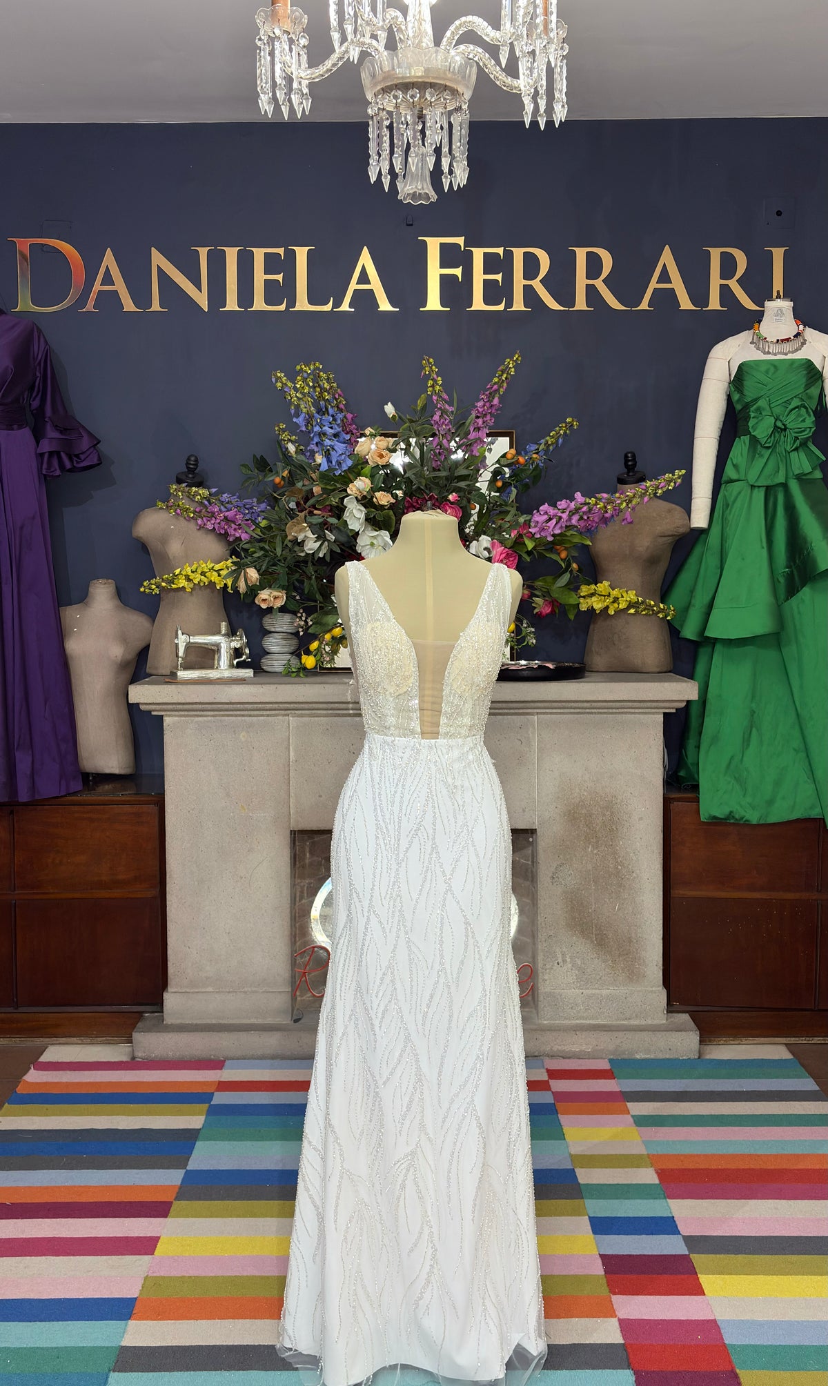 Un diseño que brilla con discreción y sofisticación. Este vestido de novia de silueta recta está confeccionado en tul bordado con líneas de pedrería que simulan espigas, estilizando visualmente la figura y creando un efecto de movimiento sutil. El escote en V profundo con tul ilusión al centro aporta sensualidad con equilibrio, mientras que los tirantes delgados y la espalda baja realzan la feminidad de manera refinada.