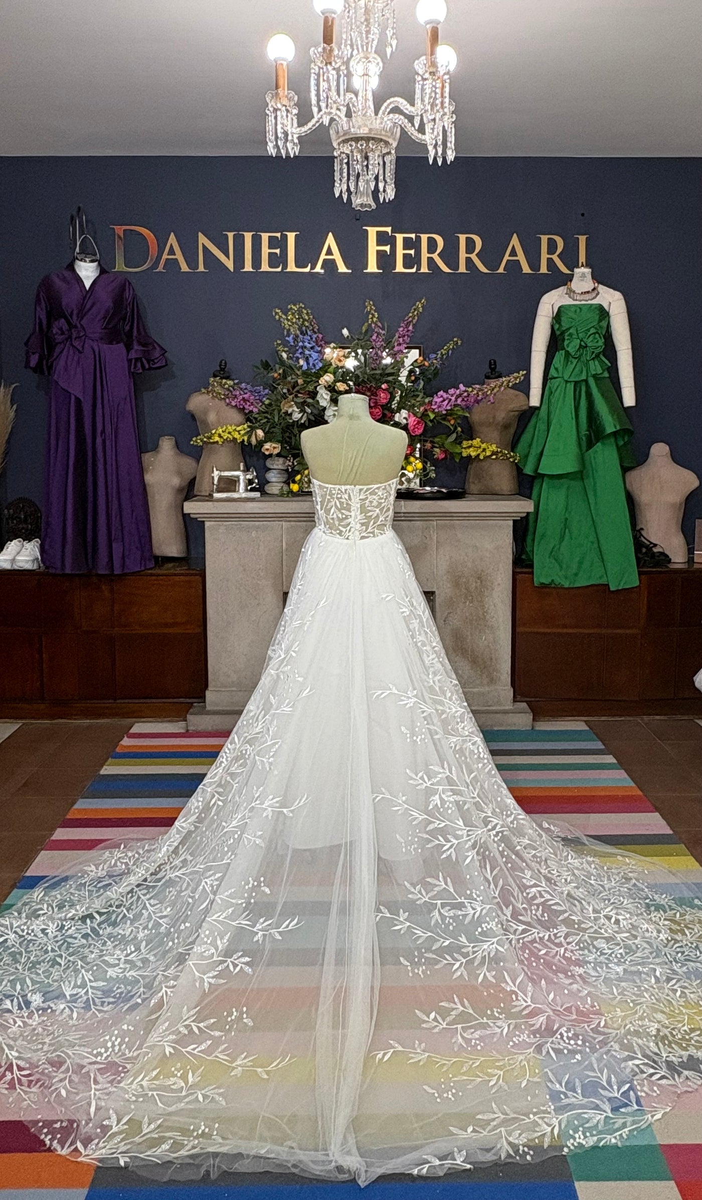 La cauda fluida se transforma en un jardín en movimiento, perfecta para novias que desean una pieza única, ligera y elegante, hecha a la medida para bodas al aire libre, ceremonias bohemias o celebraciones con un toque de cuento de hadas.✨