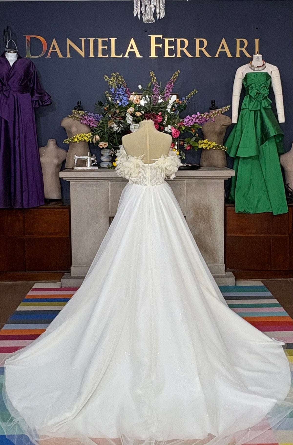 Romántico, etéreo y absolutamente inolvidable. Este vestido de novia de inspiración couture combina un corset estructurado con transparencias y encaje delicado, realzado por mangas caídas adornadas con flores 3D hechas a mano. La falda de tul con sutiles destellos de glitter flota con gracia y ligereza, creando un efecto mágico al caminar. Ideal para novias que desean un vestido de ensueño con un toque moderno y teatral.✨