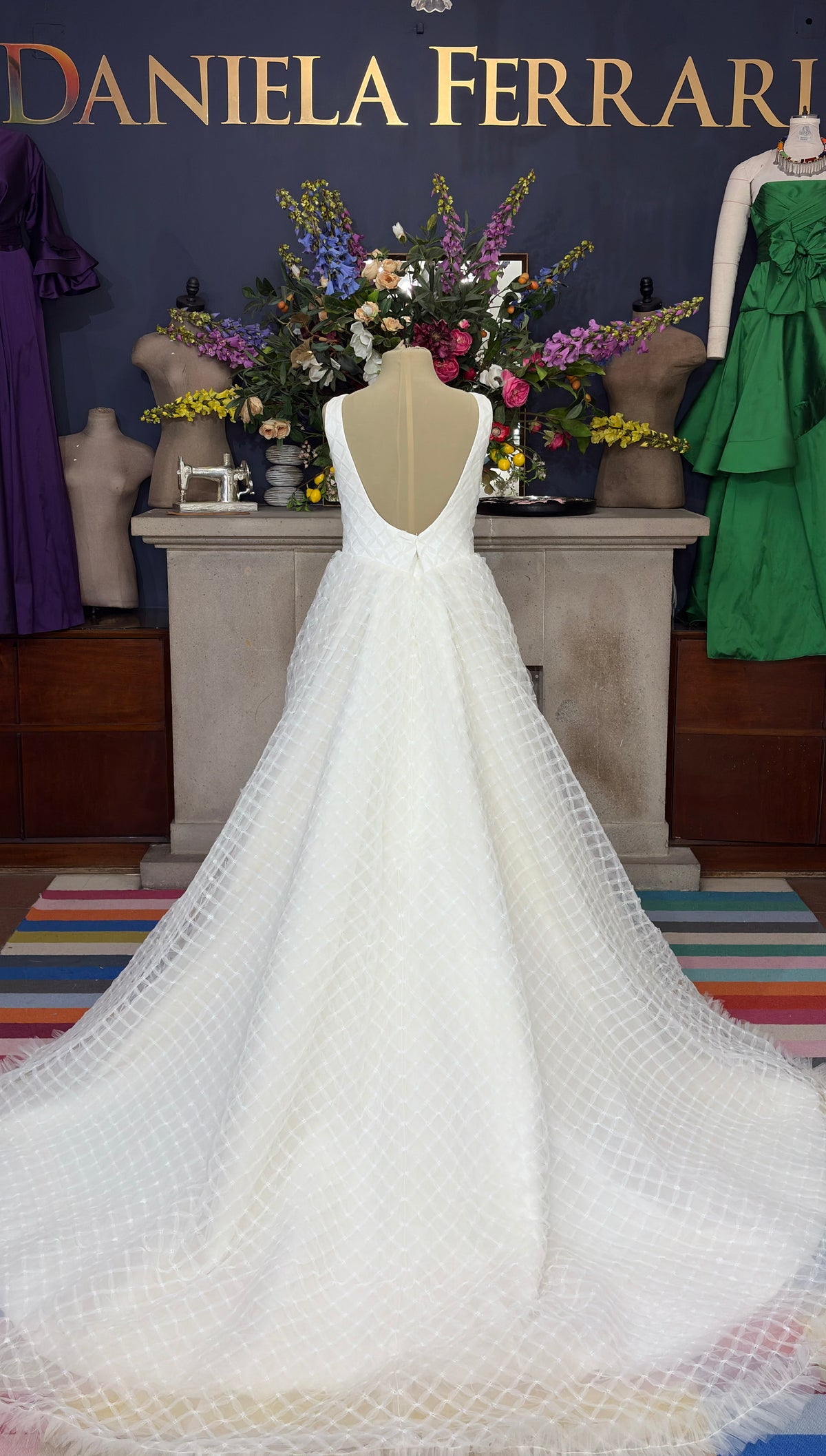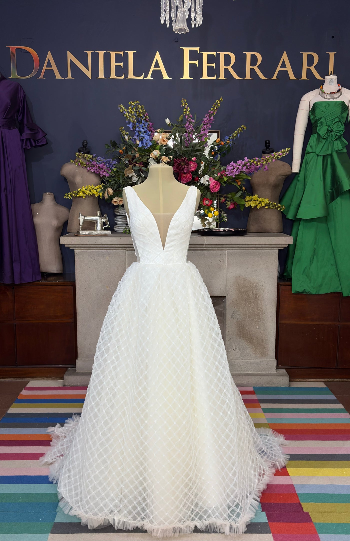 Este vestido de novia celebra la elegancia contemporánea con una propuesta fresca y sofisticada. Confeccionado en tul texturizado con patrón geométrico tipo rejilla, este diseño logra una silueta escultural que combina volumen, estructura y ligereza. Su escote profundo en V con tul ilusión aporta sensualidad con equilibrio, mientras que la espalda abierta añade un toque moderno y femenino.