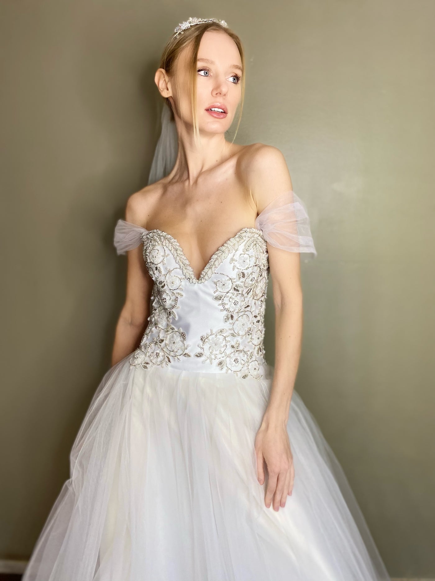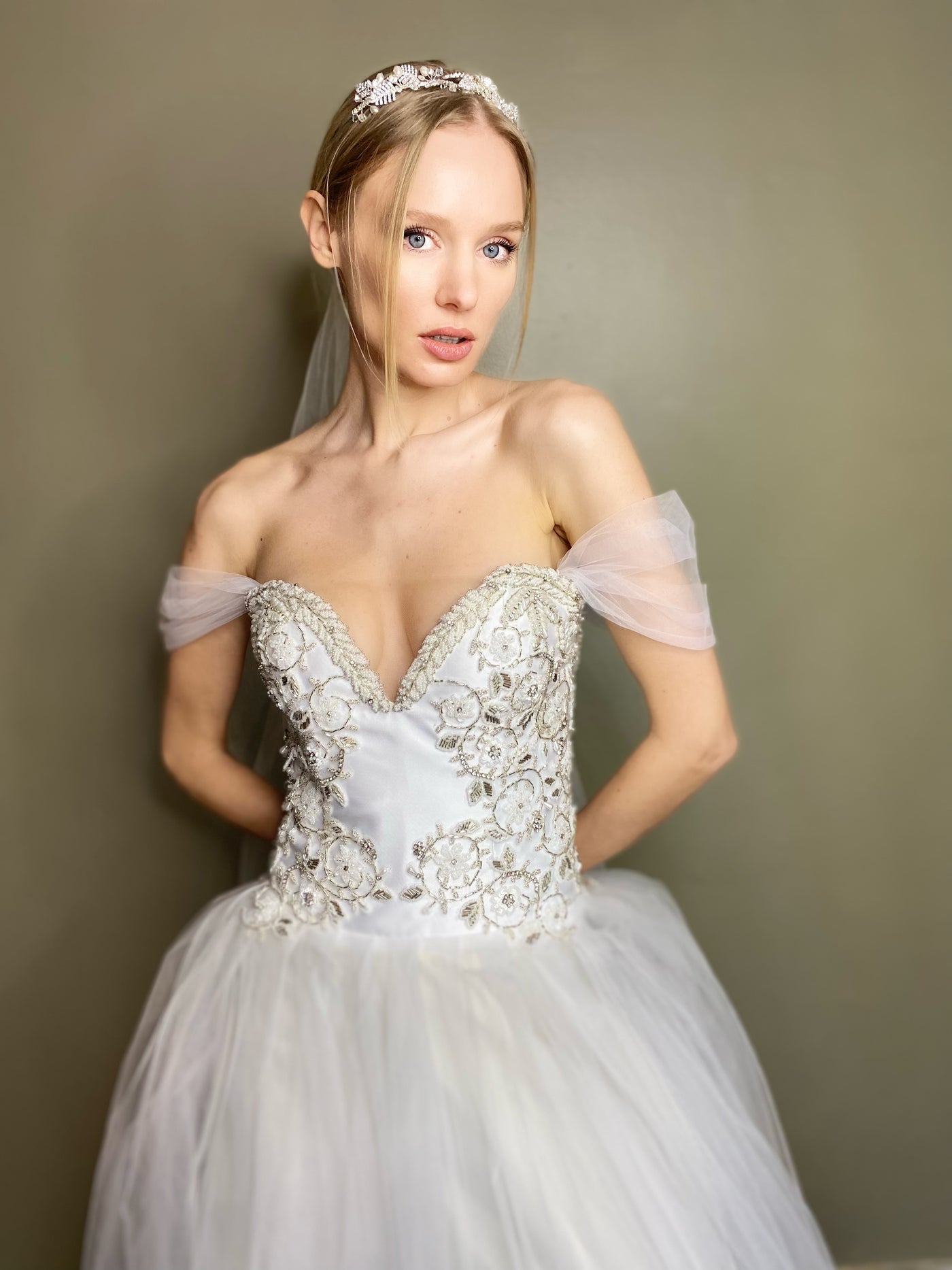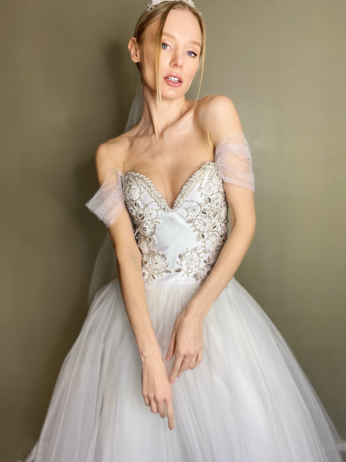 lleva un bordado a mano en el centro del escote para afinar y a siluetear. La base es tafetta stretch con tirantes spaguetti. Le puedes poner manguita de tulle desmontable o las mangas bombón para darle un look más etéreo