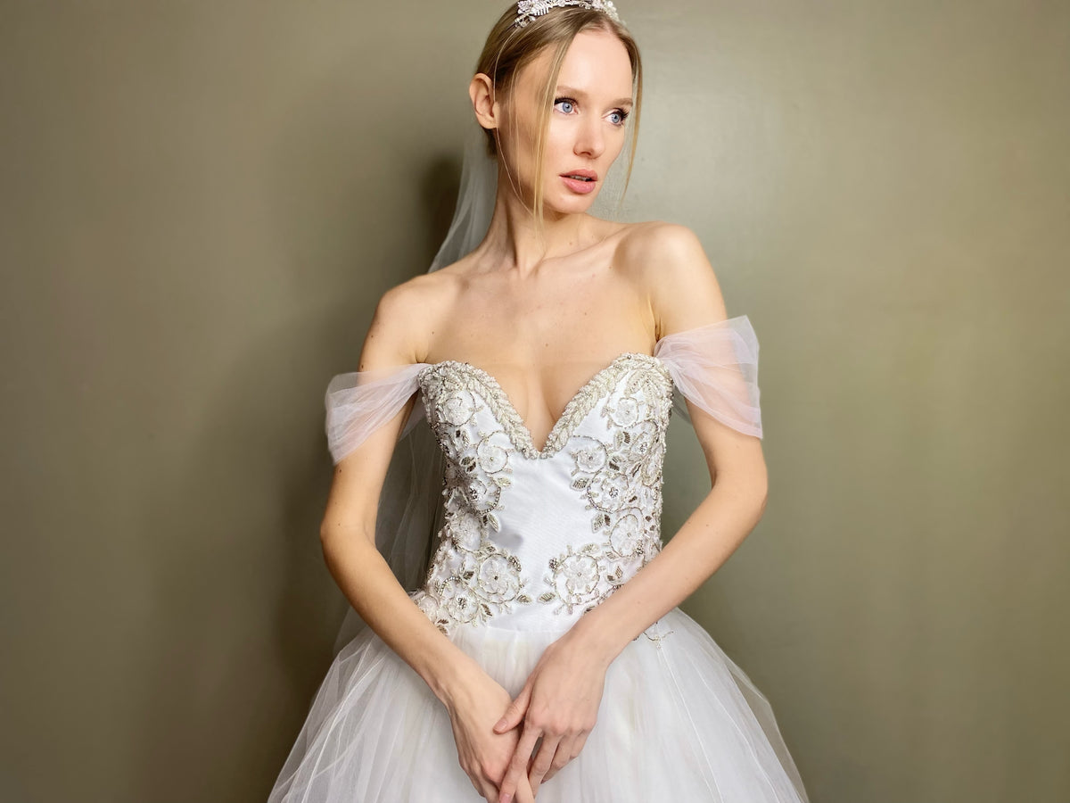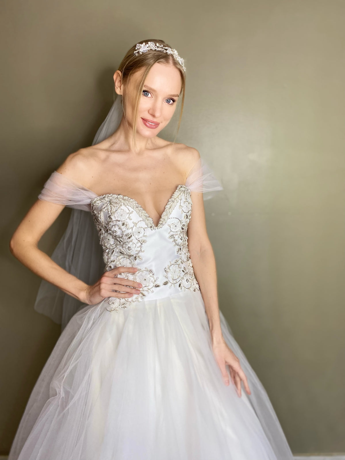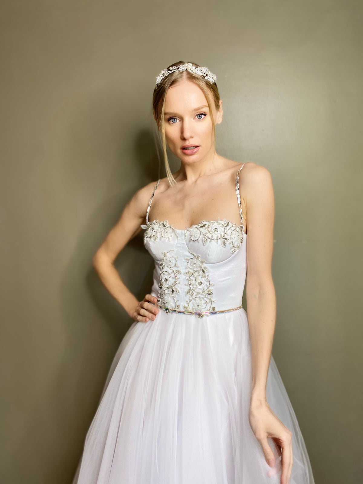 lleva un bordado a mano en el centro del escote para afinar y a siluetear. La base es tafetta stretch con tirantes spaguetti. Le puedes poner manguita de tulle desmontable o las mangas bombón para darle un look más etéreo