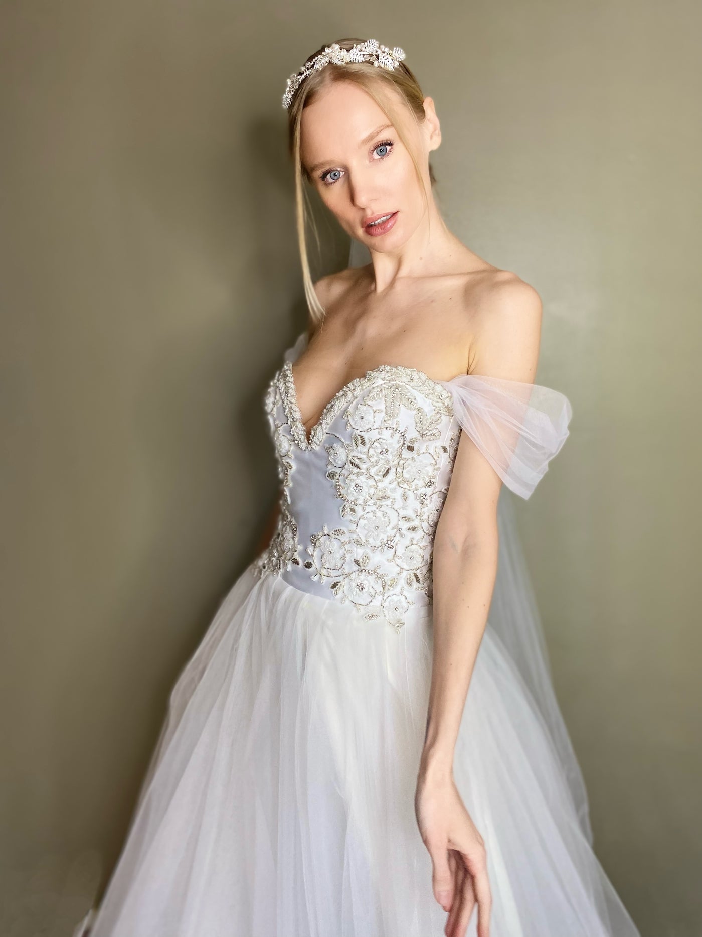 la falda es tulle italiano suavizado lo que le da un tacto espectacular , flotas sobre capas y capas de tulle.