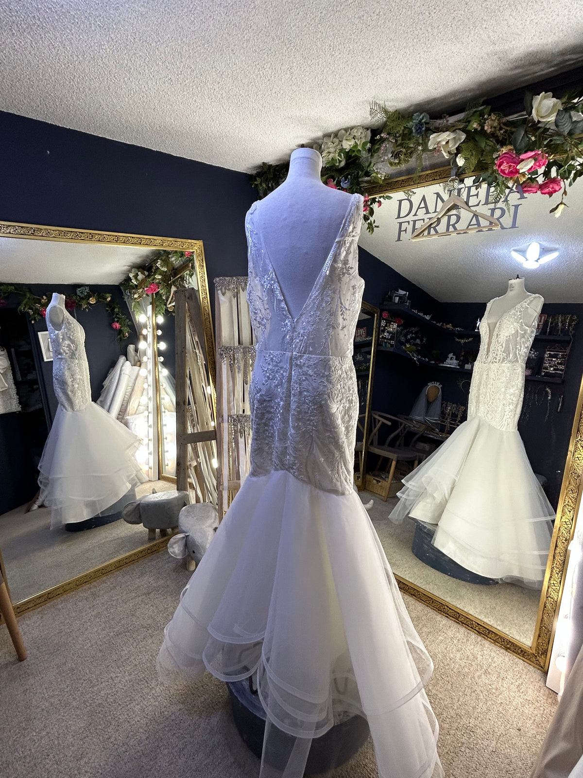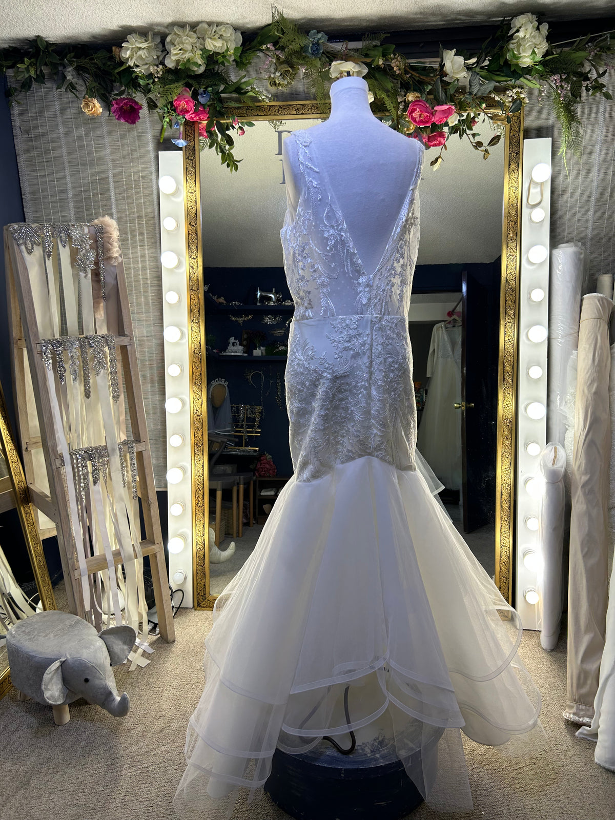 Vestido sirena con vuelos de tulle volante con orilla de crin, una silueta que hará que tu cuerpo enmarque de una manera espectacular