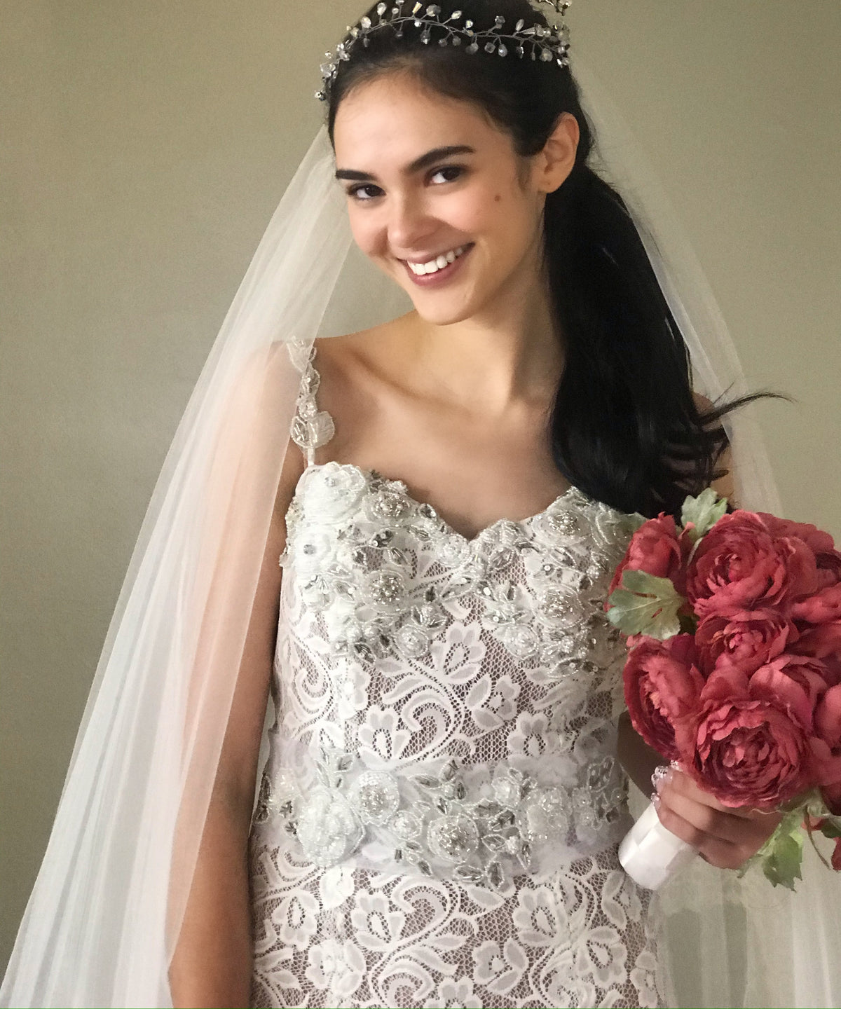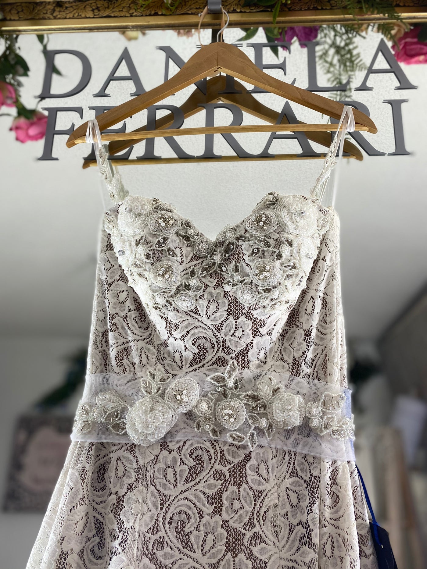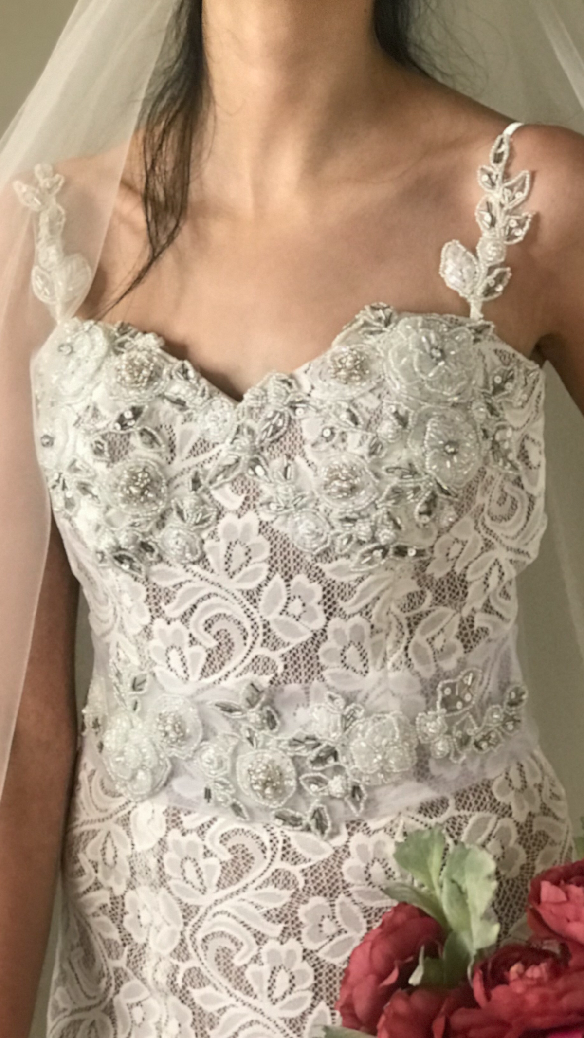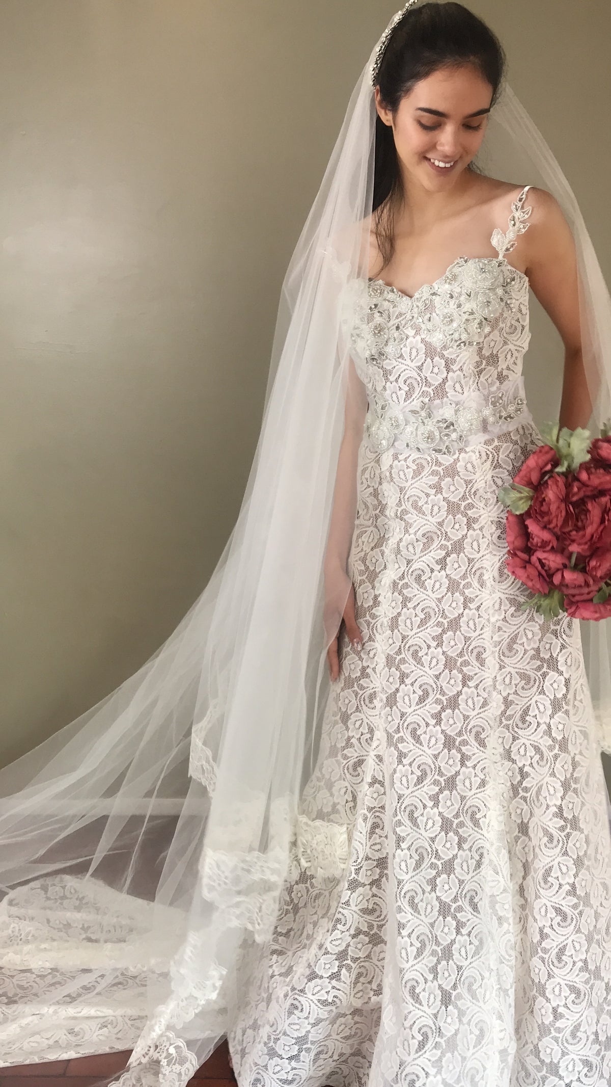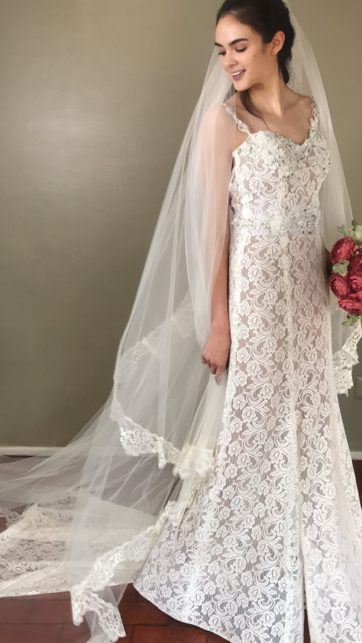 Este vestido con bordados a mano silueta sirena en A con caída estructural y cinturón a juego nuestro velo clásico y un tocado espectacular. El encaje es un encaje de dibujo moderno pero tradicional forrado en nude para que resalte cada detalle y con un escote bajo en la espalda con bordado en tirantes es hermoso!