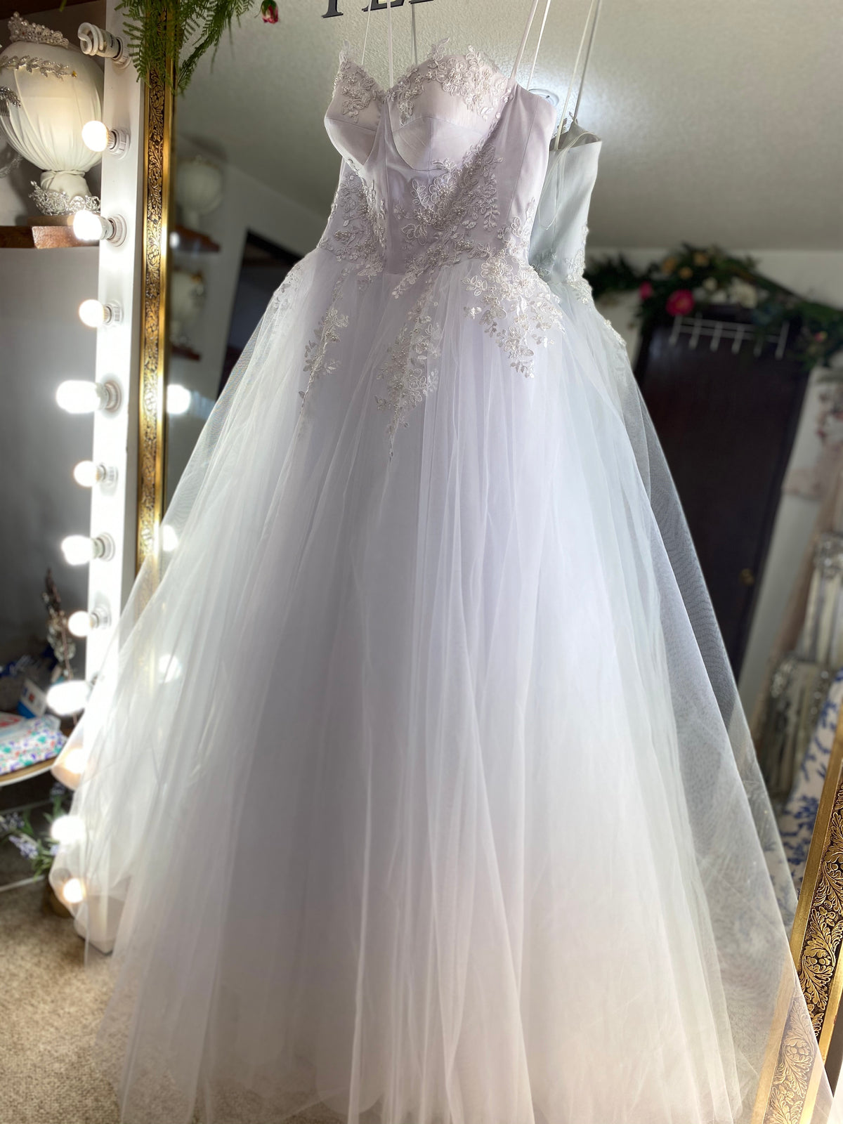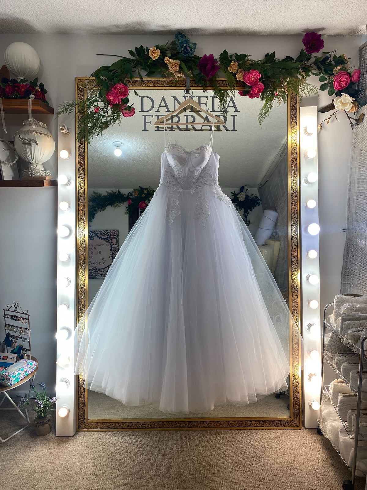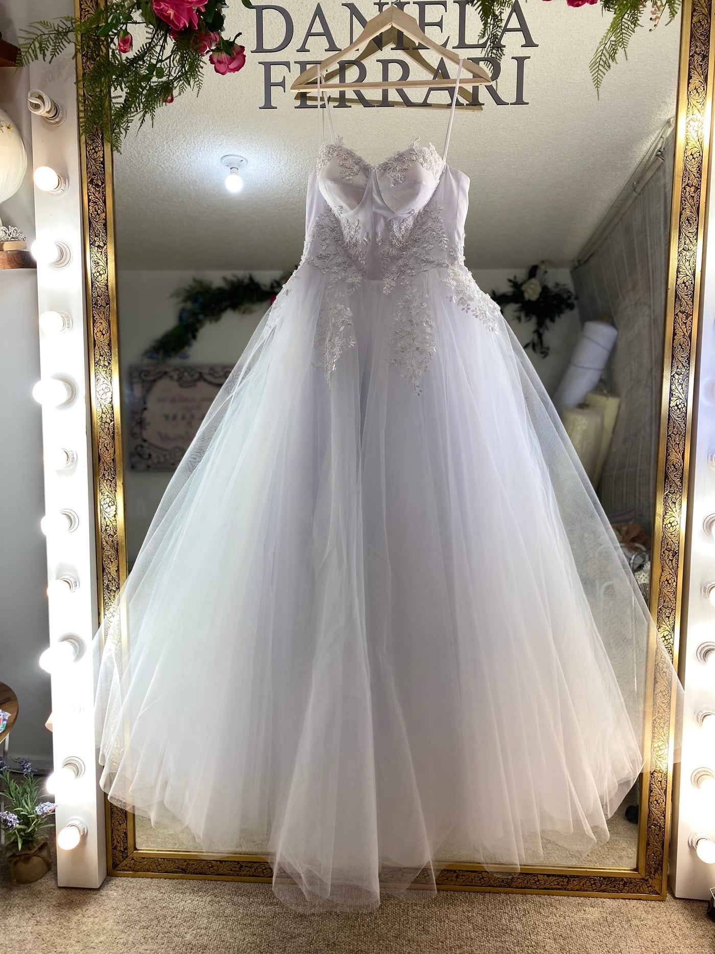 El tulle es en 3 capas y el vuelo es medio ancho para dar la silueta en "A".