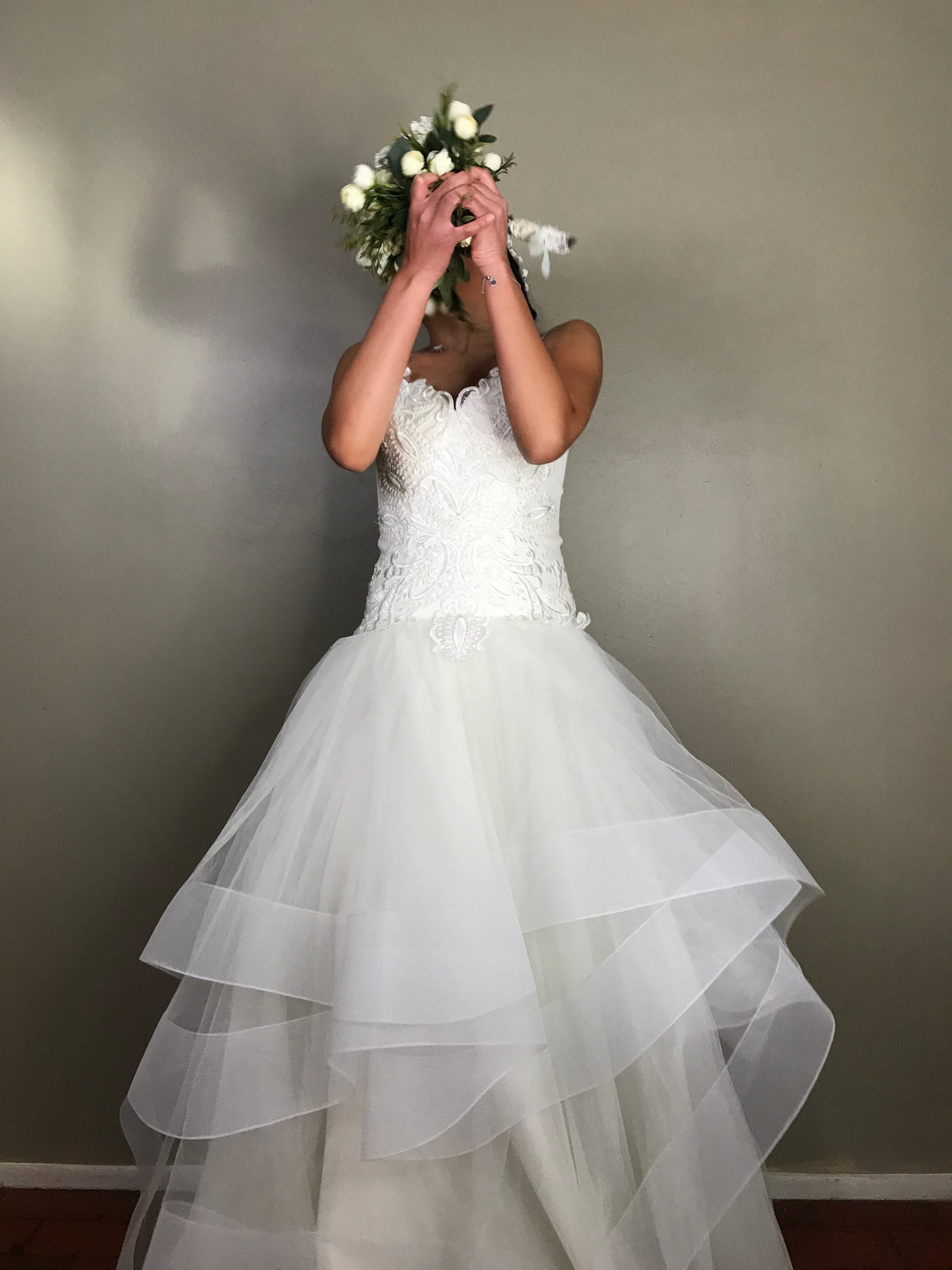 Talle de crepé de seda con falda de tulles en niveles con faldones que tienen un movimiento tan feliz que no podrás dejar de moverte y bailar. Bordado en todo el frente del talle en talle de cintura baja para favorecer el cuerpo.