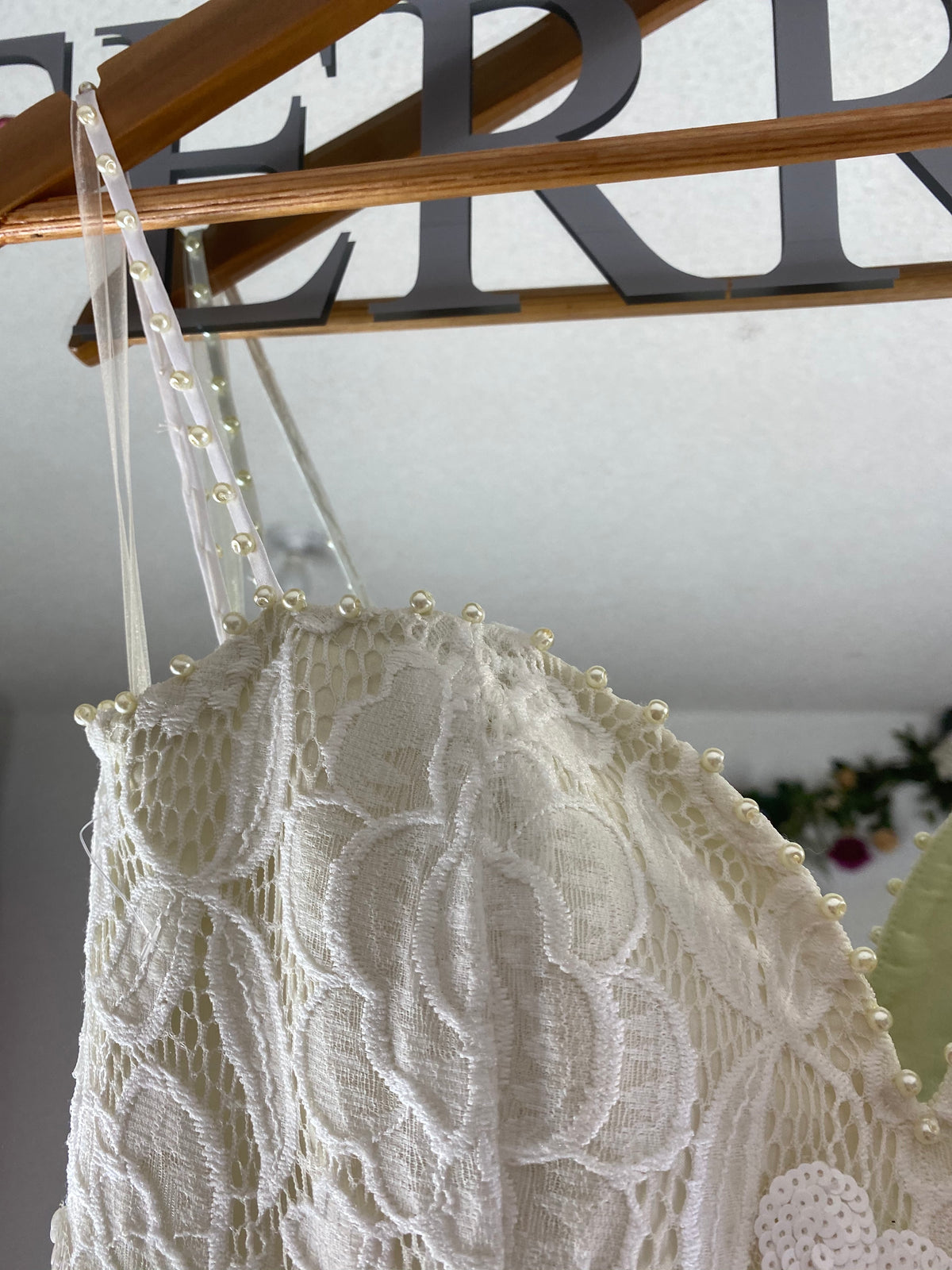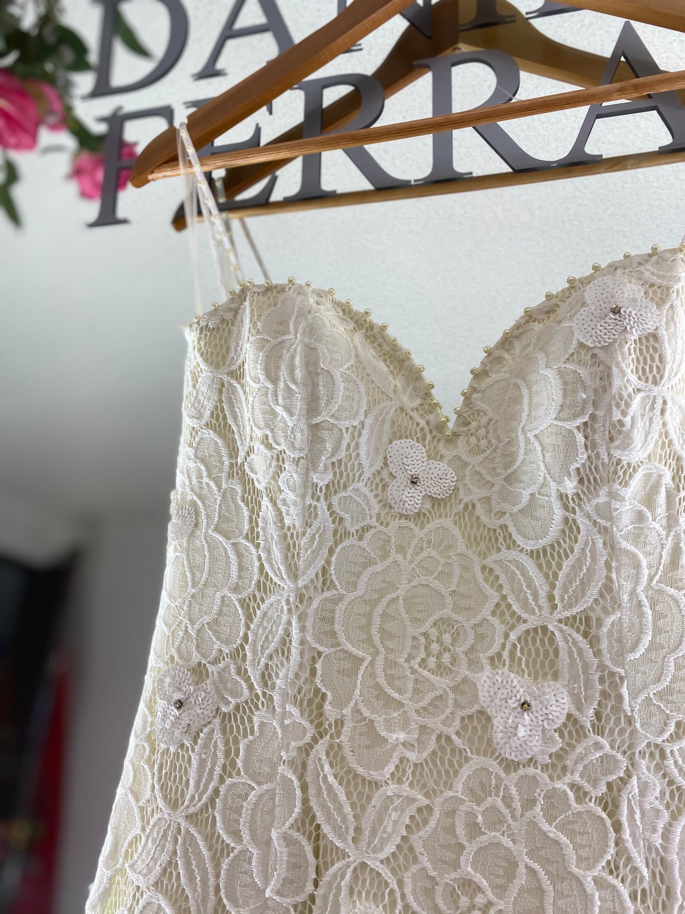En el vestido sobre el encaje, lleva bordadas una flores de bordado luneville que es un bordado francés con lentejuela mini y una piedra swarovski que le da un glow lindo sin ser brillante. Y en la orilla de los escotes lleva un detalle muy lindo de aperlado.