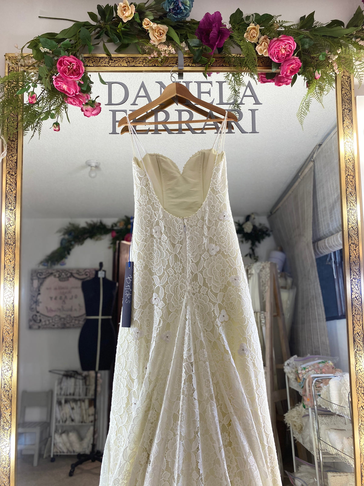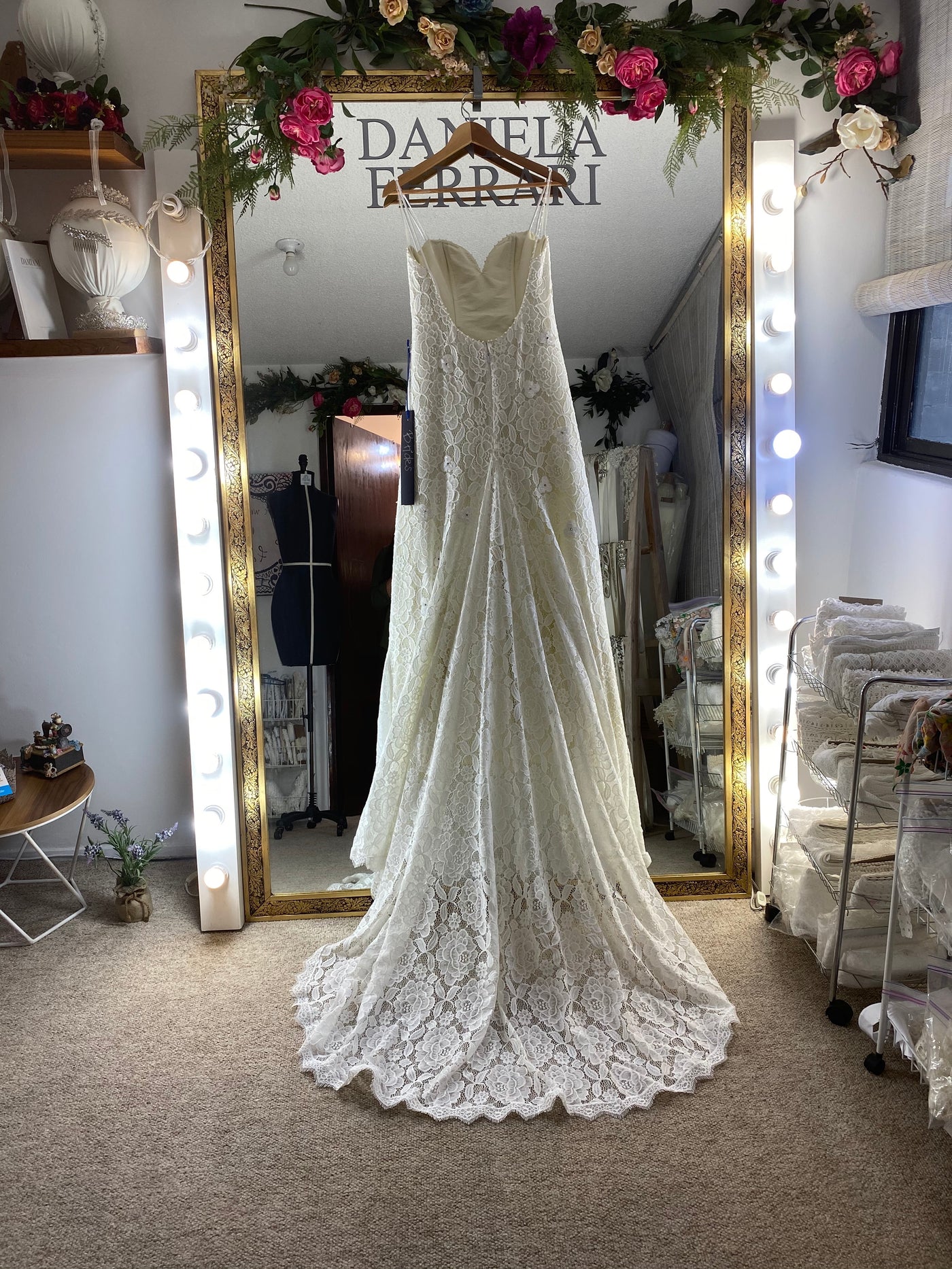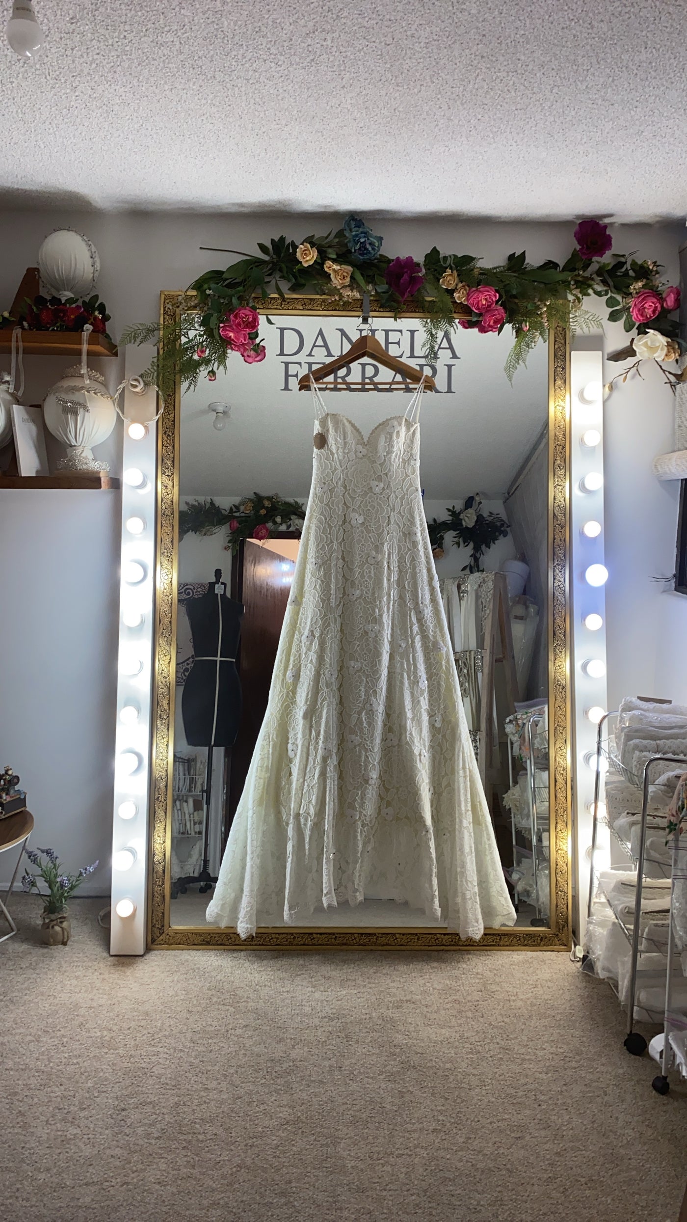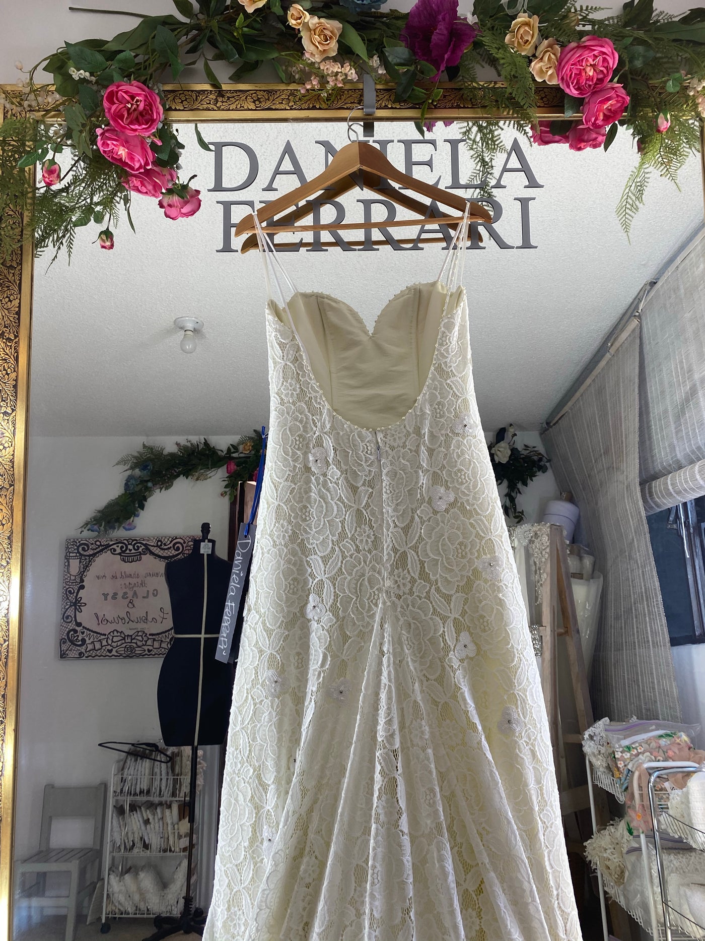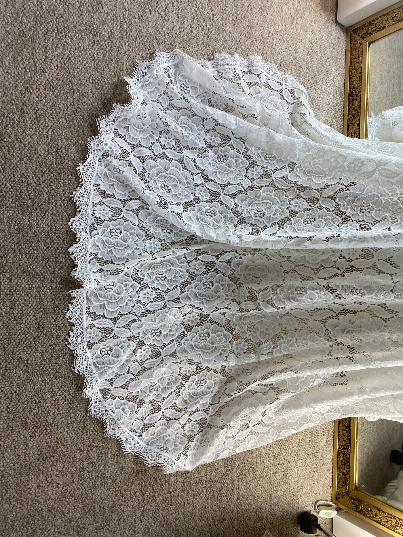 El encaje es un encaje de dibujo clásico español pero stretch entonces es un vestido muy cómodo para disfrutar, esta combinación de materiales es perfecto para bodas de playa o de dia. Para novias de noche seria increible con un cinturon de pedrería, le daria el toque mágico que necesitan las novias de noche. Y obvio un velo que des la entrada del siglo!