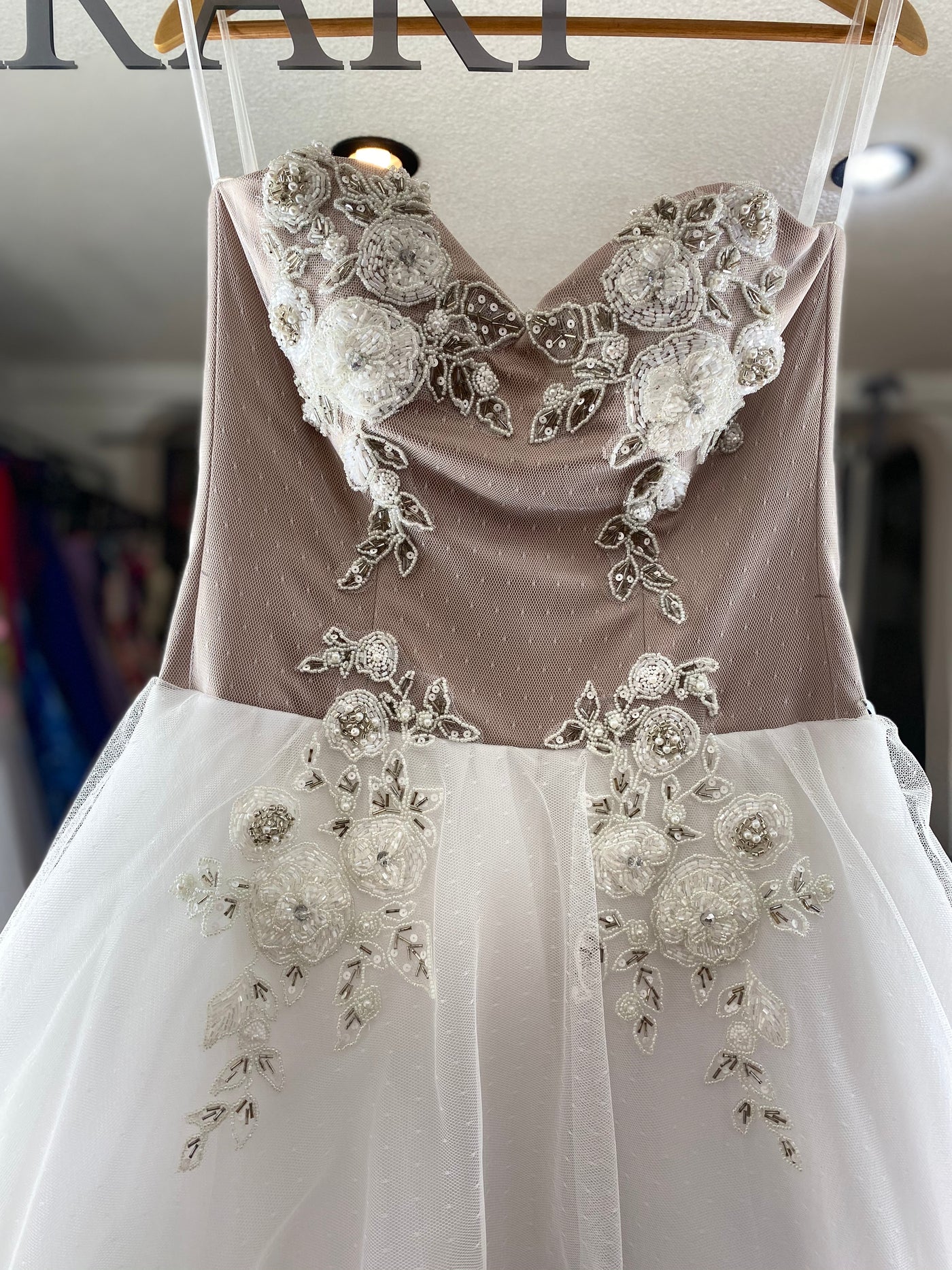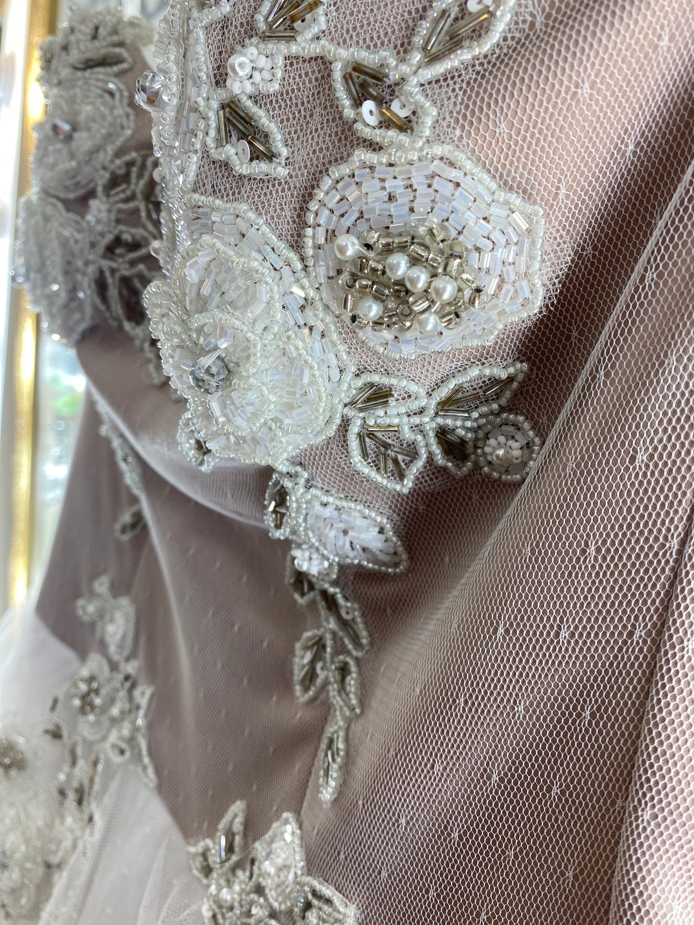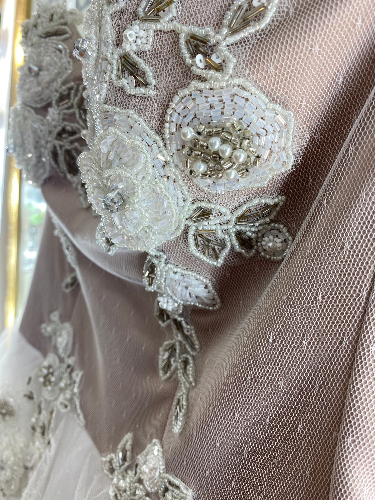 Los bordados de este vestido son una locura! Falda de plumetti de seda encañonado con base de tulle y talle de crepé nude con plumetti a juego. Terminado con botones forrados . A este son tirantes mini le bajas la espalda hermoso y le ponemos más bordado en la espalda 😍