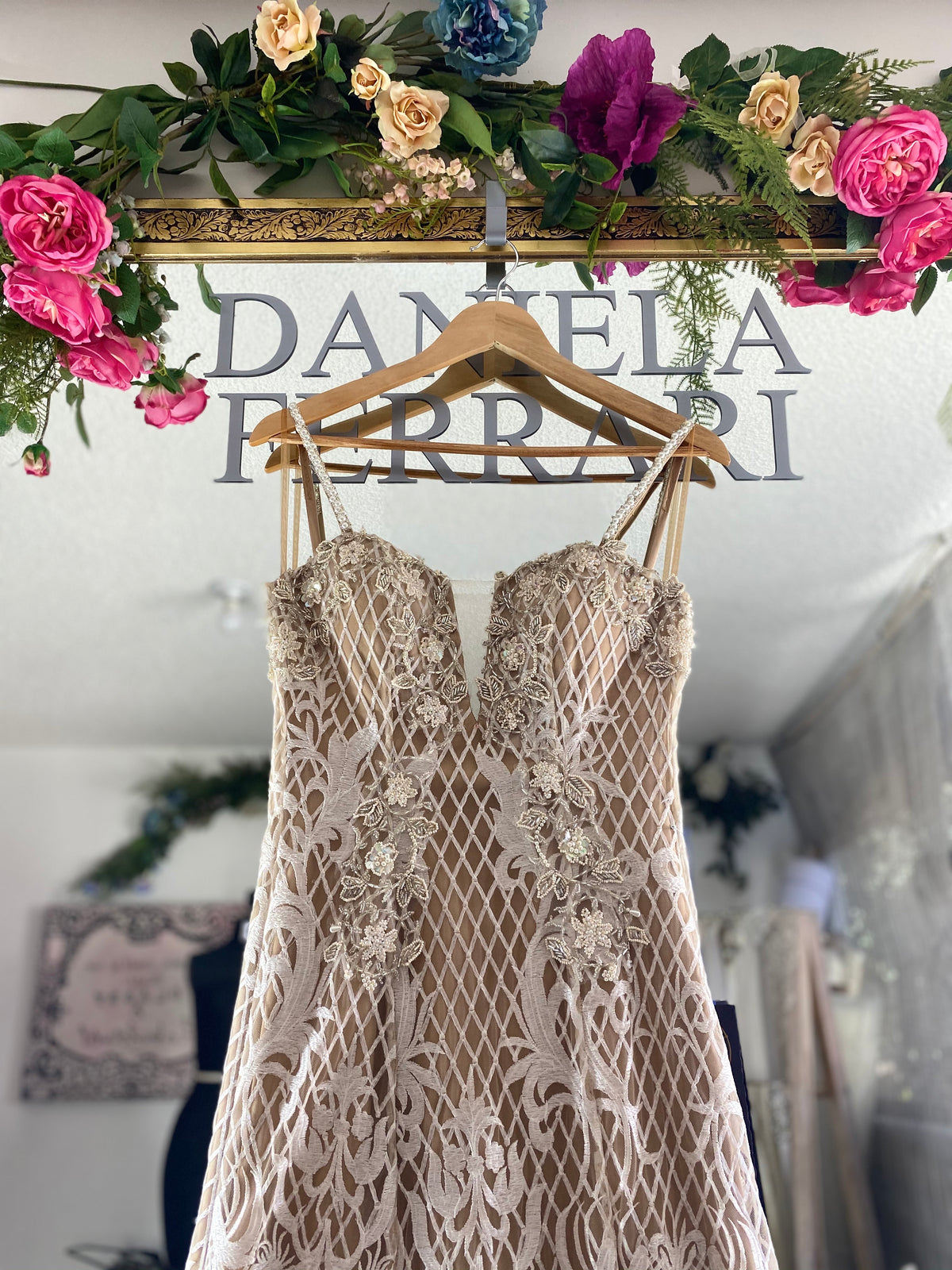 enmarca el cuerpo con las flores de liz gigantes y bordados a mano de pedrería en talle del escote y con tirante bordado.