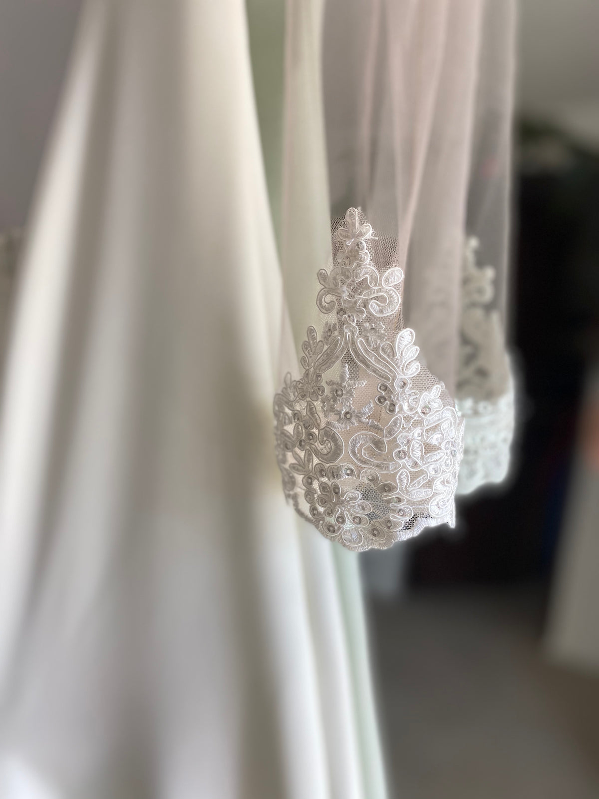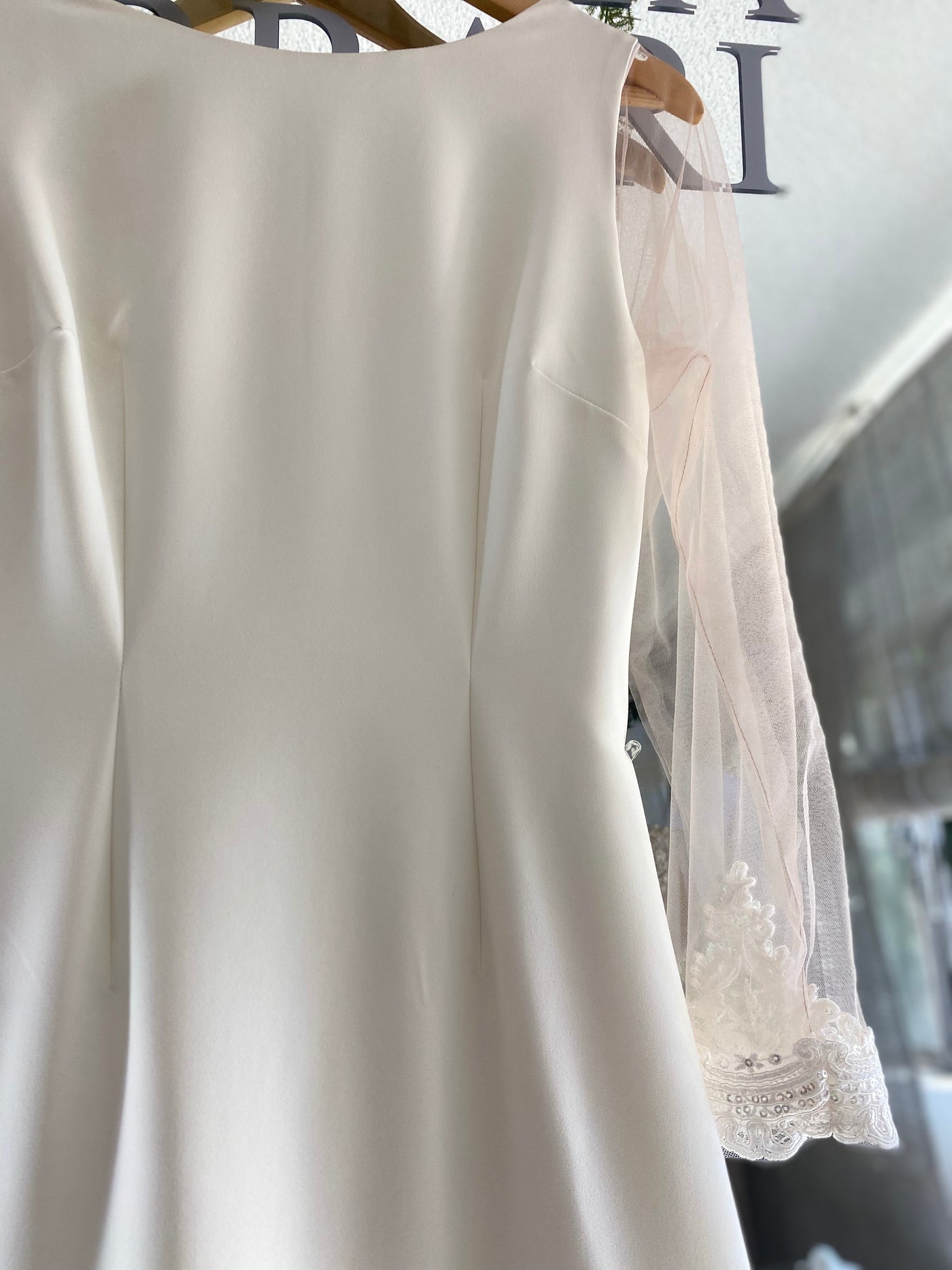 Divino cuerpo de crepé de seda con mangas tulle transparente y cauda de encaje con guipiure