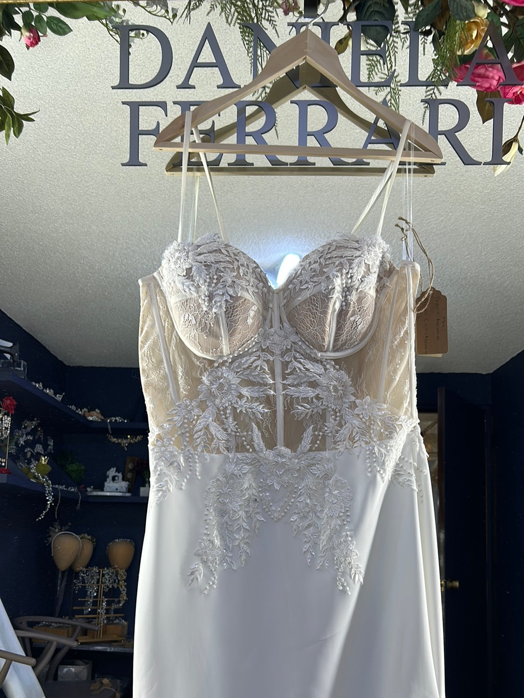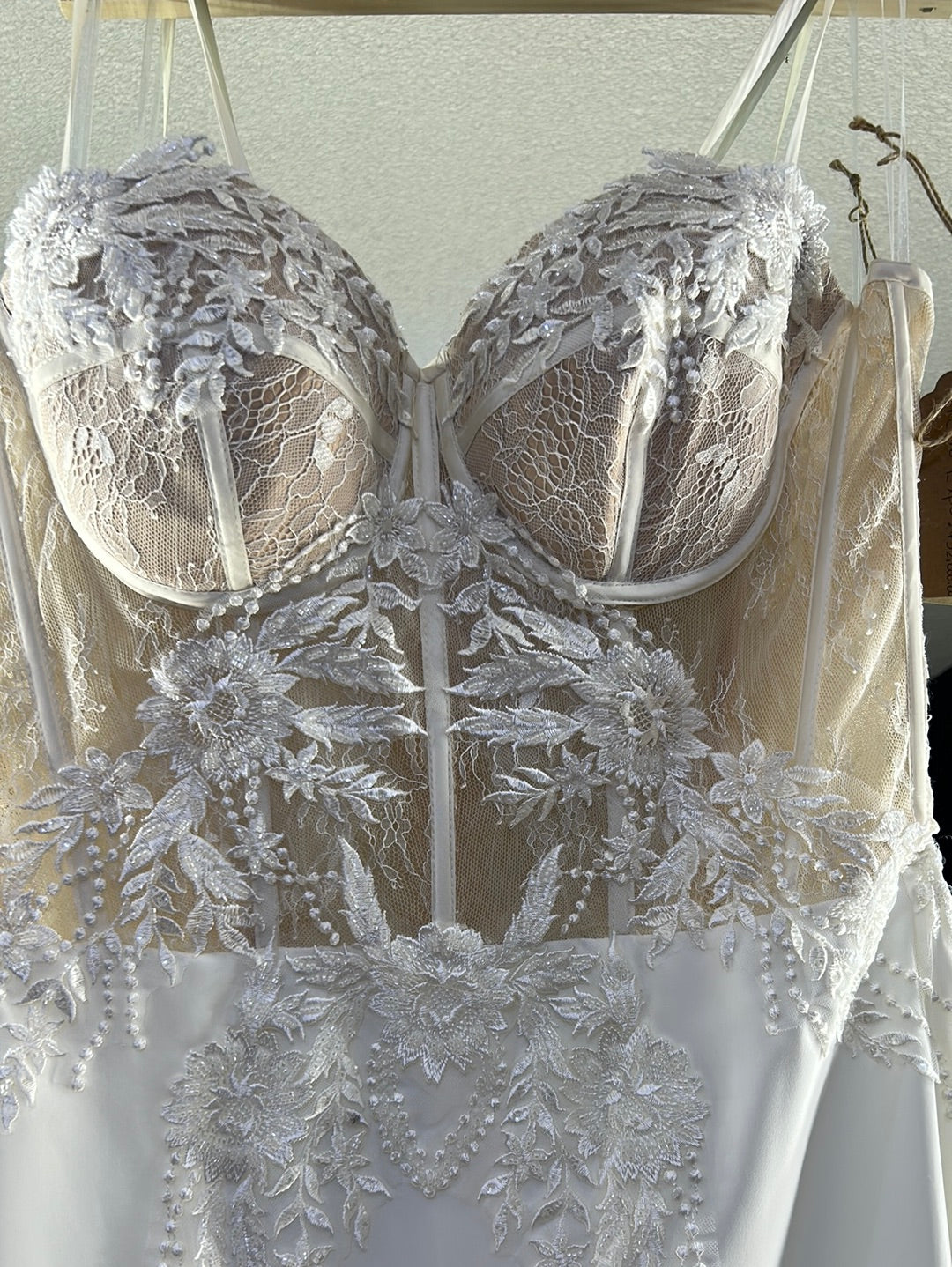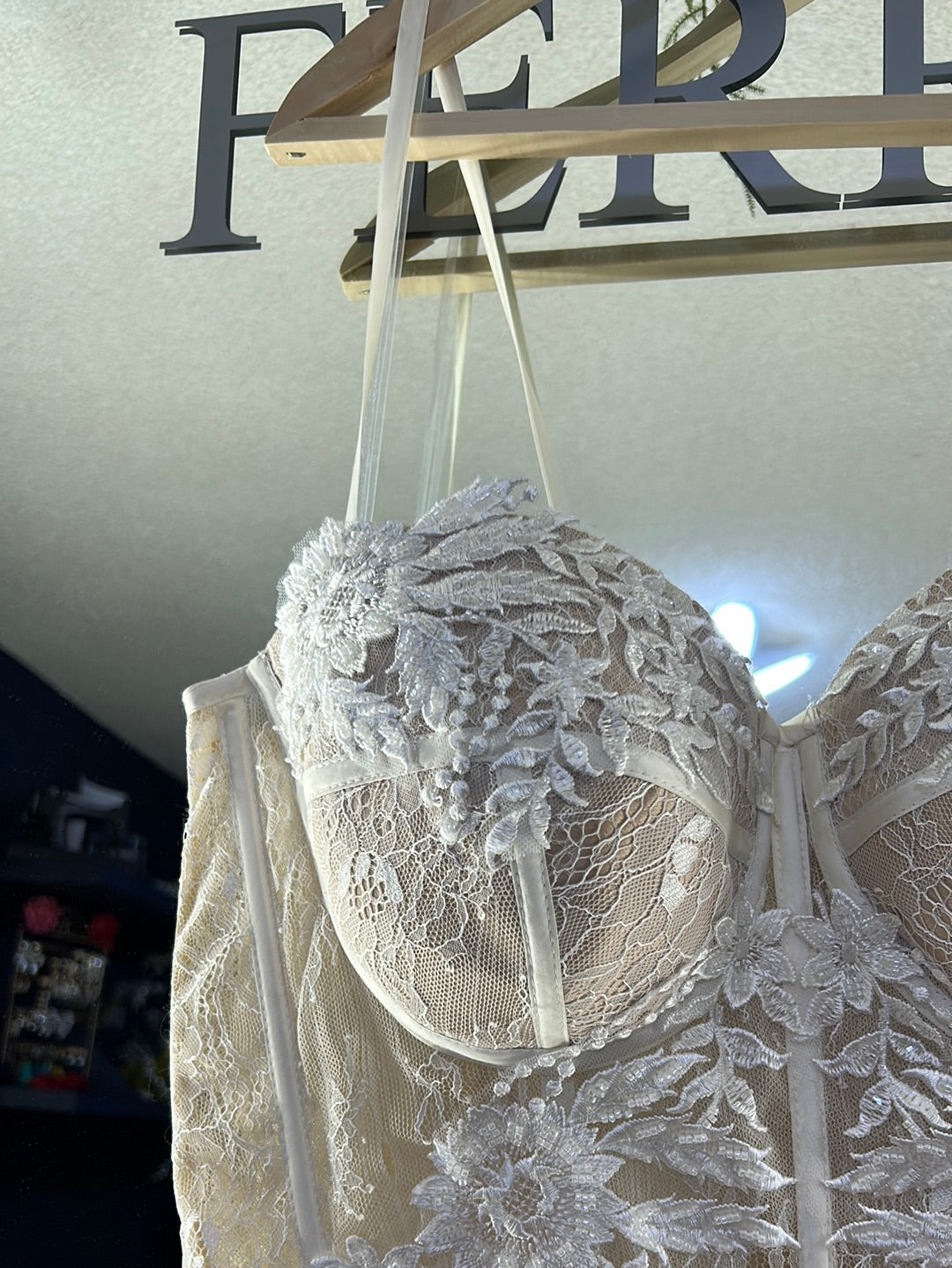 Falda crepé de seda, talle encaje, Chantilly, bordado de Yapur con pedrería y chaquira mini