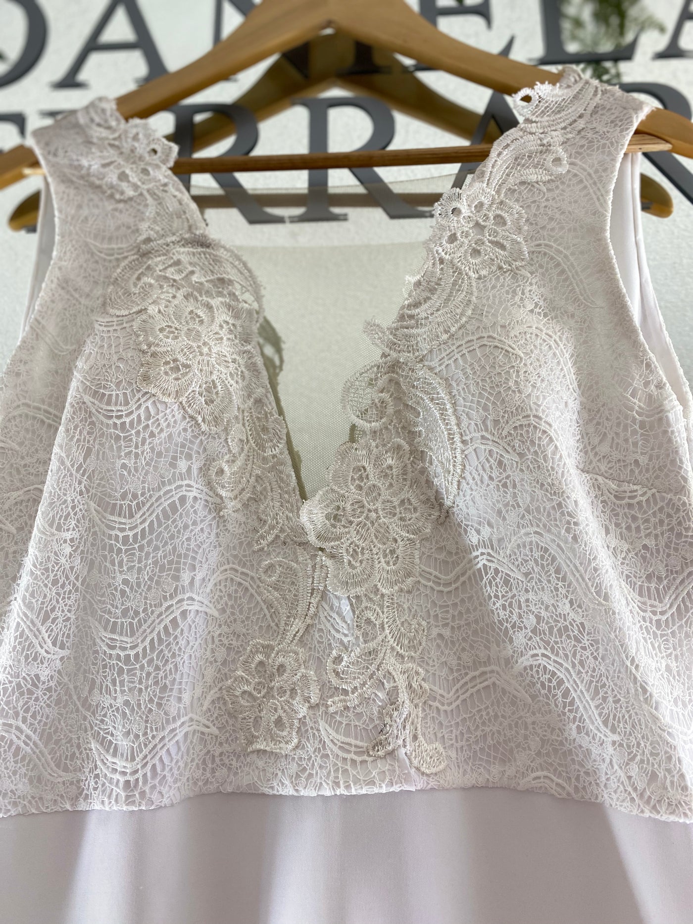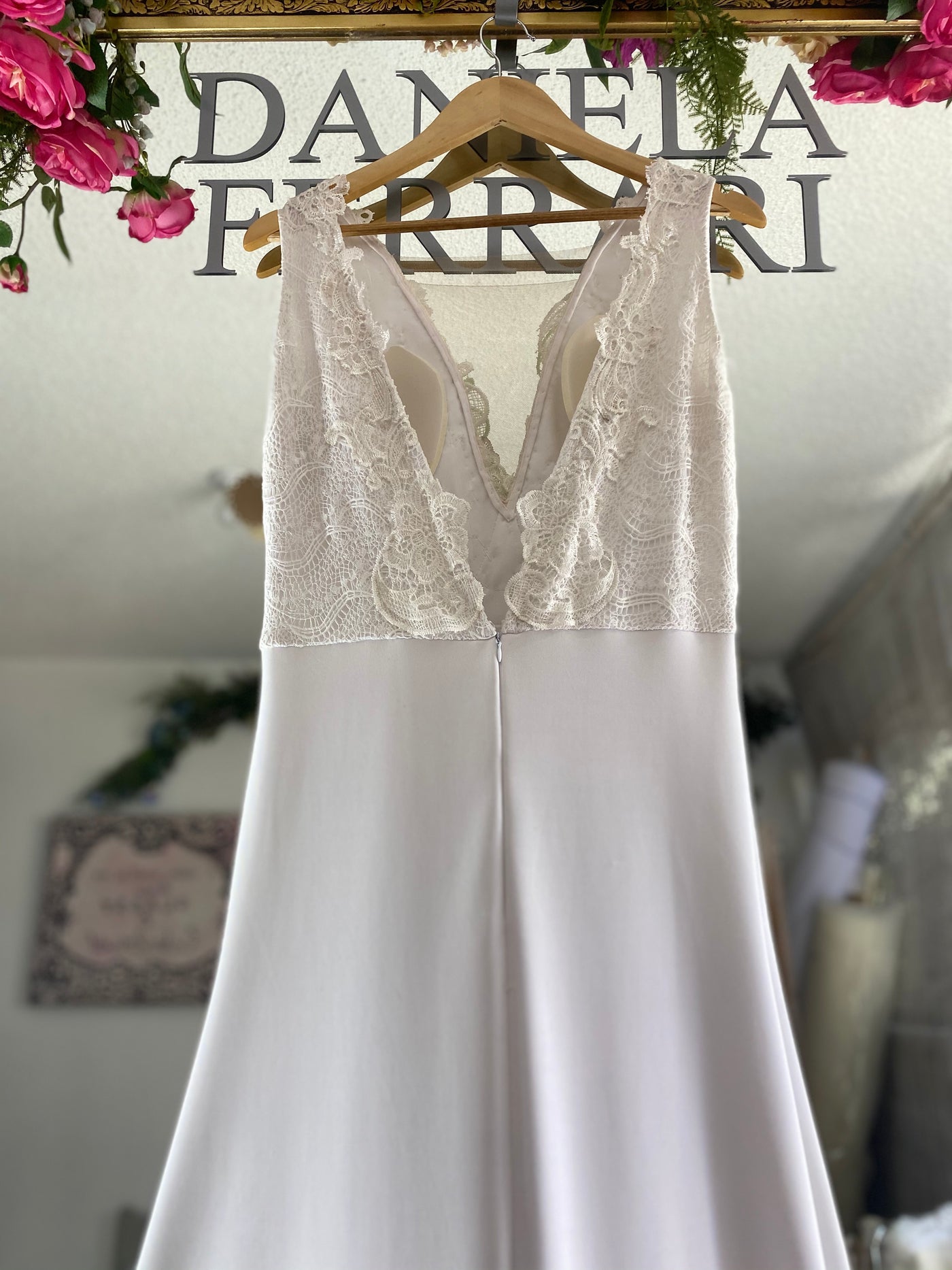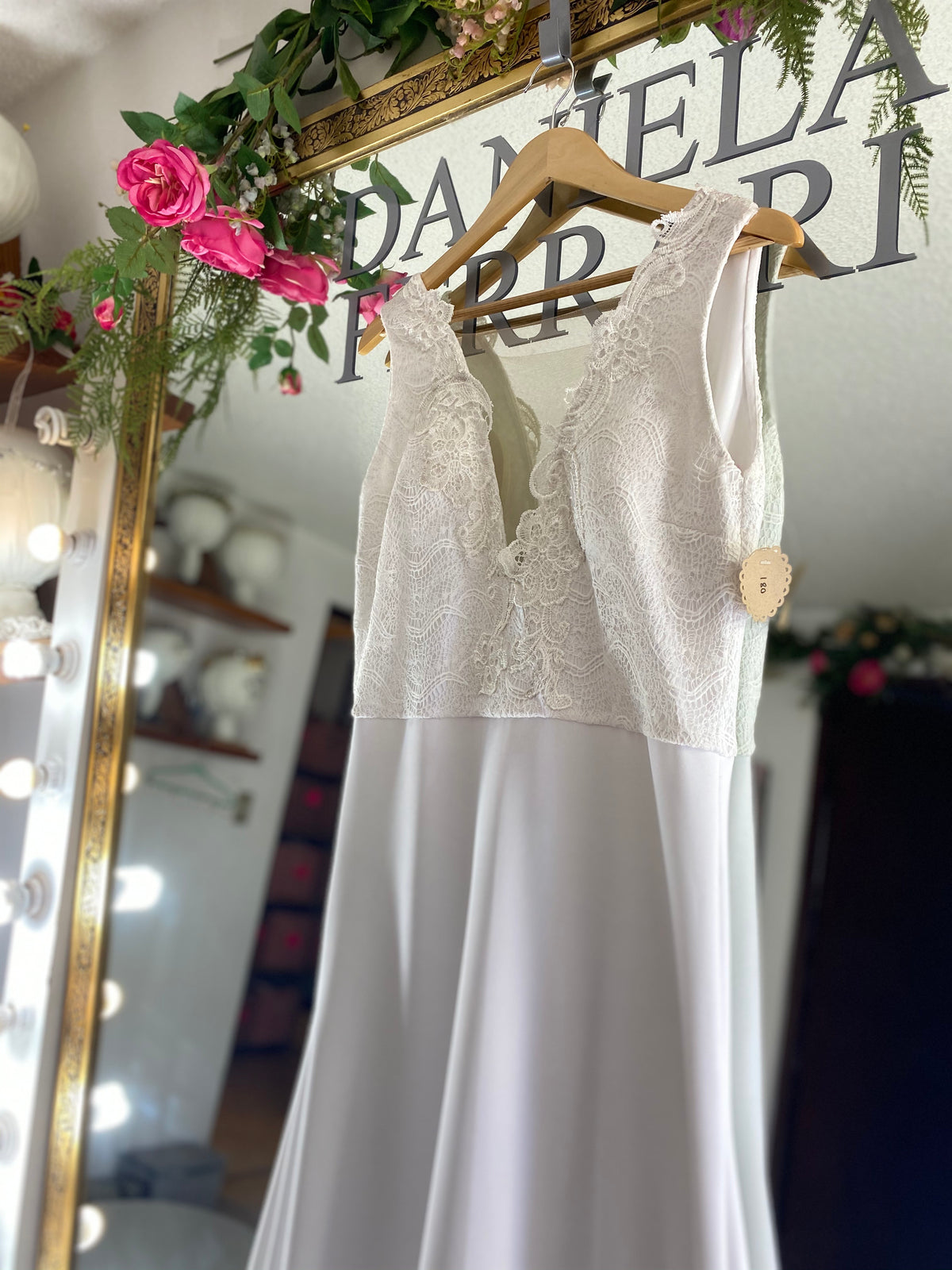 Este vestido lleva el cuerpo de neopreno con encaje francés de un diseño más moderno de olas y nudos. Detallado con bordado de guipiure en escotes. Ambos escotes en V. Cauda extra larga 😍