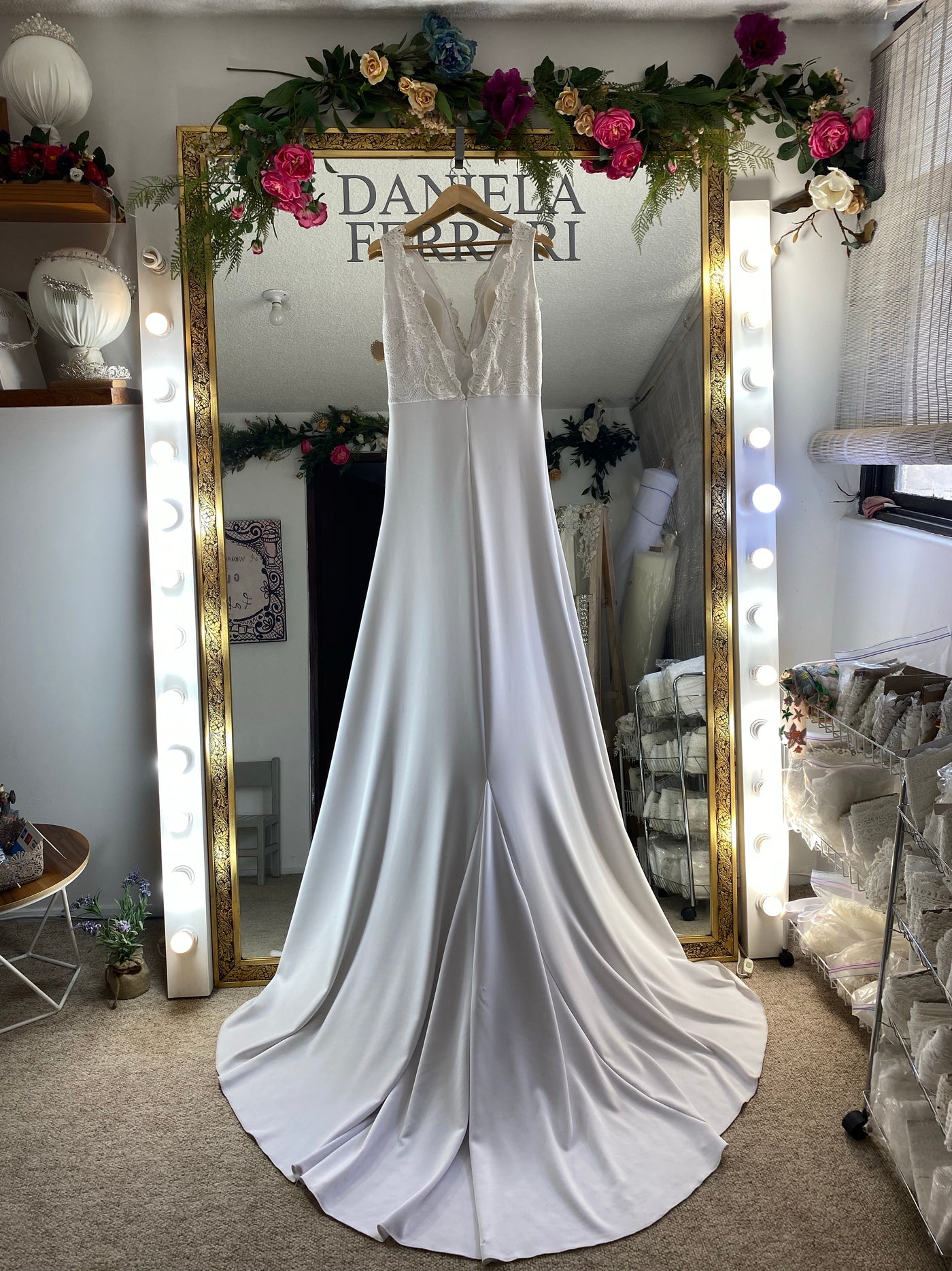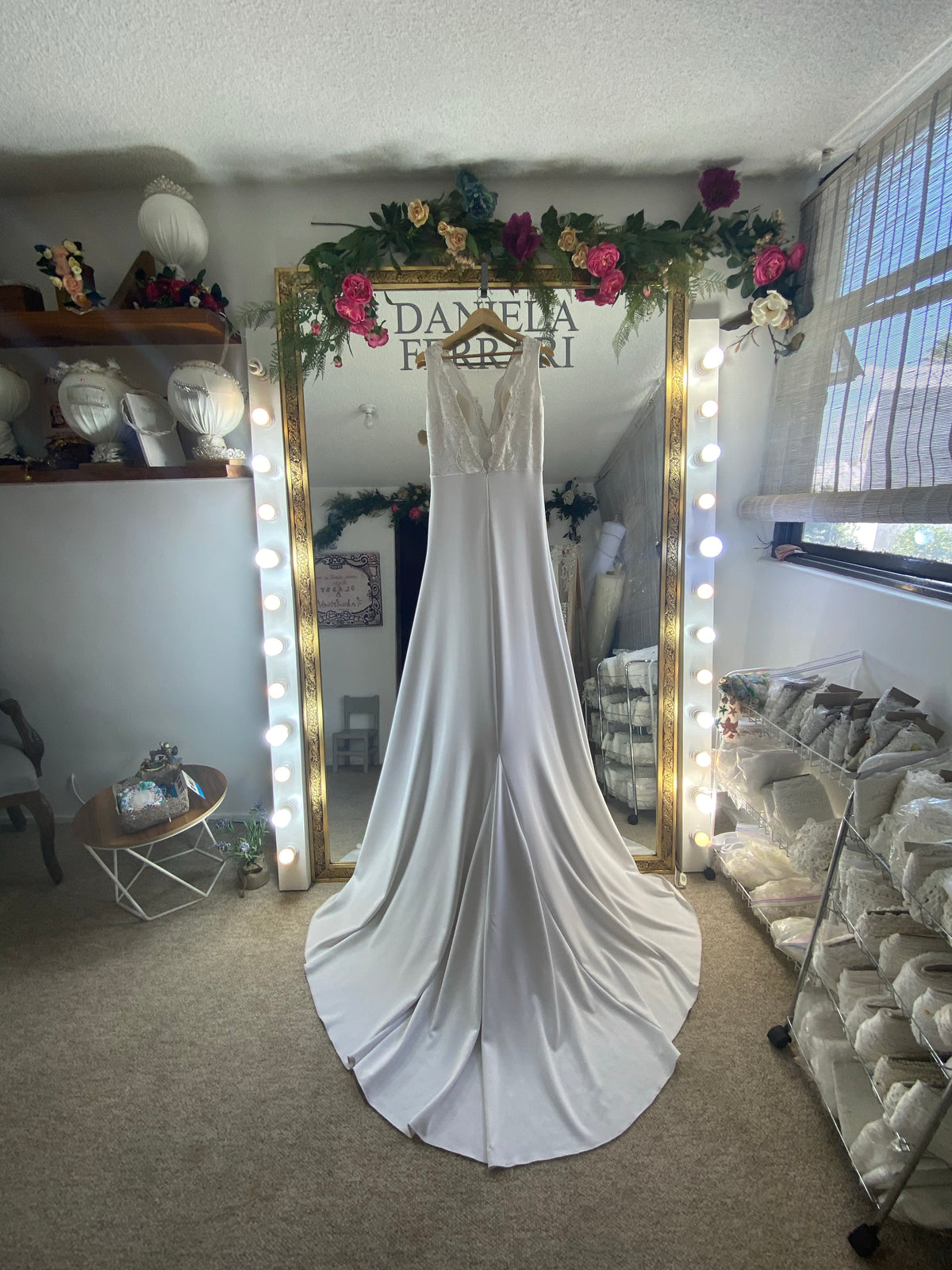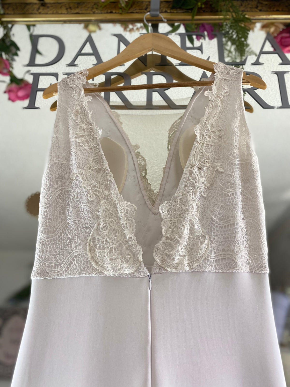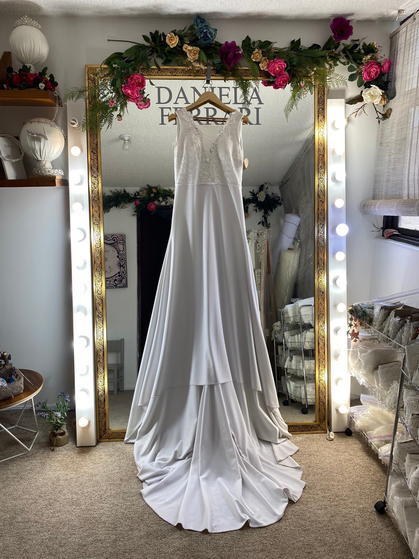 Este vestido lleva el cuerpo de neopreno con encaje francés de un diseño más moderno de olas y nudos. Detallado con bordado de guipiure en escotes. Ambos escotes en V. Cauda extra larga 😍