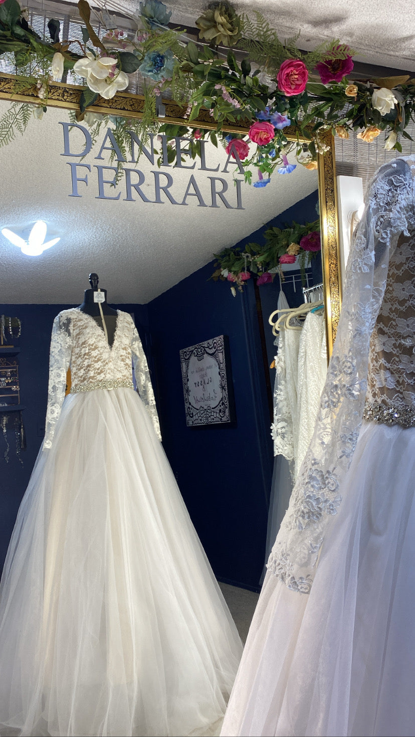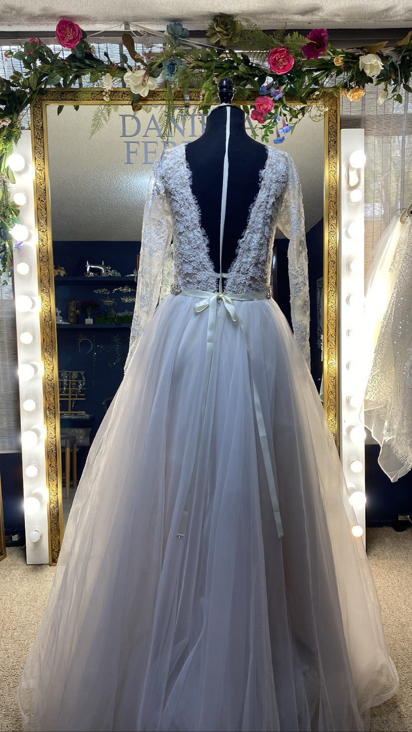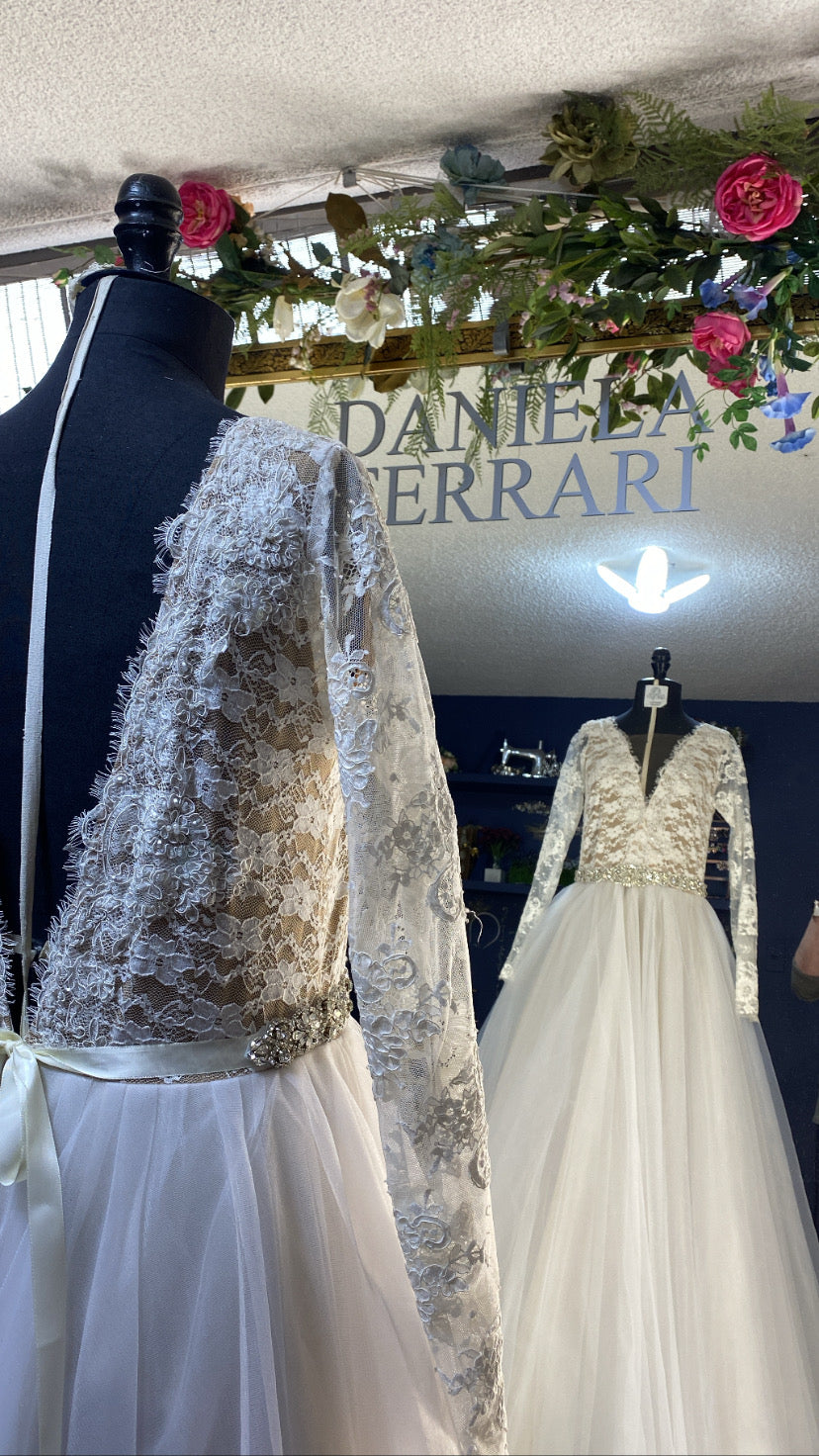 Este es de los vestidos que siempre vamos a Mar este es uno de los clásicos de DANIELA FERRARI y muchas novias han gozado este modelo en diferentes versiones la estructura de faja colombiana lo cual le da un estrecho para que se arme perfecta tu cuerpo tiene la espalda totalmente abierta en B delineado con Encaje Chantilly en una blonda con pedrería las mangas son de Chantilly pero en caso de que quisieras quitar las cortarlas es posible se termina el puño con la misma blonda del cuello la falda es de Tool italiano y te recomiendo en marcarlo con un cinturón de pedrería de la colección