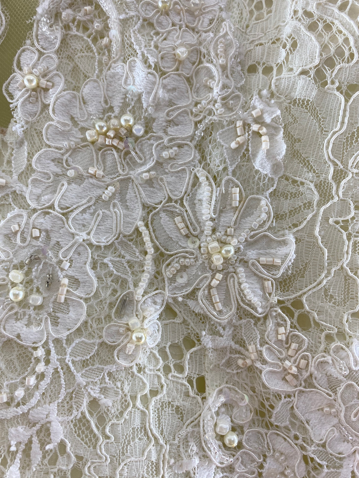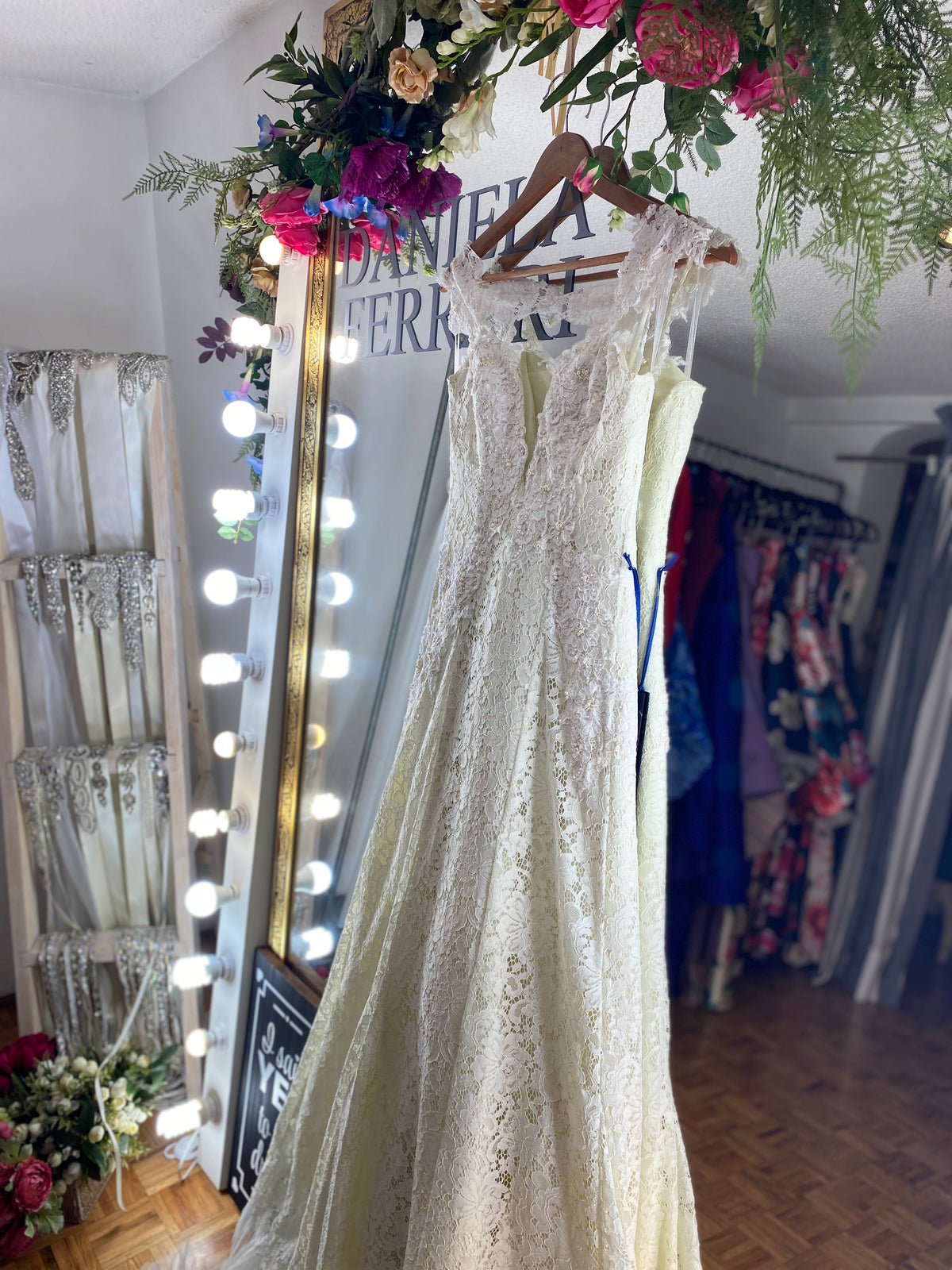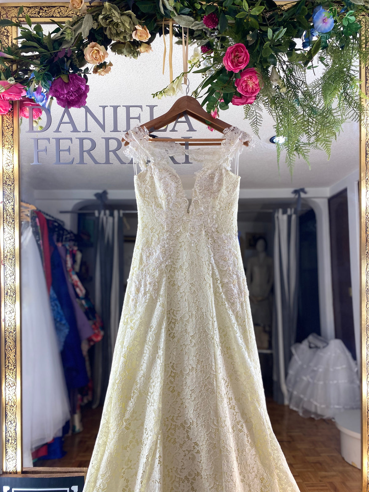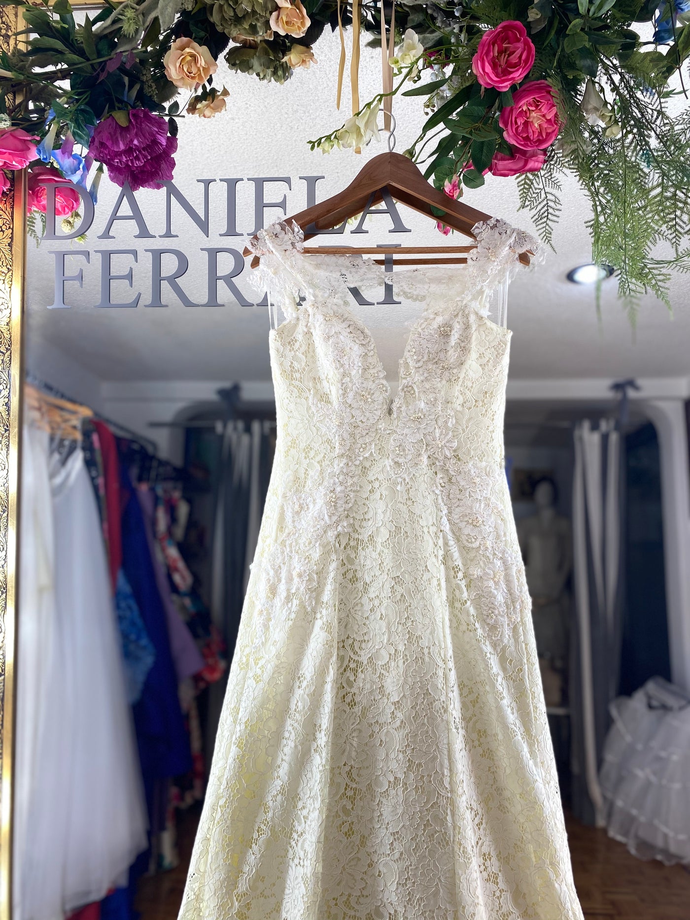 Clásico elegante y con un toque sexy! Encaje con soutage de piso a techo delineado con aplicaciones de encaje chantilly bordado a mano con pedrería suiza. Espalda diamante con encaje flotante y delineado con tulle. El corte es fit and flare para boho glam y si lo quieres más glam le ponemos una base de tulle para que se marque divina la falda 😍