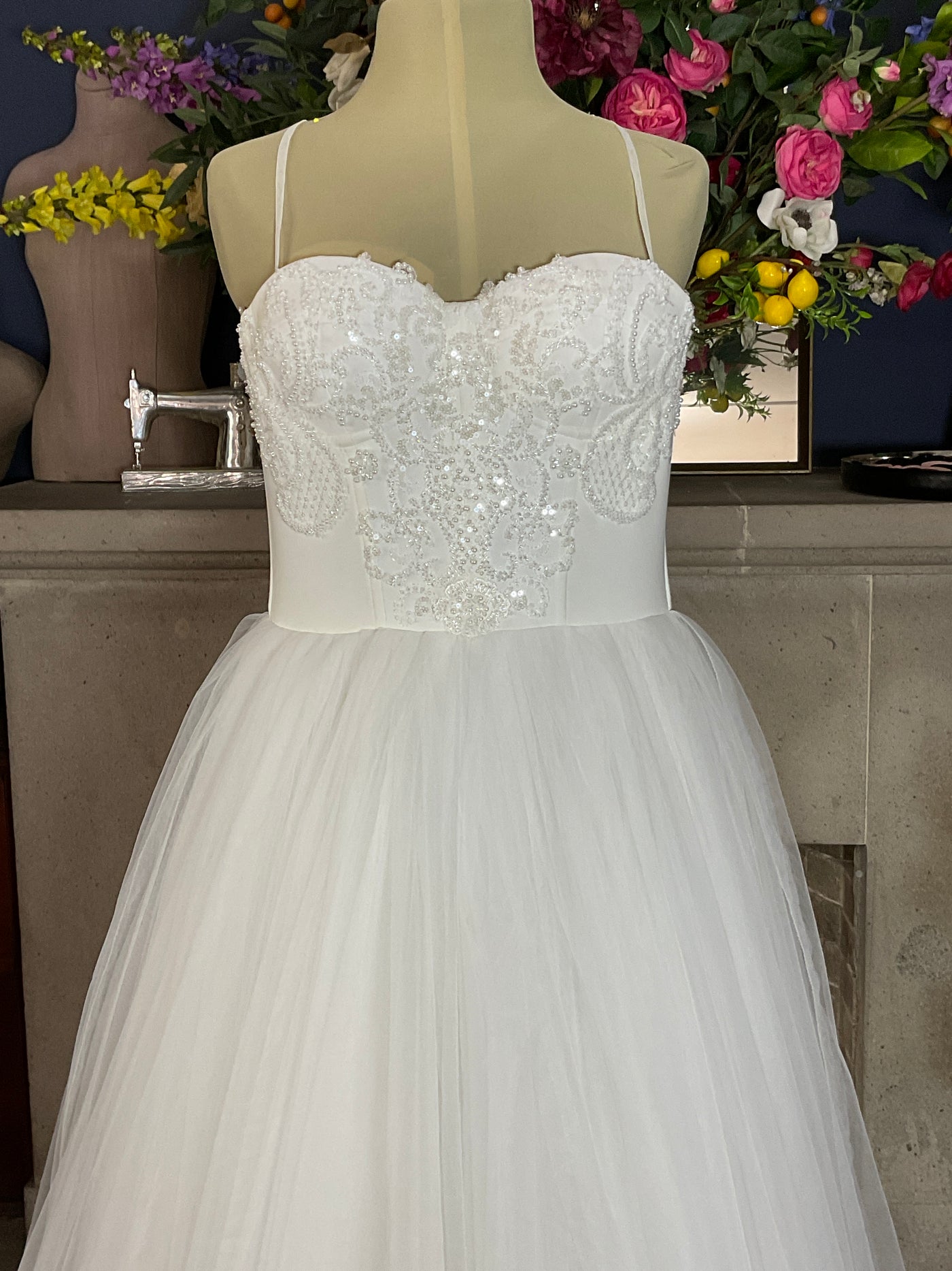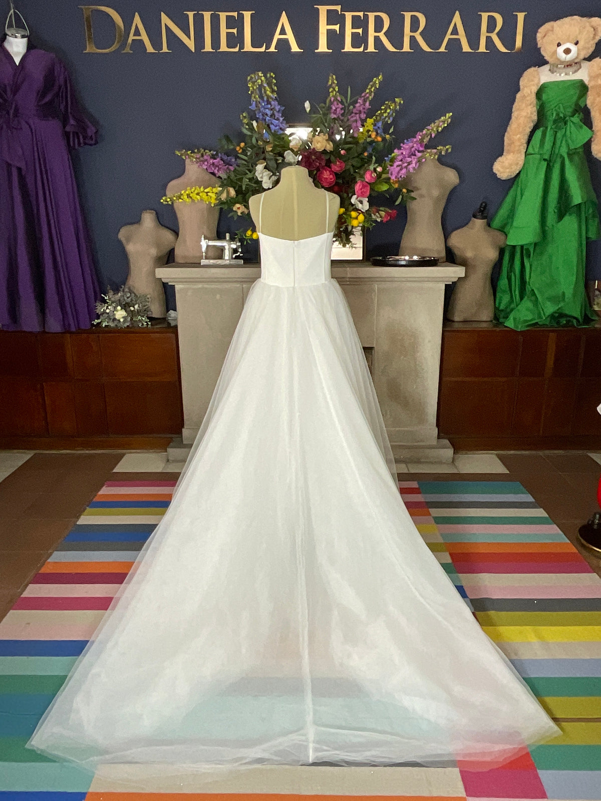 La falda en tul corte A de caída ligera envuelve la figura con volumen etéreo y movimiento natural. La cauda fluida y elegante completa el diseño con un acabado refinado y clásico.