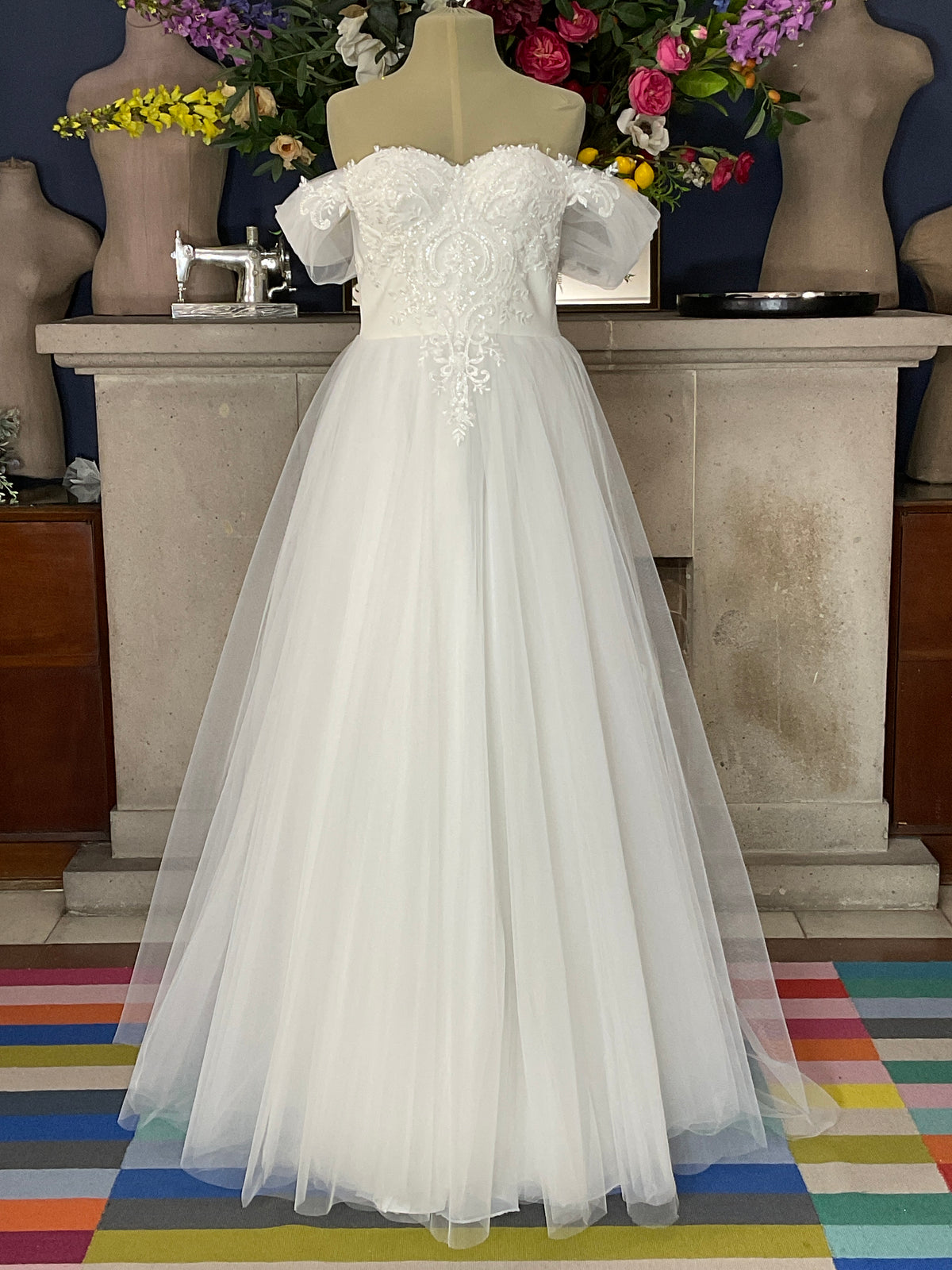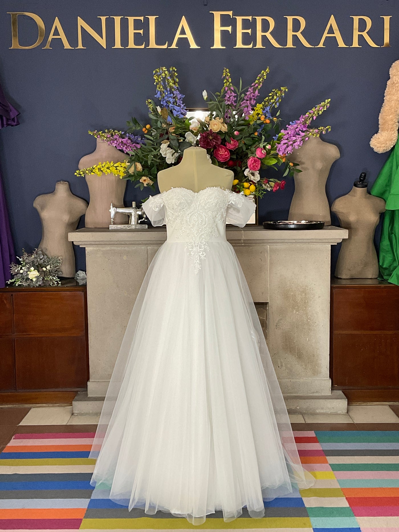 Su escote corazón con mangas caídas tipo off shoulder en tul suave aporta un aire delicado y sofisticado, enmarcando los hombros con sutileza. El corset está cuidadosamente trabajado con bordado floral ornamental y aplicaciones que estilizan el torso, logrando una silueta armoniosa y elegante.