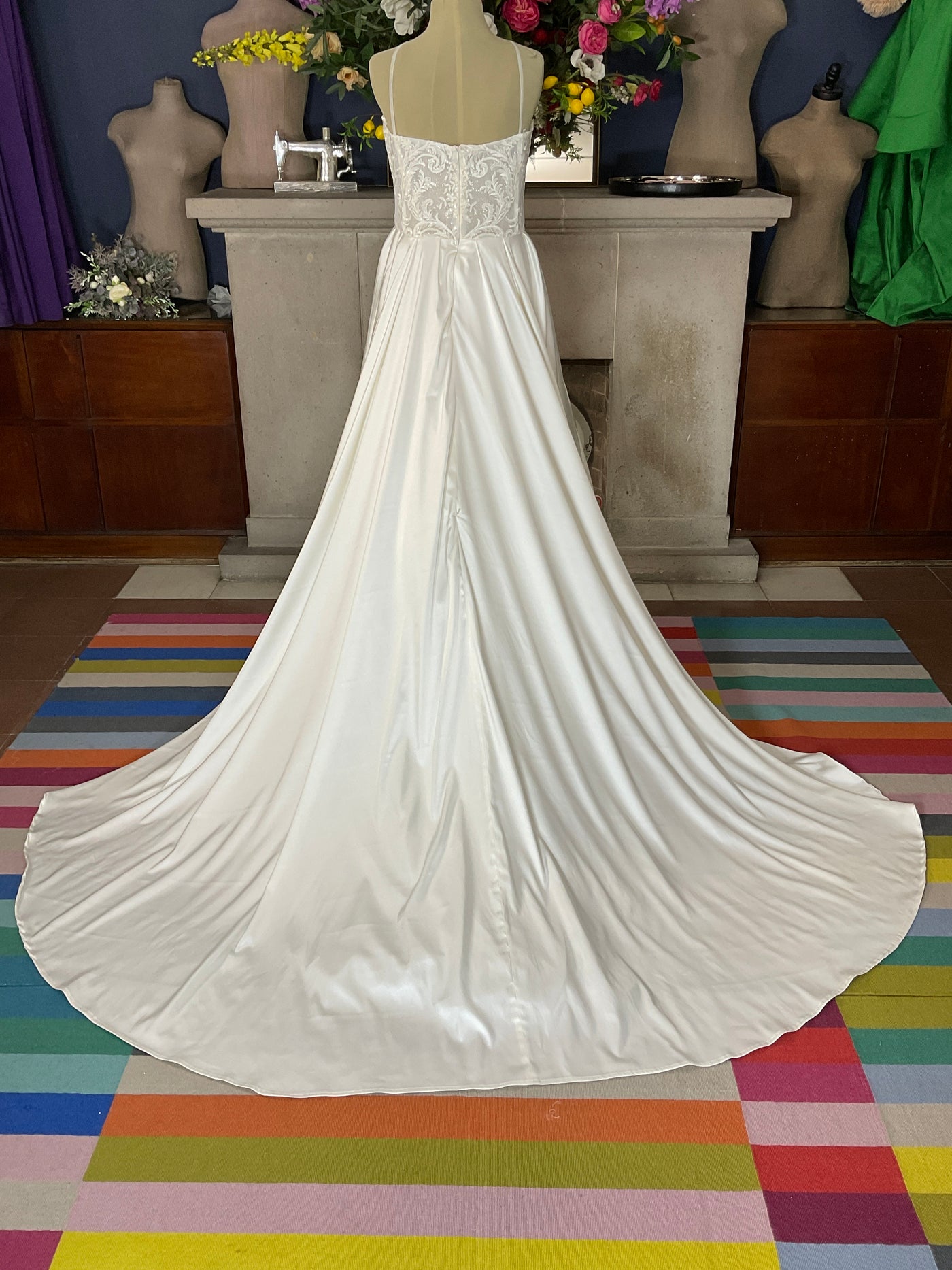 La falda en satén sedoso corte A cae con elegancia arquitectónica, creando movimiento limpio y refinado que culmina en una cauda amplia con caída natural y brillo suave. El contraste entre el cuerpo trabajado y la falda minimalista genera una estética clásica con carácter contemporáneo.