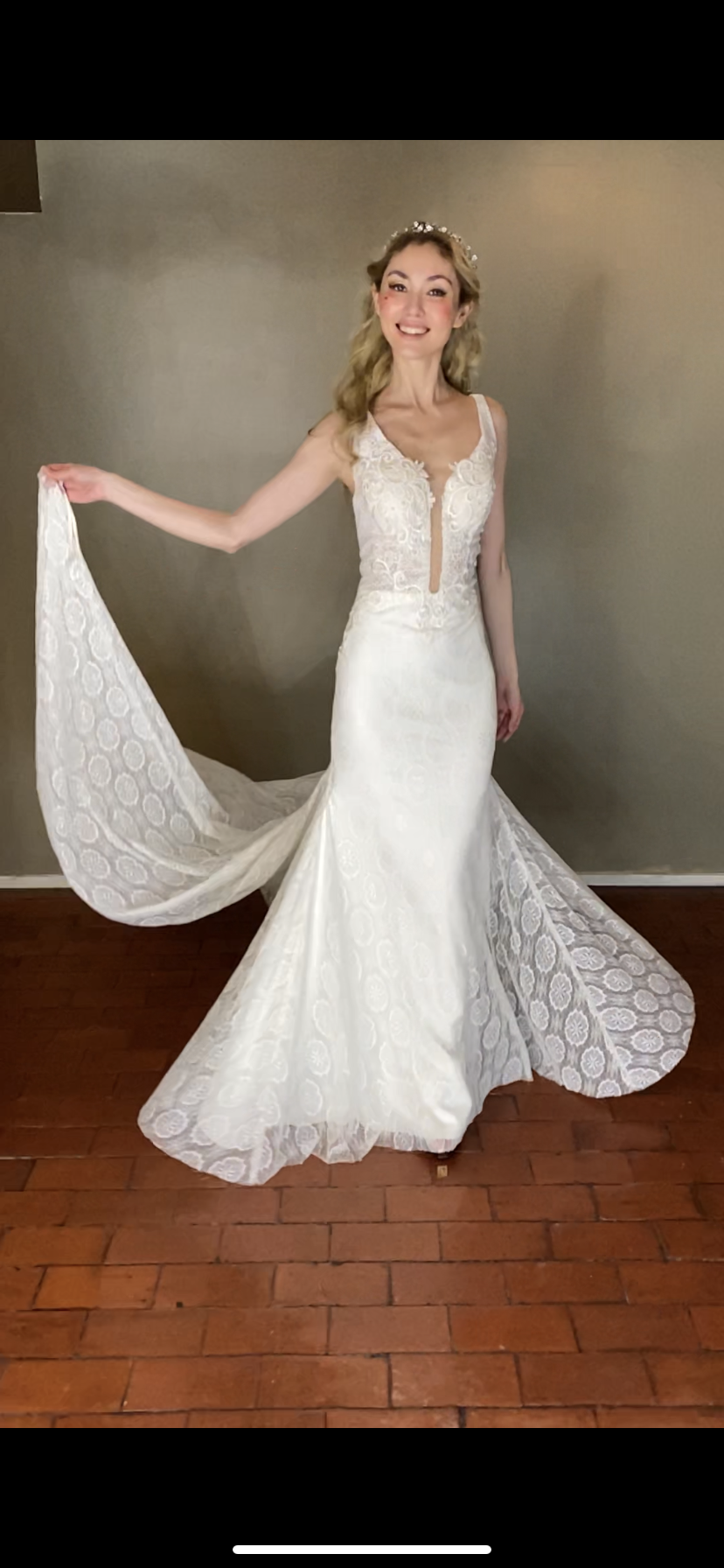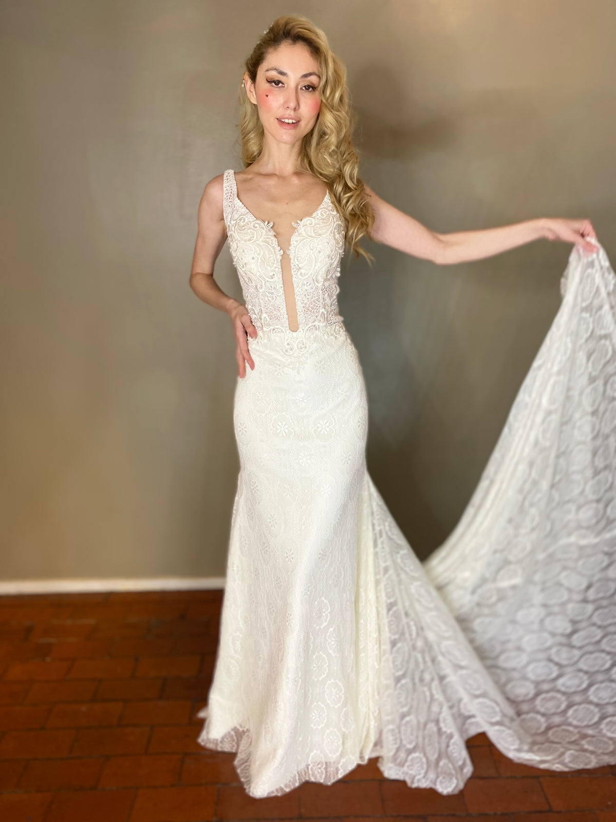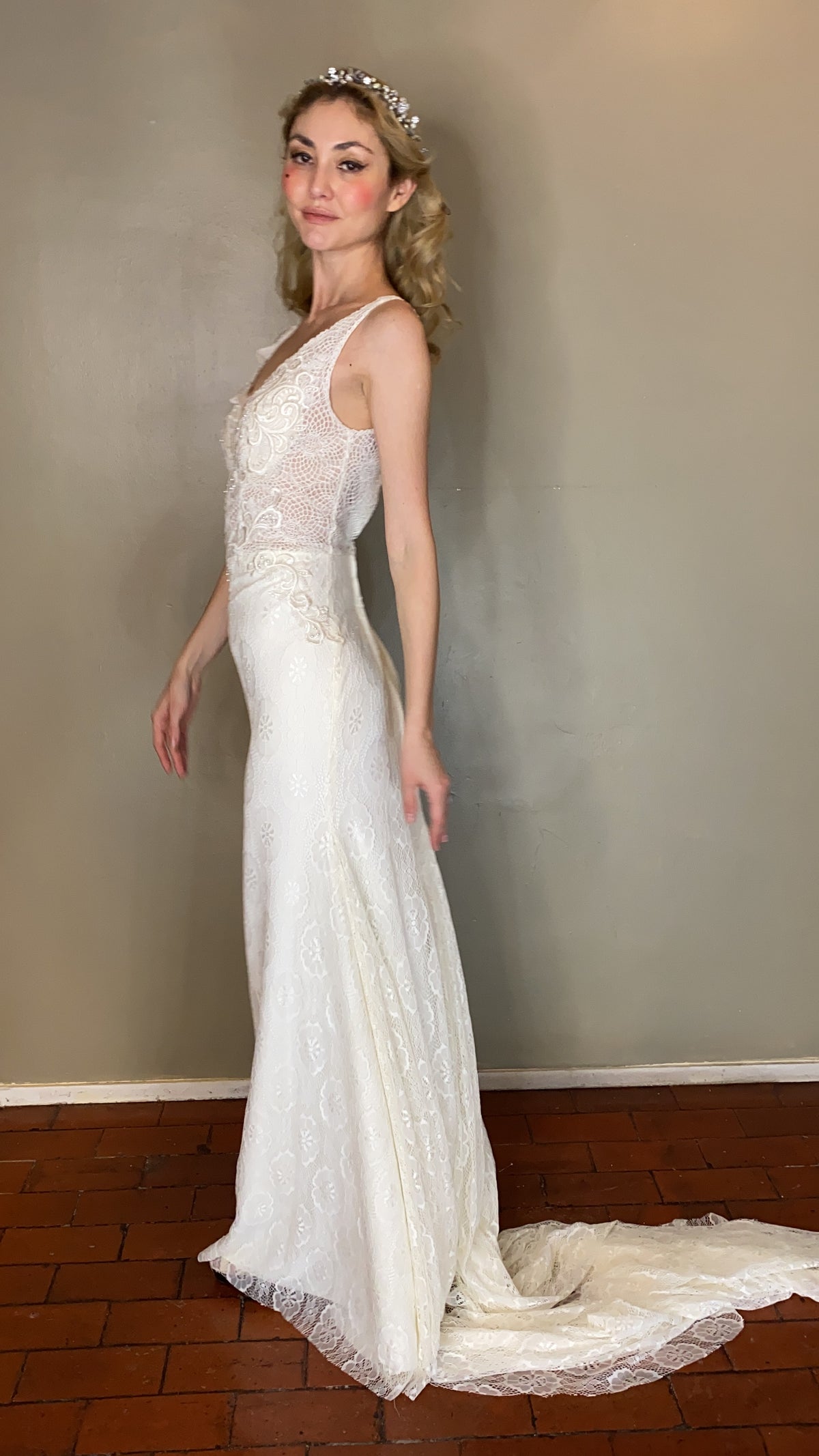 Talle de encaje español de algodón detallado con sutúrate de algodón suave y ligero que es ideal para almas libres. Re bordado con encaje arabescatto con detalles de perlas de cristal. Escote bajo y muy sexy en V baja. Corte a la cintura y sale en una falda FIT AND FLARE que le da una forma espectacular y al caminar un flow divino!