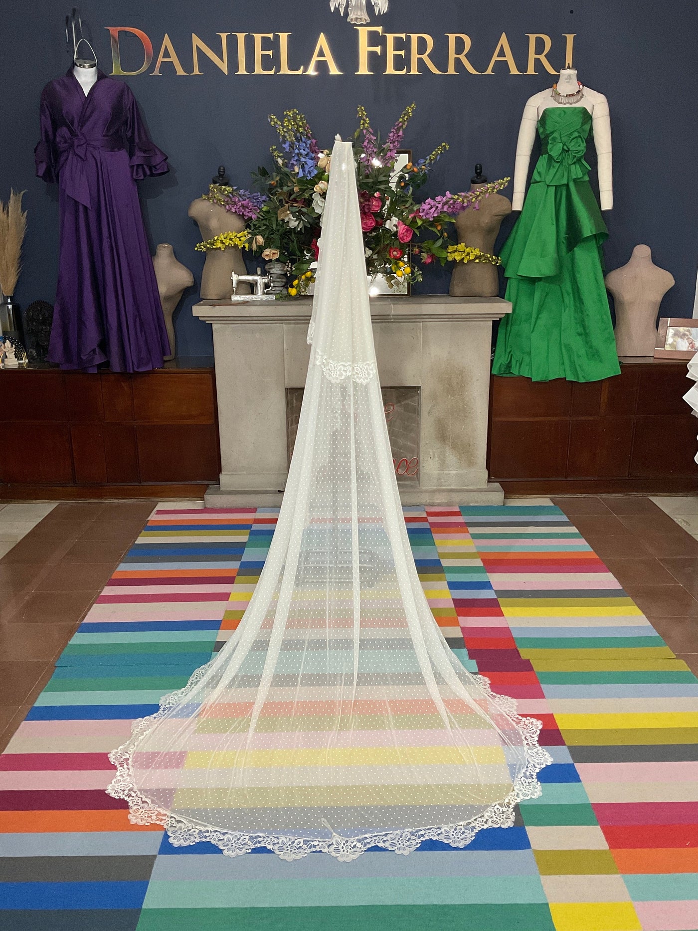 Totalmente hecho a mano, este velo artesanal se puede personalizar en largo y en tipo de encaje según tus preferencias, garantizando un diseño único y adaptado a cada novia. Perfecto para complementar vestidos lisos o de estilo vintage, su caída suave realza la silueta sin opacar el vestido. Ya sea como velo vintage para novia o como un elegante velo para vestido de novia romántico, este velo con motas para boda añade un toque de distinción clásico y romántico a tu gran días. V