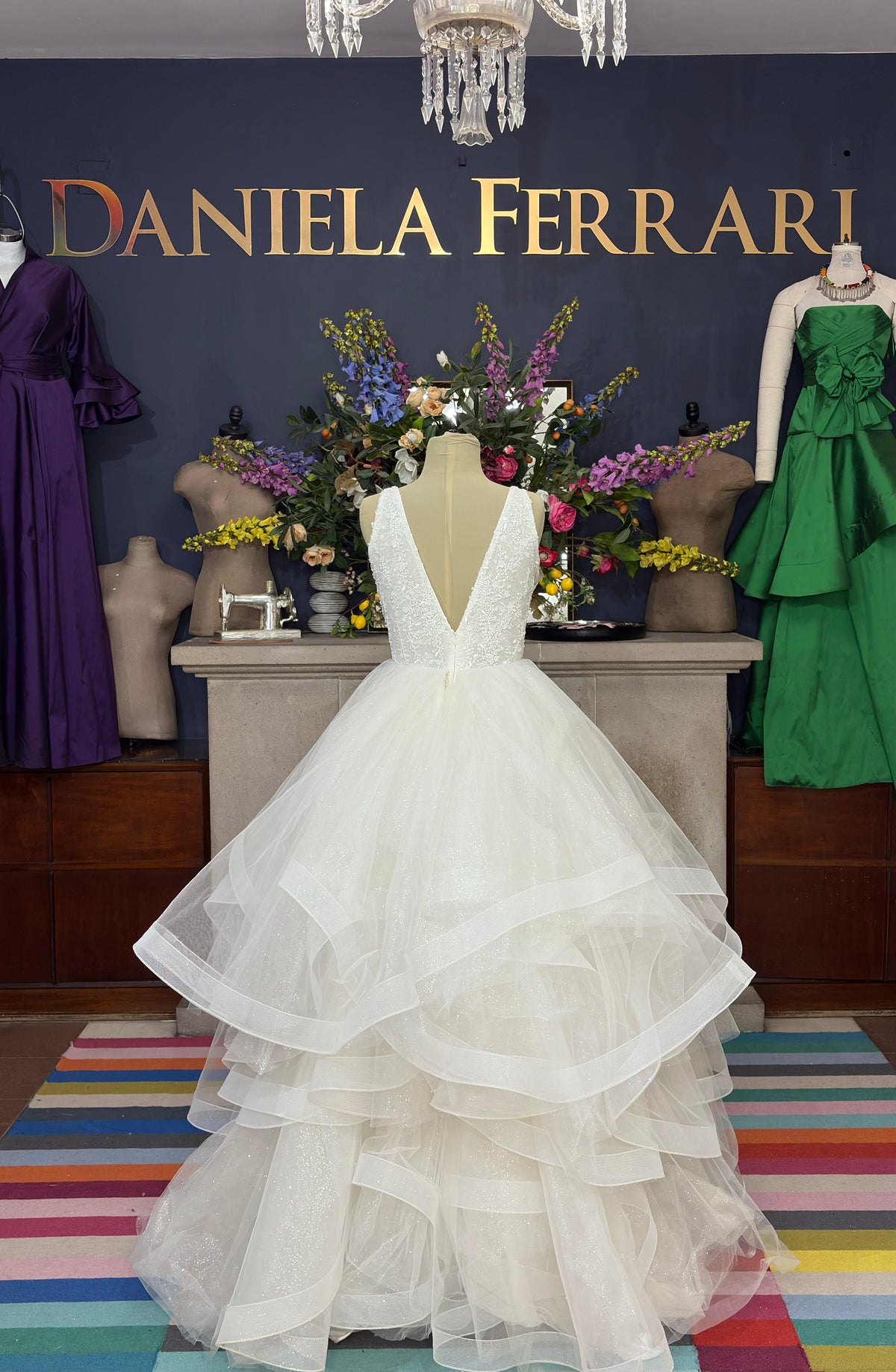 La falda voluminosa en capas de tul glitter crea un efecto de ensueño al caminar, perfecta para bodas de noche, escenarios de cuento o celebraciones donde la novia es el centro de toda mirada. Cada capa fue diseñada para brindar movimiento y ligereza sin perder estructura ni sofisticación.✨