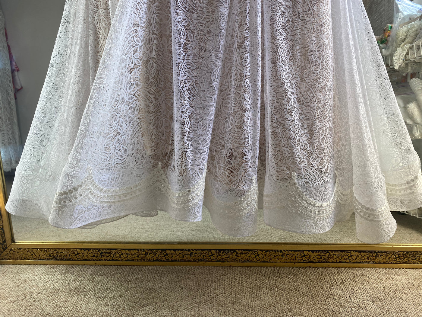 el encaje es un encaje suavizado con un dibujo muy lindo y sutil de repetición cerrada . Tiene la flor clásica de los encajes franceses en mini.