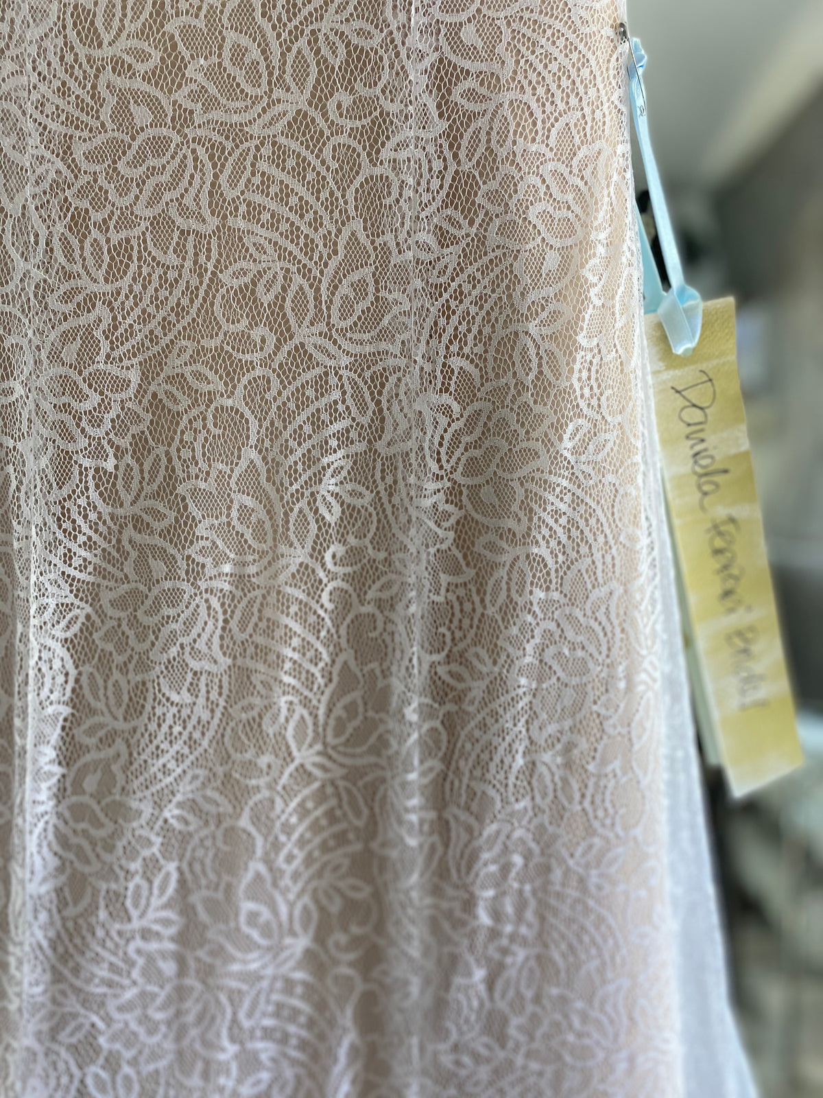 Encaje francés de Chantilly en el talle con mangas y terminación de blonda.